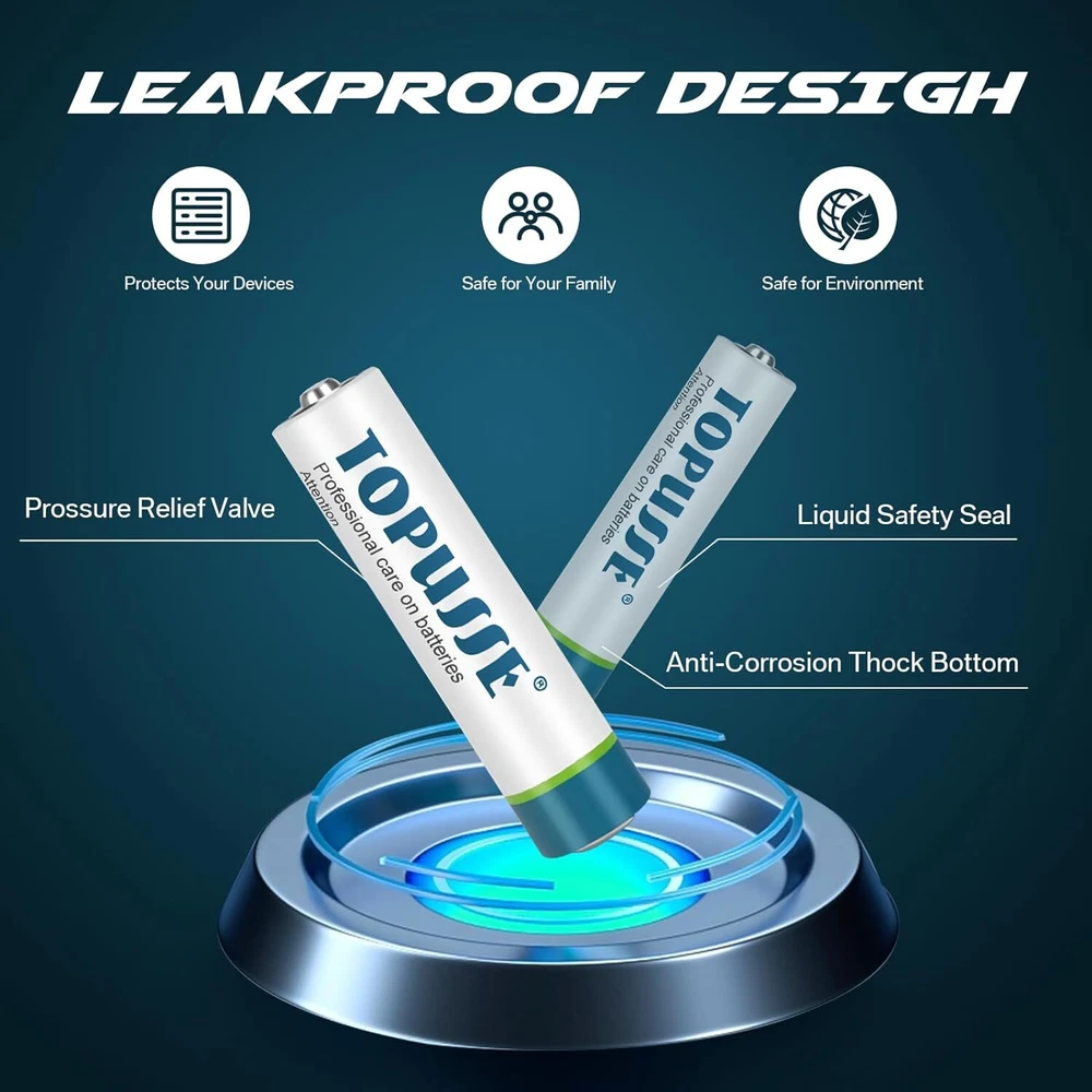 ✅【Long LASTING POWER】Topusse ultra alkaline batteries deliver long lasting power and performance,that is consistent and reliable for everyday use and emergency situations ✅【10-YEAR SHELF LIFE】 All alkaline batteries are always fresh and maintain power with an impressive ten-year shelf life in proper storage, Providing power in everything from emergency situations to playtime ✅【LEAKPROOF DESIGN】AAA batteries are designed with a double layer internal structure housed within a stainless steel cover so that they are 100% leakproof. Avoid short circuits, mixing and matching old batteries with new ones. ✅【ENVIRONMENTALLY CONSIDEREDE】Our 1.5-volt alkline batteries contain no mercury or cadmium, making them a smart choice for your family and for the environment. ✅【IDEAL FOR EVERYDAY USE】These batteries are compatible with all devices that require 1.5V AAA batteries for daily household devices such as game controllers, remote controls, and children's toys, and so on. Topusse alkaline aaa batteries are great to have on hand for a variety of everyday household devices, including clocks, remote controls, game controllers, digital cameras, toys and more. batteries won't leak and are designed to last ten years in storage. The 1.5-volt batteries contain no mercury or cadmium, making them a smart choice for your family and for the environment. our mission is to provide trusted and dependable power for everyday needs