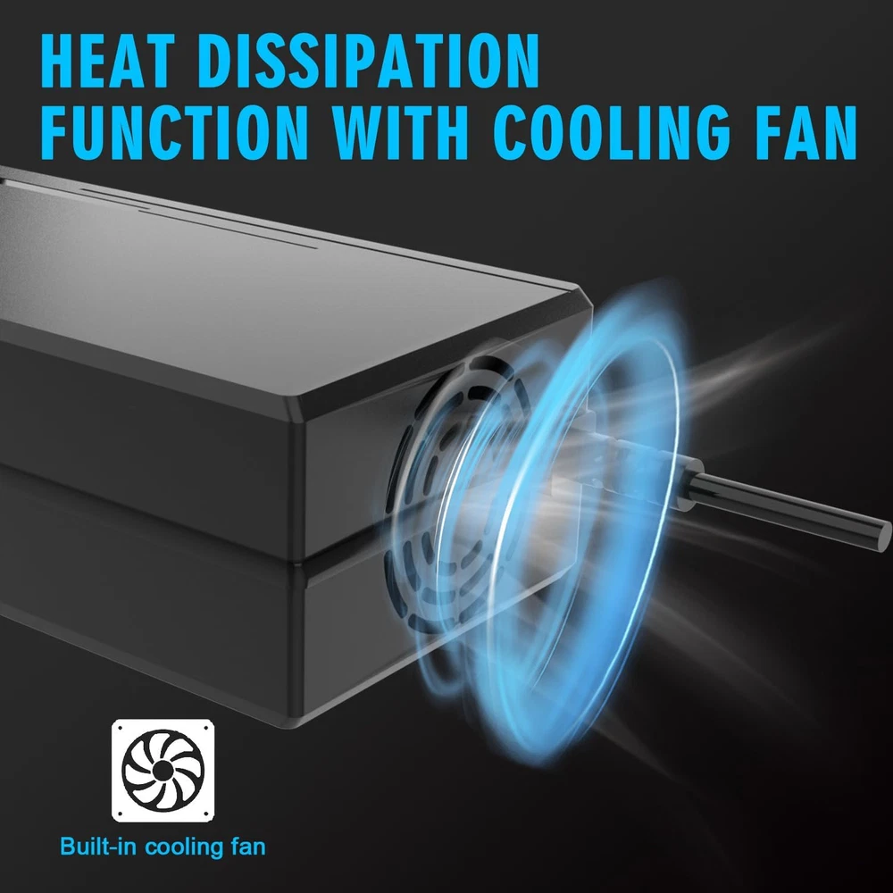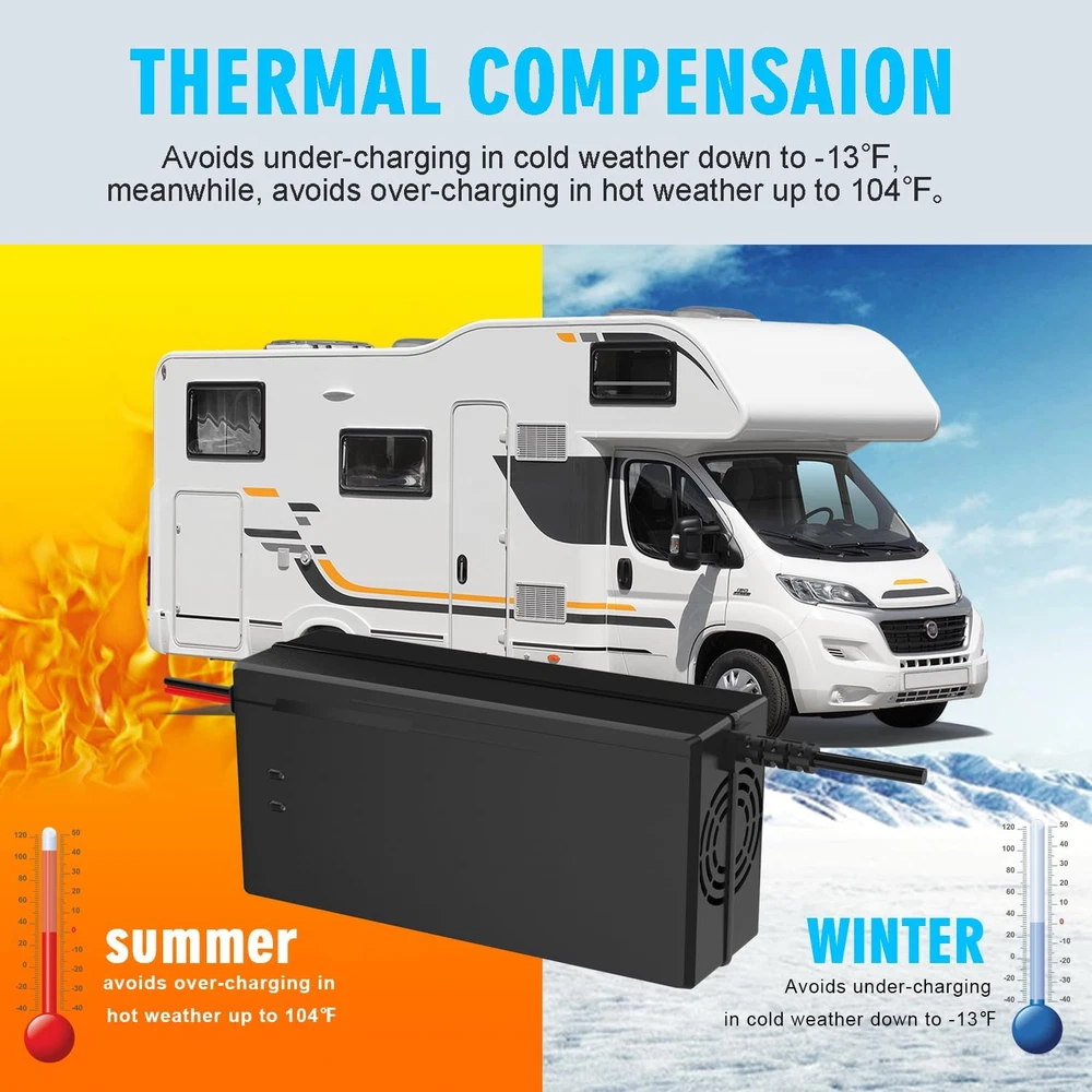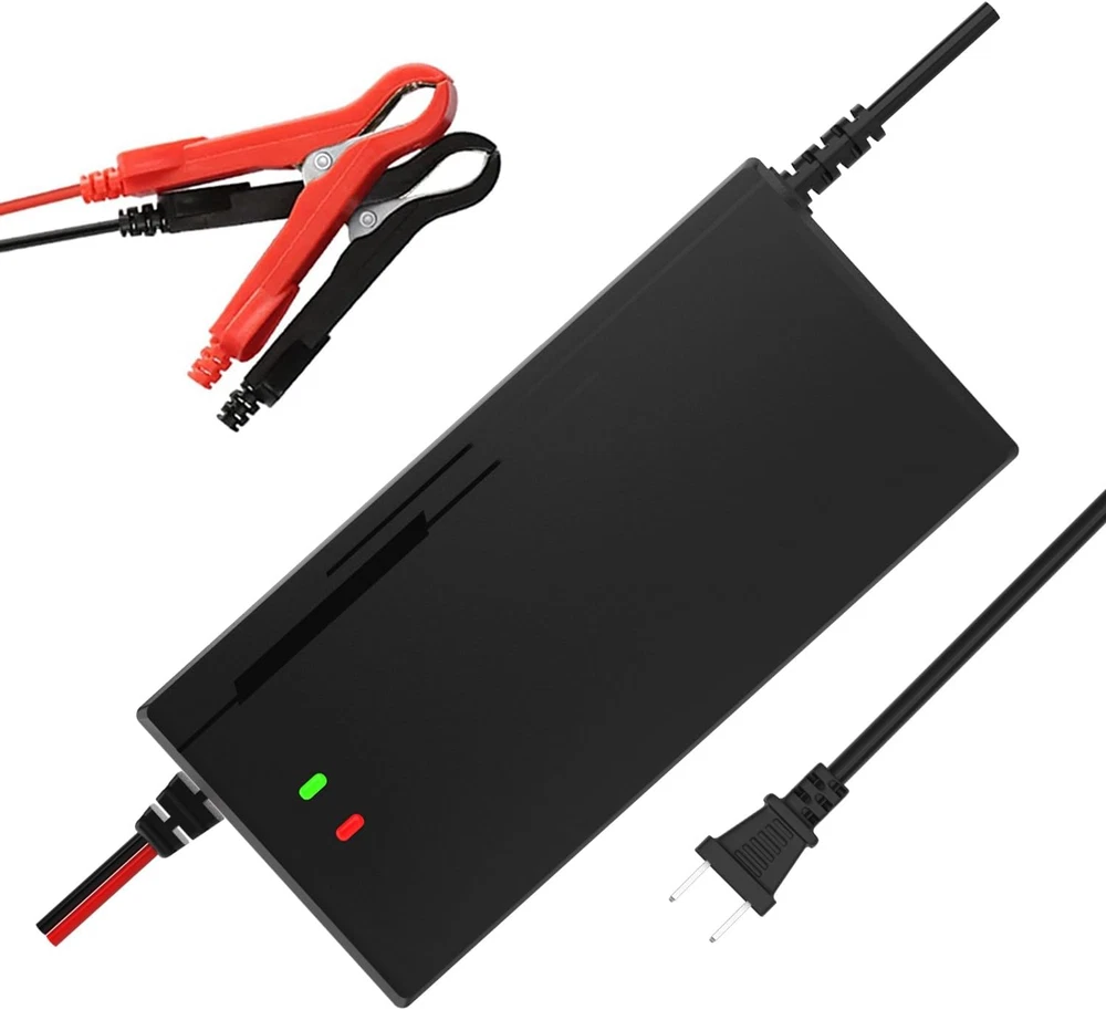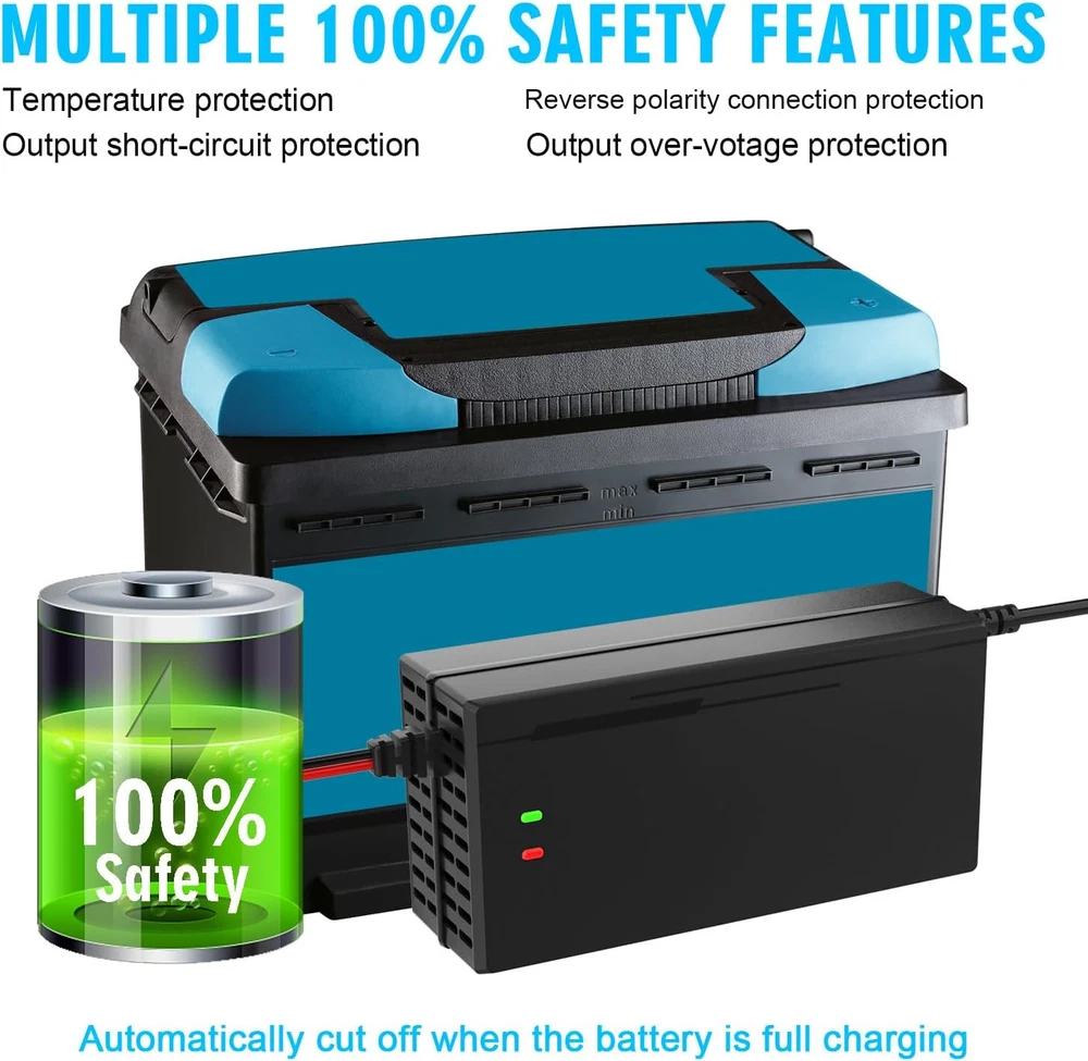 36 VOLT BATTERY CHARGER Widely Used: Ideal for 36 Volts Rechargeable Deep Cycle LifePo4 Lithium Iron Phosphate Batteries. Providing max 8 amps charging current quickly fill your golf cart, ultra-high power, deep cycle battery charging, do not damage the battery. Suitable for Golf Cart, cars, trucks, marine, agricultural vehicles, ships, motorboats Lawn,Mower, Boat, SUV etc.… Protection and Maintenance for 36V Lithium Battery: Fast intelligent charger, Multilevel Protections guard against Over voltage protection, Software over voltage protection, over-temperature protection, short circuit protection, current limiting protection and reverse polarity protection with Cooling system,refractory material, safe and reliable. Safe and Secure - Automatic Shutdown when fully charging. Smart and Efficiently 43.8V Lifepo4 smart charger: It is implemented the special 2-stage constant current/constant voltage (CC/CV/Cut off) charge algorithm. This charger protects your LiFePO4 battery's delicate structure by boosting charging efficiency and maximizing lifespan through its careful utilization of the CC/CV algorithm regardless if the battery has a BMS or not.【2 LED indicator light】When charging,LED 1 Red Power on, LED 2 Red charging/Green full charged Golf Cart 36V Battery Charger-Optimized for Any Climate: More precise charging in hot and cold climates because of our new integrated thermal sensor. Avoids under-charging in cold weather down to -13℉, meanwhile, avoids over-charging in hot weather up to 104℉。Automatically and intelligently adjust charging current to prolong battery life. Durable Quality and Cooling System: The durable shell and cooling fan allow the charger's exterior to function as a heat sink with over-heating protection. In the test, it makes more than 30,000 POH(power on hours).To recharge and maintain Lithium-Ion Phosphate (LiFePO4) batteries — maximizing their performance and lifespan, we suggest using a dedicated lifepo4 battery charger to ensure you get the best out of your Lifepo4 Lithium batteries. Product Description
