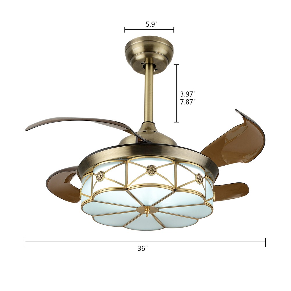 Light Source: LED lighting board (Included) Shade Material:Copper glass Blade Material: ABS ❤ invisible fan chandelier: Fan and chandelier combined into one with remote control, automatic telescopic fan blade, LED lamp beads ❤ Ceiling fan with remote: LED lights have 3 color changes (White-Warm-Yellow), Fan has 3 speed settings (Low-Mid-High). All these functions can be easily controlled by remote ❤ Fan Light Chandelier: 36 inches when the fan is extended, Includes two lower bars, one for 3.97 inches and the other for 7.87 inches, you can choose one to install ❤ Bedroom Ceiling Fans Material: metal body + Copper glass lamp cover + ABS retractable blades + pure copper motor(providing powerful air flow, quiet and durable. With vents, it can reduce the internal temperature of the main unit 💚💚💚 Welcome to Freetrade-shop 💚💚💚 Light Source: LED lighting board (Included) Shade Material:Copper glass Blade Material: ABS ❤ invisible fan chandelier: Fan and chandelier combined into one with remote control, automatic telescopic fan blade, LED lamp beads ❤ Ceiling fan with remote: LED lights have 3 color changes (White-Warm-Yellow), Fan has 3 speed settings (Low-Mid-High). All these functions can be easily controlled by remote ❤ Fan Light Chandelier: 36 inches when the fan is extended, Includes two lower bars, one for 3.97 inches and the other for 7.87 inches, you can choose one to install ❤ Bedroom Ceiling Fans Material: metal body + Copper glass lamp cover + ABS retractable blades + pure copper motor(providing powerful air flow, quiet and durable. With vents, it can reduce the internal temperature of the main unit and extend the life of the motor.) Ceiling Fan with LED Light: Replaceable LED light will last a longtime and save you the most on your energy bills. Ceiling Fan with Remote Control: Control the light and fan speed separately for ease and convenience. Color temperature: CCT 3 color changes(3 light cycles) Light source type: LED(Light Kit Included) Control: Remote Control Included Dimensions: 36 Inch, 4 Retractable Blades Light Wattage: 36W Motor Wattage: 56W Speed: 3 Voltage: 110 -120 Volts Installation Instructions: Ceiling Chandelier Suitable for Flat Roof Concrete Ceiling House, for Gypsum Board and Wood Ceiling, You Need to Buy a Remodeling Bracket; Identify and Connect Electrical Wires; Ceiling height is greater than 110", Lift 110 Pounds. What you get: Retractable ceiling fan x 1 Screws sets x 1 Down rods x 2 (10CM & 20CM) Remote control x 1 Instruction Manual x 1 Payment Delivery details Terms of sales About us Contact us Payment We accept ebay payment 。 Fees such as import duties, taxes are not included in the item price or shipping costs. These charges are the buyer's responsibility. Delivery details Shipping: 2-9 working days to: USA Terms of sales We maintain high standards of excellence and strive for hundred percent customer satisfaction. Feedback is very important to us. We hope that you contact us immediately before you give neutral or negative feedback, so that we can address your concerns. It is impossible to address issues if we do not know about them! About us Your satis faction is our ultimate goal. We work hard to earn your trust and future business. Our certified technicians have tested each item before shipping. The unit comes with 1 year limited warranty on all manufacturing defects. a) If you receive a defective item, you may return it or ask for a discount. Please contact us within 14 days after you receive the package. b) What you returned must be intact and in its original packaging as re? u. Customer is responsible for shipping costs of the returned item. c) We will cover the cost of shipping back t with the shipping rate indicated in the registration page. We will send you a new unit or refund the full payment you paid. Thank you. Contact us Business Hour Business Hour: Monday To Friday: 8:30 AM to 5:00 PM (Beijing China time) Due to time zones, our reply to your questions may not be immediately. But within above working time, we will reply your email within 24 hours. If it's non-workdays, please kindly be patient and wait till Monday. Please contact us with ebay message. Please feel free to contact us if you have any questions. Monday To Friday: 8:30 AM to 5:00 PM (Beijing China time) Due to time zones, our reply to your questions may not be immediately. But within above working time, we will reply your email within 24 hours. If it's non-workdays, please kindly be patient and wait till Monday. Please contact us with ebay message. Please feel free to contact us if you have any questions. Feature 2 Fast Shipping * Feature * Stable characteristic,High reliability Country/Region of Manufacture Unknown Features Long service life, Fast shipping, stable performance,Durable Warranty Three years Highlights High quality W/ warranty!, Long service life, Creative Design,Durable Material,Beautiful Appearance, stable performance,Durable Design modern Blade Color as pics show Fan Width / Number of Blades 4 Number of Speeds 3 Number of Settings 1 Light Color / Power Source / Color as pics show MPN DOES NOT APPLY Department Adults Control Style remote Sensor Type / Cord Color / Manufacturer / LED String/Strip Type / Finish / Lighting Technology LED Installation Area Indoor Brand Unbranded Room Bedroom, Dining Room, Home Office/Study, Living Room, Sunroom, Hallway, Bar Material ABS Voltage AC 110 -120 Volts Shade Shape Round Style Modern Light Wattage 36W Motor Wattage 56W Speed 3 Type Ceiling Light Dimensions 36Inch, 4 Retractable Blades Light source type LED(Light Kit Included) Color Temperature CCT 3 color changes(3 light cycles) Manufacturer Warranty 2 Years
