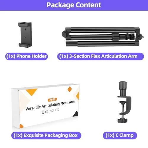 Return Policy Fast Delivery Trusted seller 37" Overhead Camera Mount Desk Stand, 3-Section 360° Adjustable Articulating Metal Arm with 1/4" Screw and Phone Holder, Foldable Webcam Stand for DSLR Camera Ring Light Projector Product Description Taller & Greater Load Capacity: Our overhead camera mount boasts an exceptional 37.4 inch/95 cm length, providing up to 3 times higher than its counterparts. Light stand can bear a load up to 11 lbs in a horizontal state and 22 lbs in a horizontal state High Quality: Three-Section mic boom arm is made of aluminum alloy, and c clamp is made of iron, longer service life. All-Metal webcam stand provides super safe and stable for your valuable devices Adjustable & No Shaking: The top and bottom of table stand are 360° rotatable, and each joint can be flexibly adjusted 180° bending. Our overhead phone mount with fixed gear solves the problem of the arm moving and falling over time due to gravity C Clamp Saves Space: Suitable for desks up to 2.4 inch in thickness, super clamp is a space saving tool to support the stand while keeping your desk clean and tidy. The rubber pads also prevent scratches on tabletop surfaces Wide Compatibility: Camera rig is suitable for light, microphone, projector, making it perfect for live streaming, video recording, Zoom meeting. Phone holder with a cold shoe provides extra convenience and can hold other devices to use at the same time Easy To Install: Package includes Camera Desk Mount Stand, C Clamp, Phone Holder. To install, secure C-clamp to table, install magic arm and adjust it to appropriate angle, then lock knobs. It comes with exquisite boxes making it an ideal gift for friends Shipping Returns Payment Shipping Shipping is FREE to all addresses other than APO/PO boxes in the lower 48 states. All our stock ships from US-based warehouses. Shipped via USPS or UPS (depending on location and package weight) Unless stated otherwise, all orders will ship within 24-72 hours of your payment being processed. Check our feedback to see the great reviews of FAST shipping we offer. Returns Seller does not accept returns Payment We currently accept payment via eBay managed payments only. Once payment is cleared, we will dispatch your shipment within 1-3 business days. Please refer to the "Shipping" tab for more information regarding shipping speed to your destination.