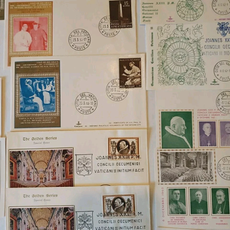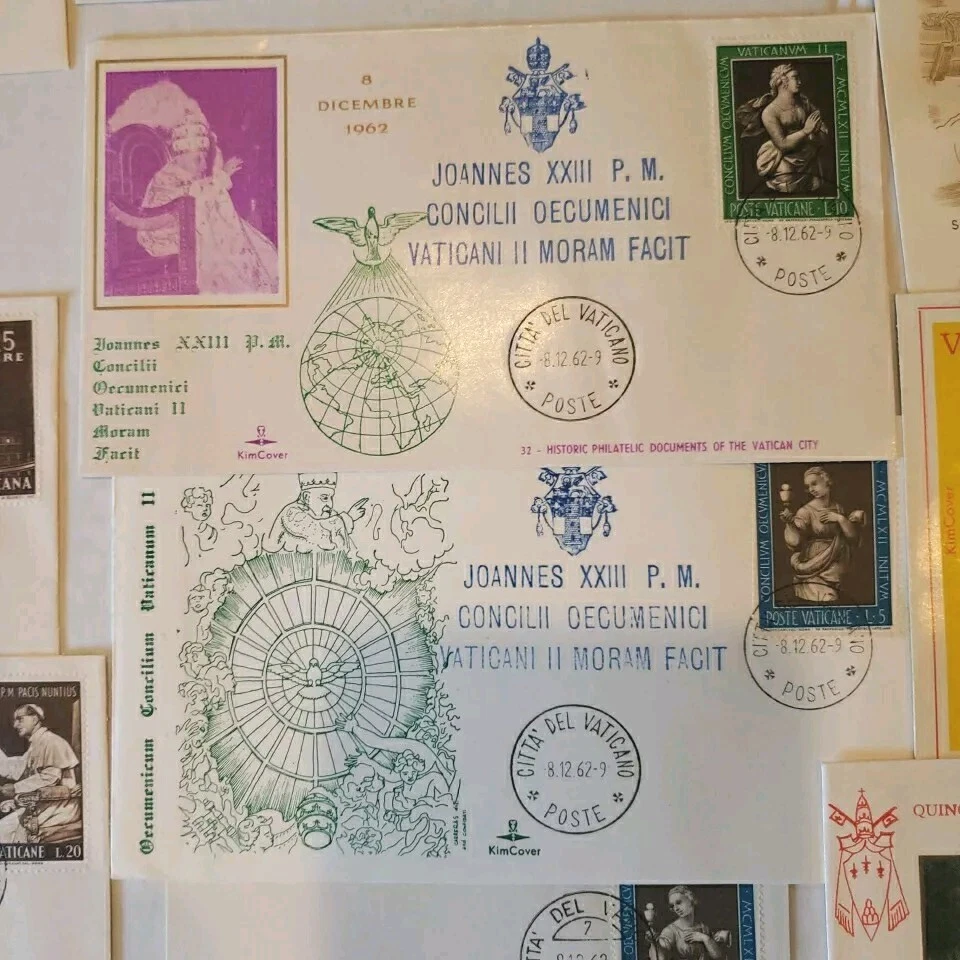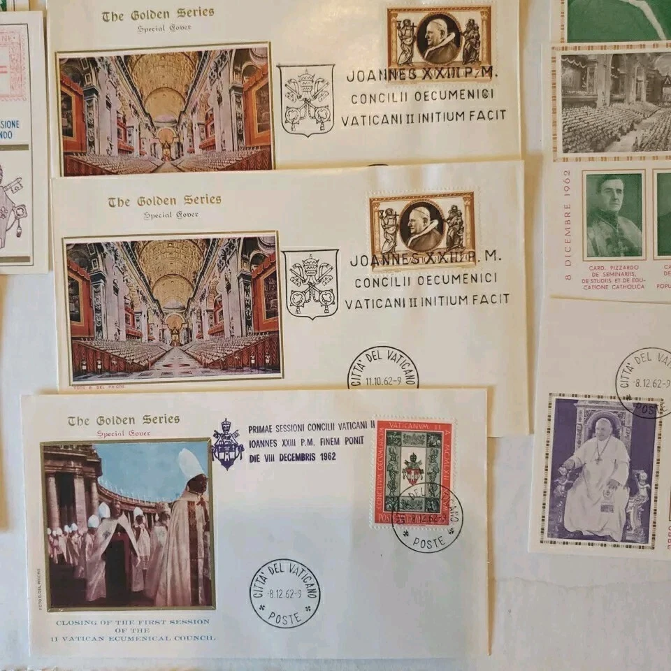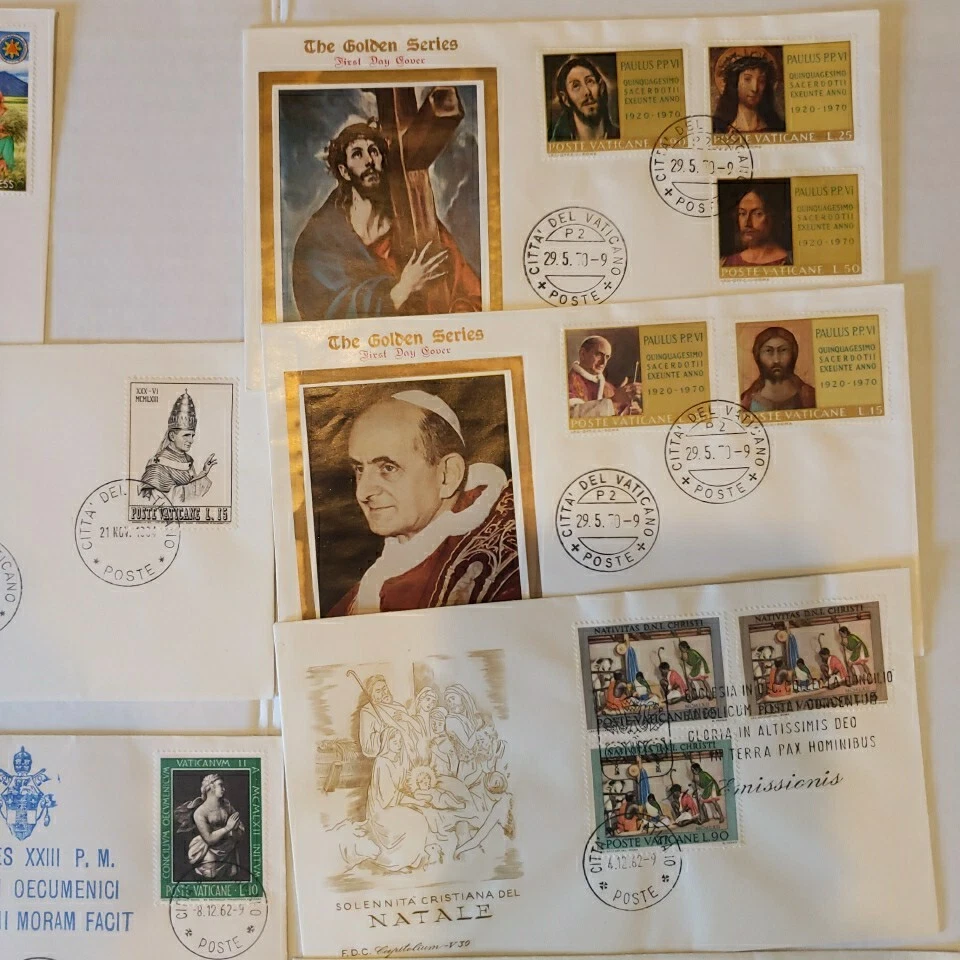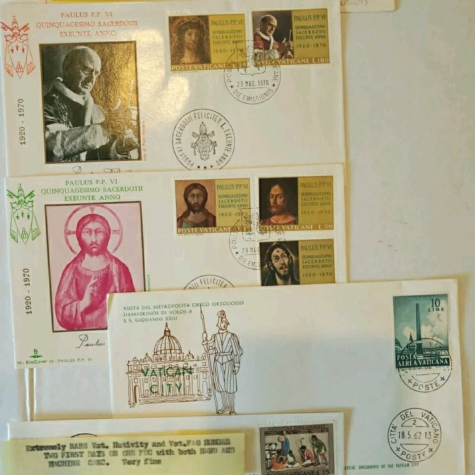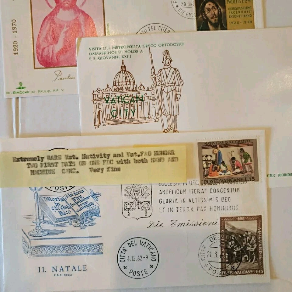 This 37 piece cover collection of stamps from the Vatican is a must-have for any philatelist. Featuring a range of designs and themes, including architecture, this set of stamps is sure to impress. The First Day Cover and cancellation type add to the uniqueness of this item, making it a great addition to any collection. The stamps are ungraded and uncertified, but this does not detract from their quality or value. The collection spans a range of years, from 1962 to 1970, and includes some rare and unique items. Overall, this is a fantastic opportunity to own a piece of history and add some value to any collection. You will see: Vatican golden series special cover 1962 Closing Session etremely rare~ 1962 Vatacan City Nativity and Hunger two first days on one FDC with hand & mach.canc.~ very fine good variety for you to enjoy Vatican City Come in vintage envelopes cases from prior owner who collected these. Just a portion of what we are listing for offer.