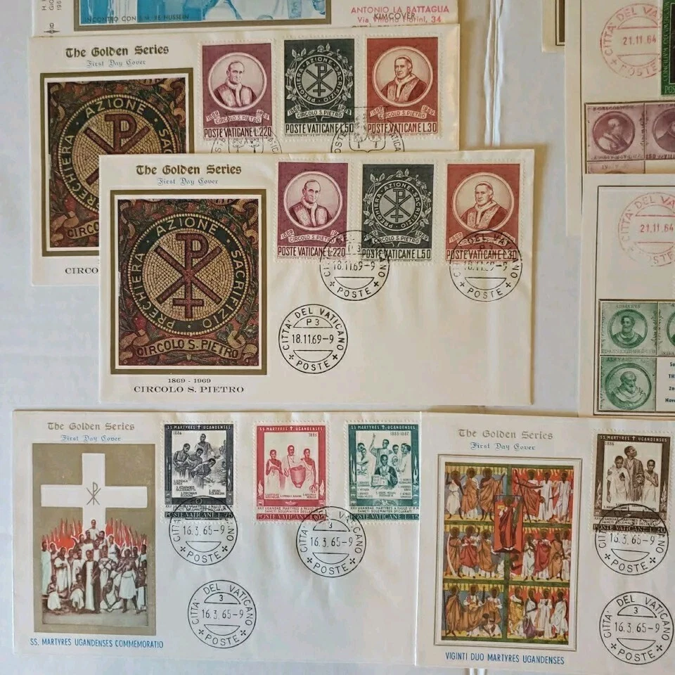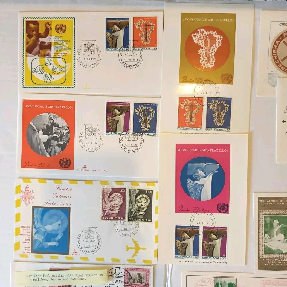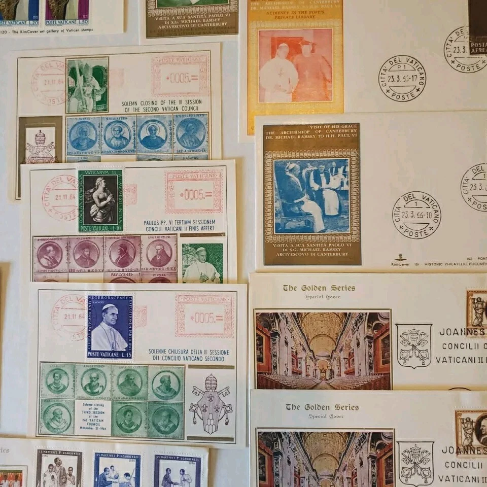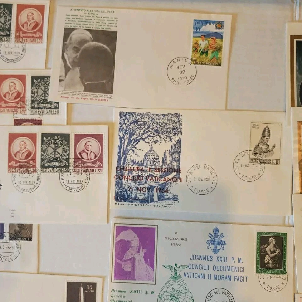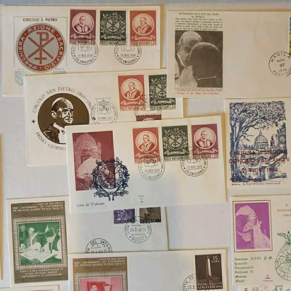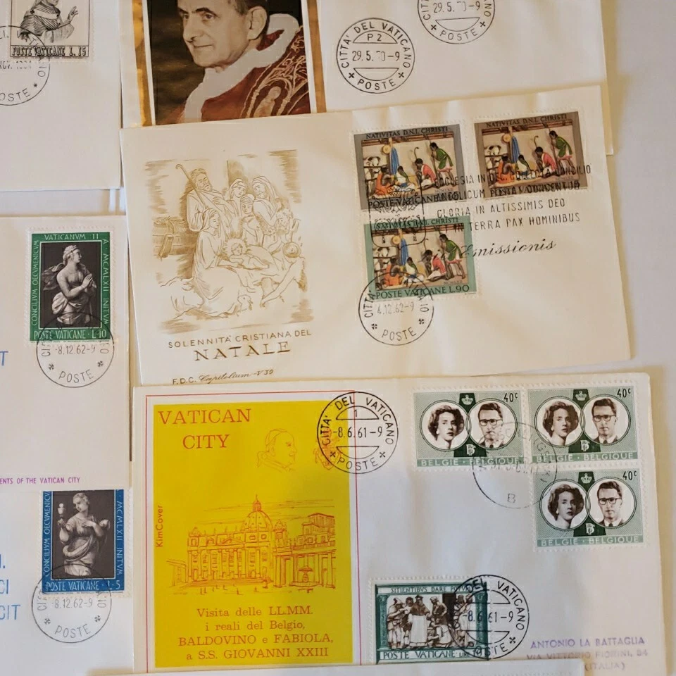 This 37 piece cover collection of stamps from the Vatican is a must-have for any philatelist. Featuring a range of designs and themes, including architecture, this set of stamps is sure to impress. The First Day Cover and cancellation type add to the uniqueness of this item, making it a great addition to any collection. The stamps are ungraded and uncertified, but this does not detract from their quality or value. The collection spans a range of years, from 1962 to 1970, and includes some rare and unique items. Overall, this is a fantastic opportunity to own a piece of history and add some value to any collection. You will see: Vatican golden series special cover 1962 Closing Session etremely rare~ 1962 Vatacan City Nativity and Hunger two first days on one FDC with hand & mach.canc.~ very fine good variety for you to enjoy Vatican City Come in vintage envelopes cases from prior owner who collected these. Just a portion of what we are listing for offer.