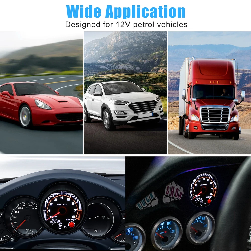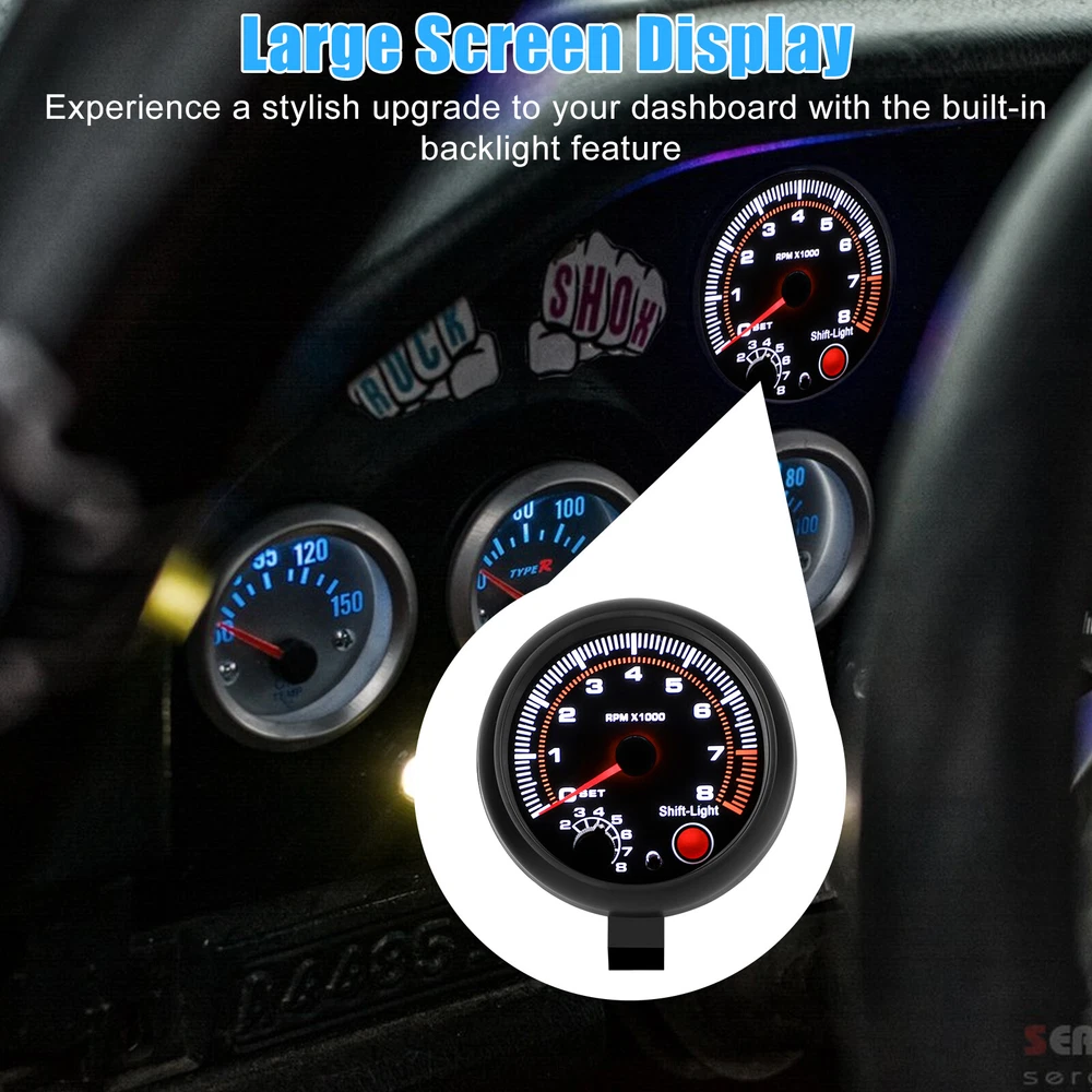 Product Feature ✨ Measurement :Designed for accurately measuring the RPM of your automobile engine. The measurement range extends from 0 to 8000 RPM. Please note that it is not suitable for diesel vehicles; it is exclusively designed for 12V petrol vehicles. ✨ Backlight :Experience a stylish upgrade to your dashboard with the built-in backlight feature. As soon as you start your engine, the tachometer illuminates, adding a captivating accessory to your gasoline-powered car. ✨ Intelligent Car Meter :Equipped with an adjustable shift light on its face, this smart car meter ensures optimal performance. Upon powering on, the product performs a self-check and automatically adjusts the pointer. ✨ Strong Compatibility :This tachometer is compatible with 4, 6, and 8-cylinder engines, ensuring versatility. The bright red needle provides easy visibility, allowing you to monitor your engine RPM with ease. Product Specification Material ABS Color Black Background light White light Input Voltage 12V Unit RPM Measurement Range 0~8000RPM Diameter Approx. 3.75"/95mm Compatible With 4, 6, and 8-cylinder Engines Package Included 🎁 1 x Car Tachometer Gauge 🎁 1 x Accessories Kit 🎁 1 x User Manual Location Descriptions To improve your buying experience and ensure fast delivery, Your order will be shipped from the warehouse located in either new jersey or california that is closest to your address. If you have any questions, Please contact us. Thank you for your support !