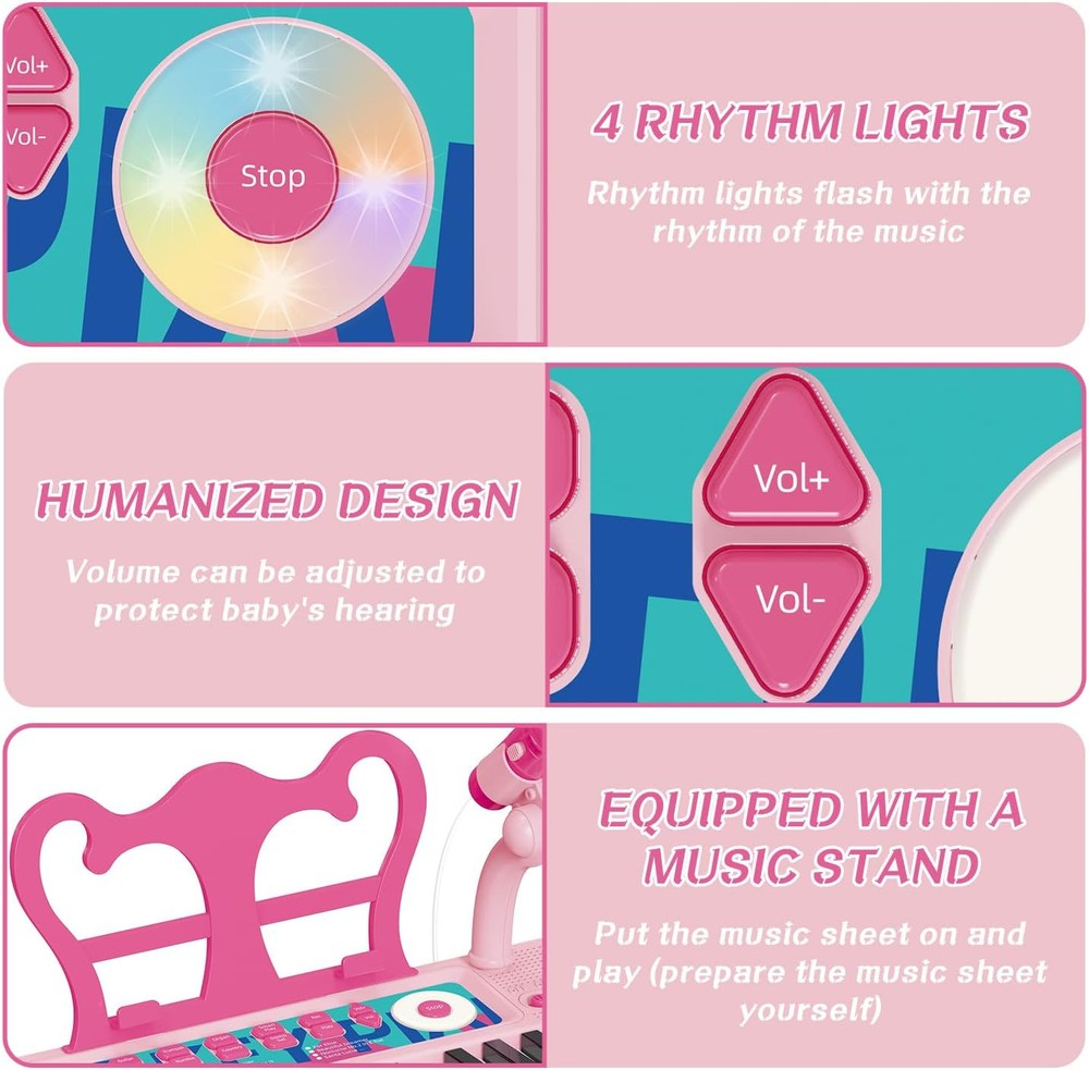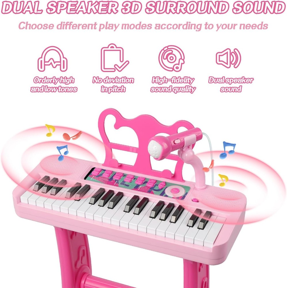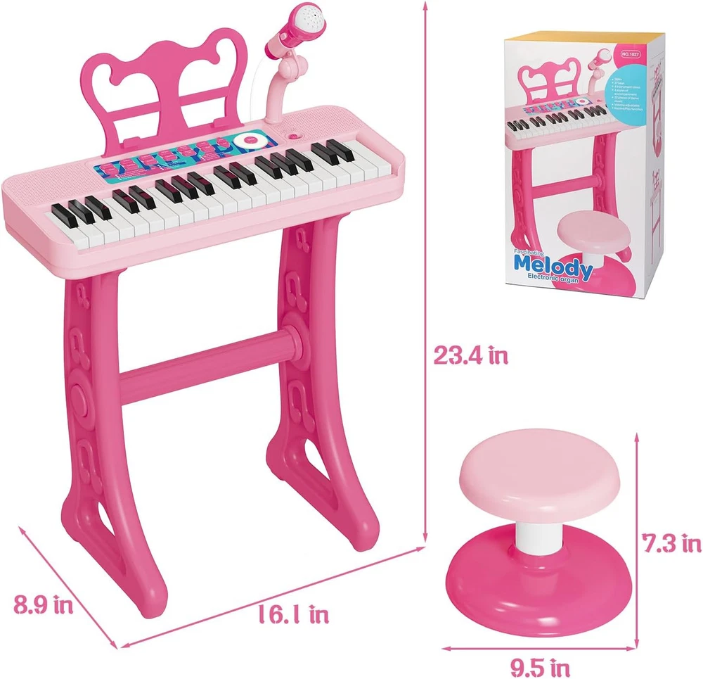 Kids Piano, 37 Keys Toddler Piano Keyboard Toy Electronic Musical Instrument Educational Toy with Microphone, 2 Speakers, Record Playback, Christmas Birthday Gift for 3+ Years Old Product Details Product Dimensions: 3 x 2 x 1 inches Item Weight: 4.27 pounds Country of Origin: China Manufacturer recommended age: 3 years and up Manufacturer: Tucraew More Functionality, More Fun: This Kids' piano has 37 Keys, 22 demo songs, 4 rhythms, 4 instrument tones, a Record and playback function. The 37-key piano includes a microphone and a stool, kids can sing into the microphone and play the toy piano while comfortably seated on the stool. More functions will bring more fun to your child Equipped with Microphone & Music Stand: Comes with an audio cable to connect your MP3, phone, iPad or computer to the piano for playing music. Using a real working microphone, your kids could sing while playing, it can exercise children's self-confidence, and satisfy their desire to perform. The included music stand makes reading music scores while playing a breeze. Surprise your kids with our amazing Piano Kids Piano with 2 Speakers: The 37-key baby piano keyboard features dual speakers, unlike most toy pianos with just one speaker and no microphone or music stand. The stereo effect from the left and right speakers, along with adjustable demo playback speed using the volume “+” and “-” buttons, offers a rich sound experience. This makes it an ideal gift for kids 3+, helping them discover the joy of playing the toddler piano Great Preschool Learning Toys: The toddler piano toy can cultivate children's interest in music and mobilize their hands to coordinate the flexibility of fingers while promoting the development of their brain, improving imagination, and promoting EQ cultivation. It is a great educational toy for 3/4/5/6 years old kids Gift for 3 4 5 6 7-Year-Old Girls Boys: Are you looking for a gift for your son, daughter, or child of a friend? Look no more, the upgraded child musical educational toy has more functions and better sound quality, making it a great musical learning toy. The kid's piano keyboard is the best gift for 3 4 5 6 7-year-old girls and boys on birthdays, children's Day, Christmas, or other festival days. What are you waiting for? Take it home immediately