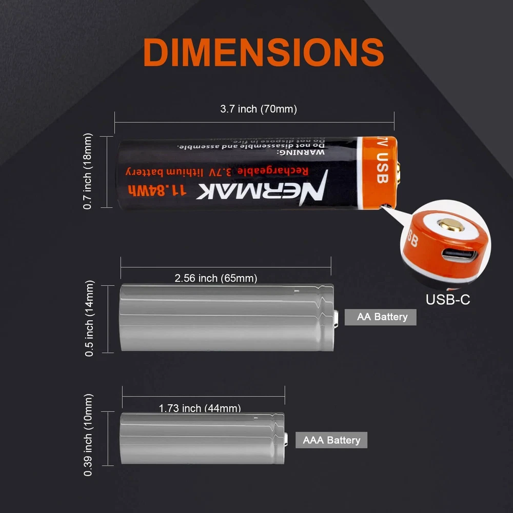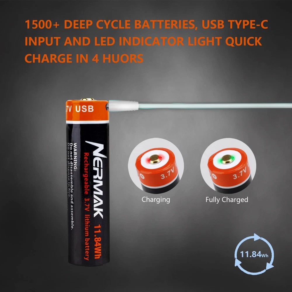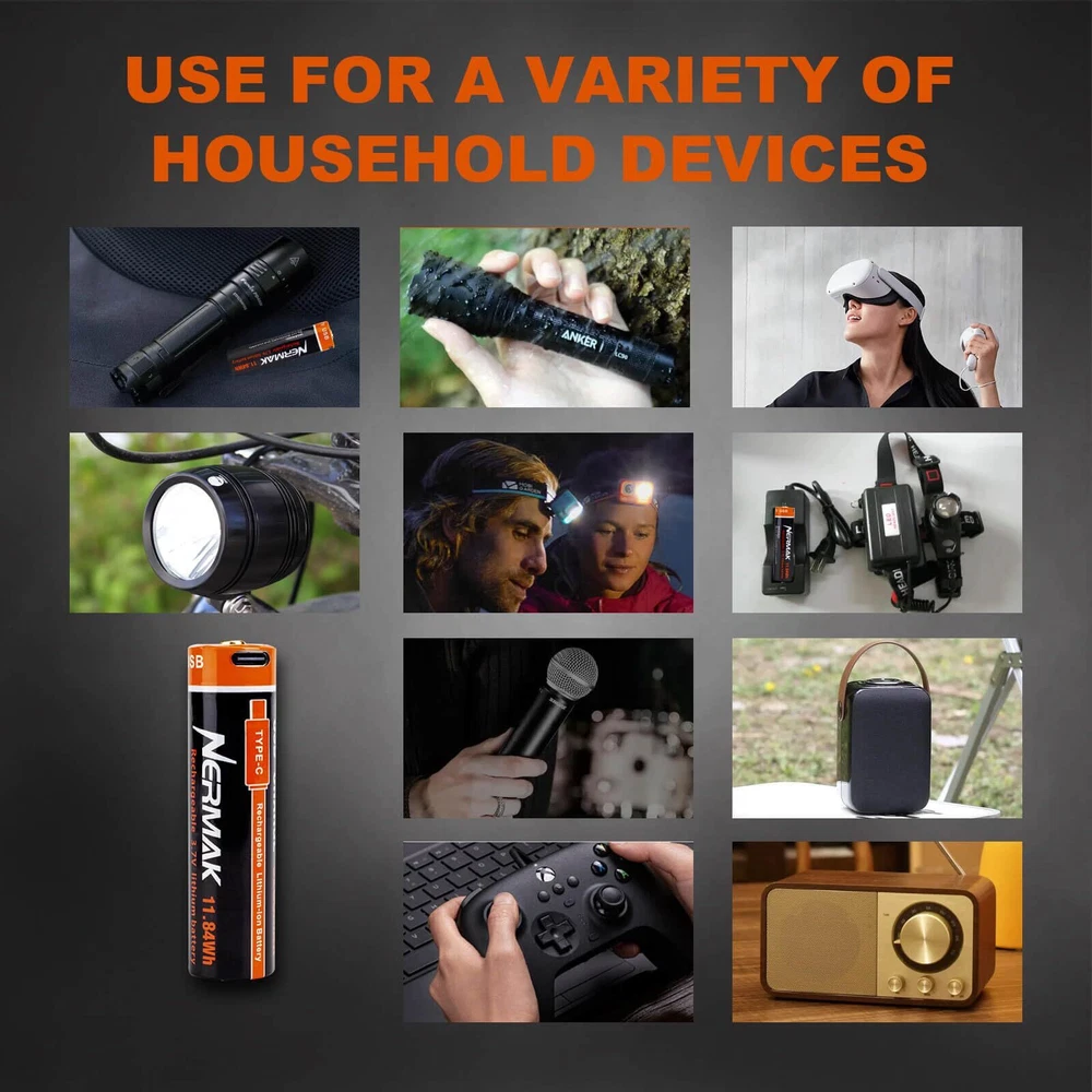 【Size Parameters】3.7V 3200mAh lithium batteries, size: 18mm(0.7 inch) diameter x 70mm(2.7 inch), (Note: they are longer than the flat-top batteries, please check the battery size before purchasing) 【Superior Performance】:Built-in USB-C port, support C-C output, you can charge your cell phone and other devices in case of emergency, ordinary USB cable can be easily charged No need for additional battery charger (PD fast charging is not supported) 【Widely Uses】:NERMK 3.7V rechargeable batteries are suitable for flashlights, headlamps, toys, remote controls, microphones, radios, bike lights, bluetooth speakers, and other household devices. 【Safe and Efficient】: 3.7V battery has built-in safety protection against overcharging, over-discharging, over-current and short-circuit, with 1500+ charging cycles for longer service life, making it an ideal replacement battery for high-frequency equipment. 【Warm Note】: 1* 3.7 Volt Replacement lithium ion battery,12 months warranty, If you have any question for our product, Contact us: click the "Ask a question" on our storefront or in "YOUR ORDER" options click the "contact seller"