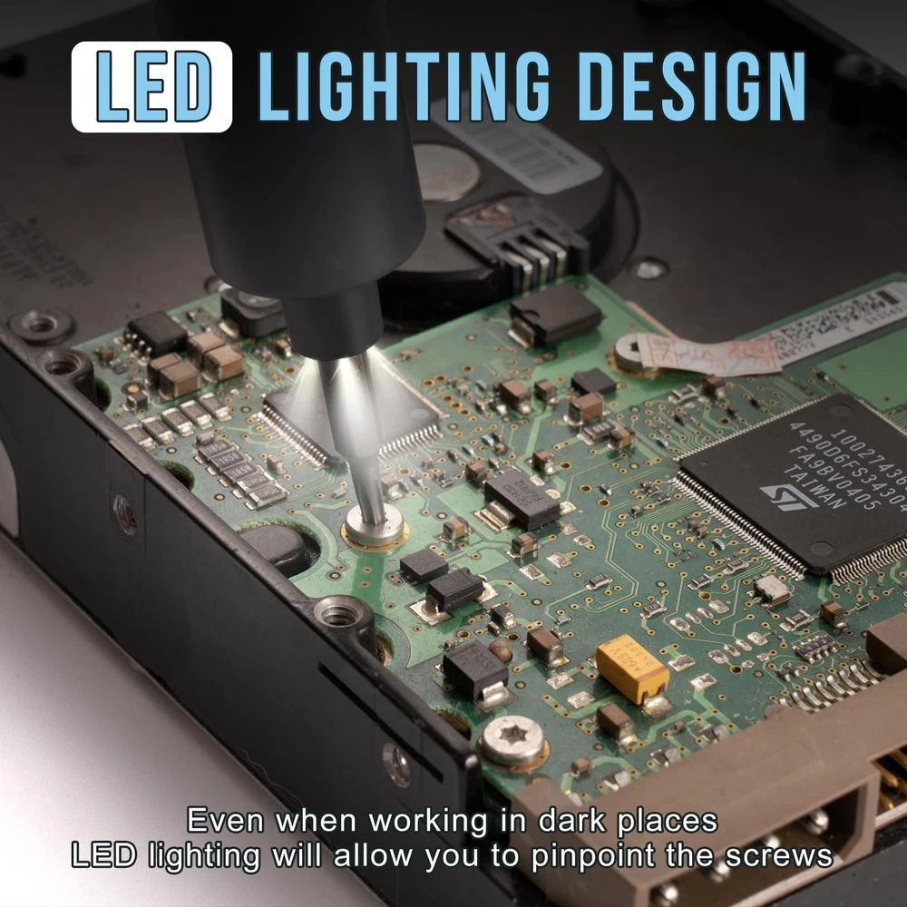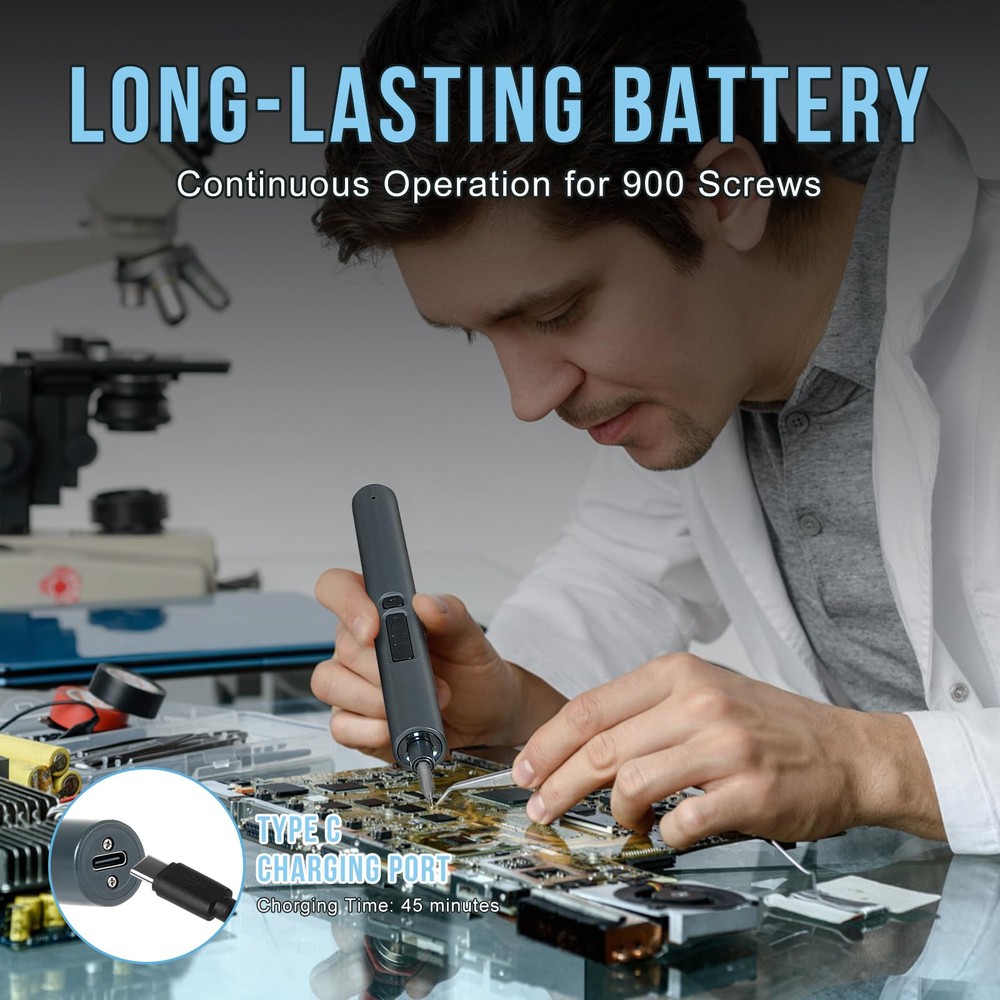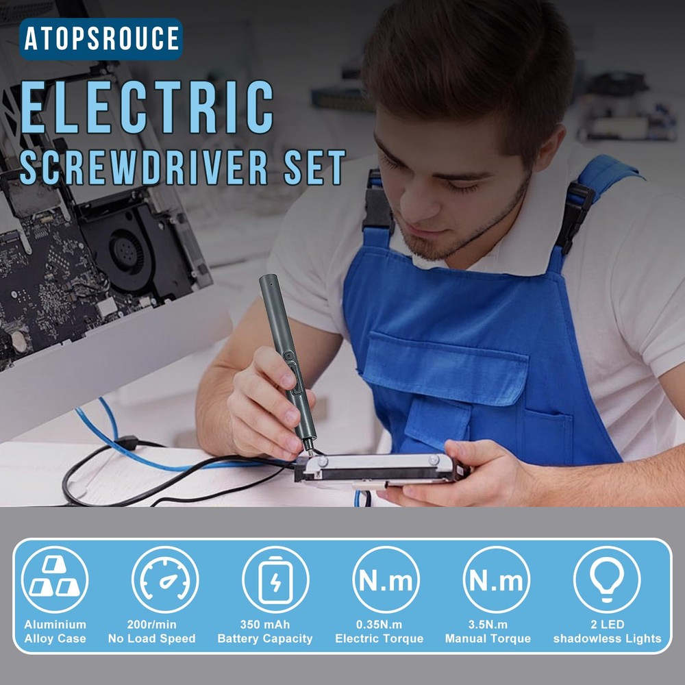 【24 IN 1 Electric Screwdriver Set】Mini screwdriver set is a tool that families need to repair their digital products and children's toys by themselves. With 24 screwdriver bits-Phillips, Torx, Flat Head, Triwing, Hex, Pentalobe, Triangle, etc. , 1 Magnetic Mat, 1 USB charging cable. 【2 speed adjustment & 2 modes】 Precision screwdriver set can adjust the speed you need to facilitate your maintenance and disassembly work, 0.15N.m for Low-torque and 0.35N.m for High-torque, upgraded metal machine casing allows you to operate in manual mode and automatic mode Smoother to use 【Precision Torque】Small screwdriver set with 200r/min rotation speed, offers accurate torque forces tiny screwdriver set can accurately and safely remove each of your screws, suitable for repairing mobile phones, computers, cameras, drones, toys, watches, games Handles and other electronic products 【LED Lights Design】 The electric screwdriver cordless is equipped with LED lights, which allows you to quickly find every screw even in a dark environment, allowing you to worry less and improve efficiency at work. The cordless screwdriver can be carried around like a pen without taking up your space 【Long-lasting Battery Life】 This power screwdriver set is equipped with a sturdy 350mAh battery, which can remove or tighten 1000 screws when fully charged. You can conveniently charge it using the included USB-C cable, providing flexible charging options for powering up your precision screwdriver set anytime and anywhere.