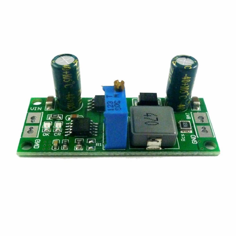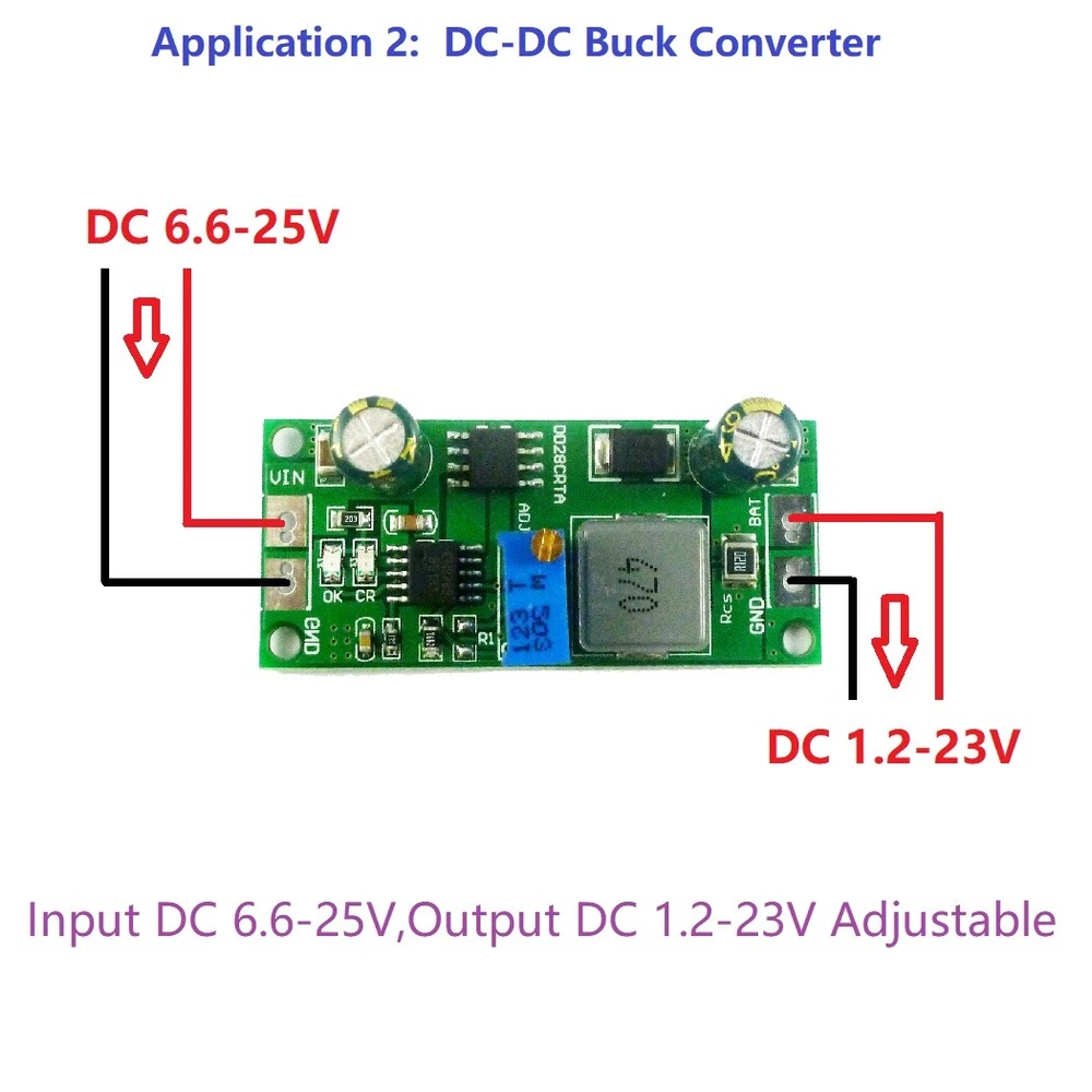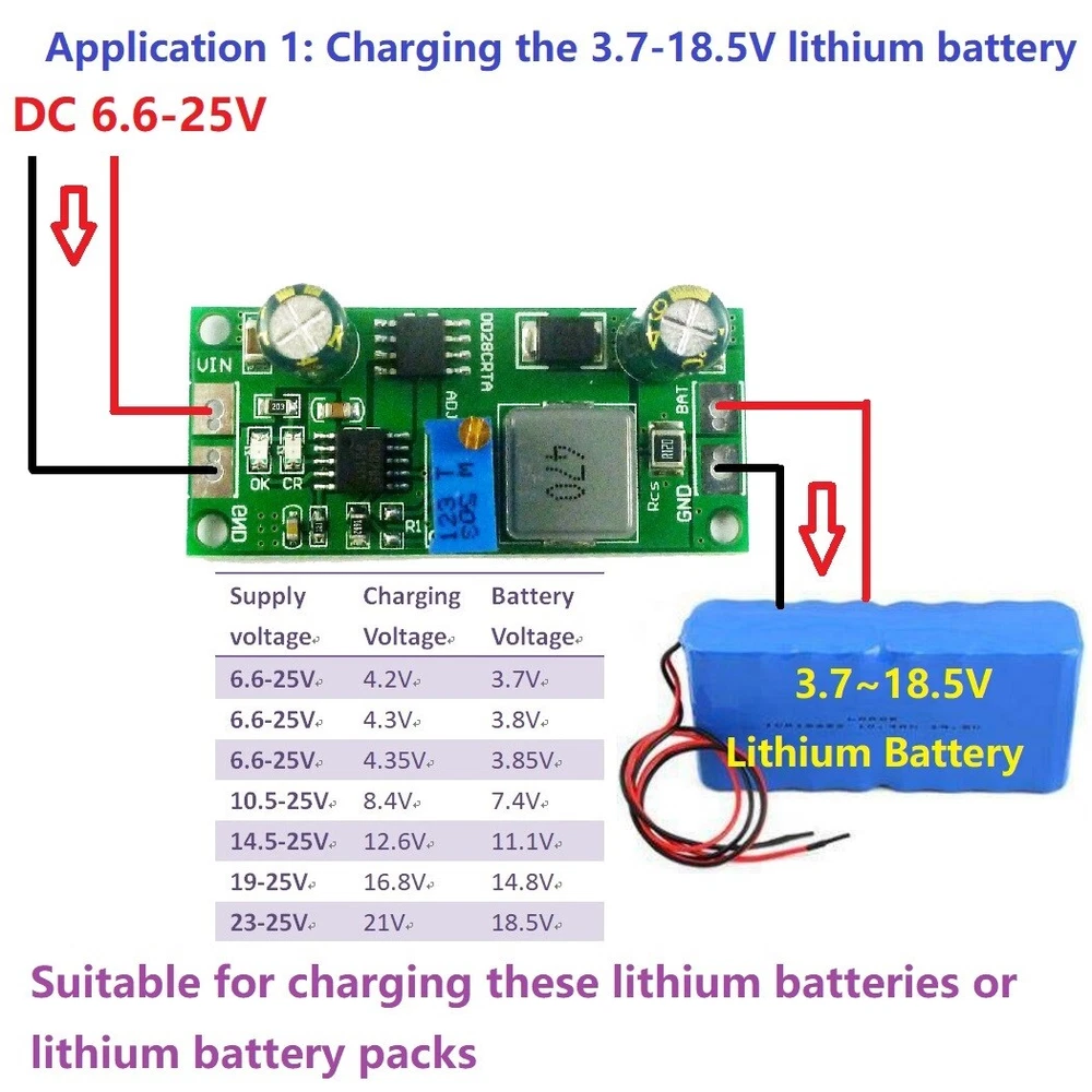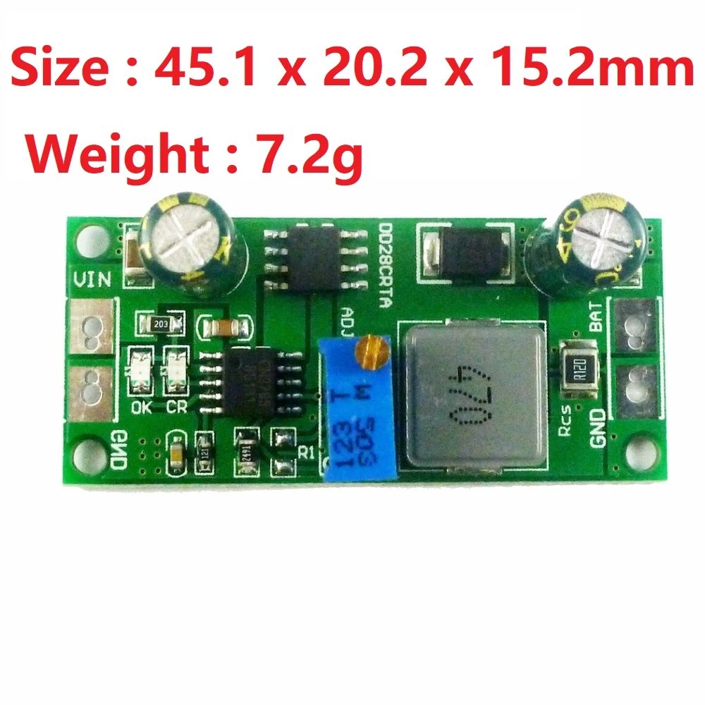 Applications: Car battery charging Solar battery charging Mobile Loadspeaker Electric Bicycle Charger UPS Portable Industrial and Medical Equipment Standalone Battery Chargers Hand-held Equipment Battery-Backup Systems Portable Industrial and Medical Equipment Standalone Chargers for Lithium ion, LiFePO4 or Lithium Titanate Batteries Product Name: 1A 3.7V 3.8V 7.4V 11.1V 14.8V 18.5V Lithium ion LiFePO4 Lithium Titanate Batterie Charger Charging Module Packing list: 5 PCS DD28CRTA 1A 3.7-18.5V Lithium Battery Charger Description: 2 in 1 1A 3.7-18.5V Battery Charger & DC-DC Buck Converter Complete Charge Controller for Singleor Multi-cell Lithium ion, LiFePO4 or Lithium Titanate Batteries Input DC 6.6-25V,Output DC 1.2-23V Adjustable(4.2V 4.3V 4.35V 8.4V 12.6V 16.8V 21V) The maximum charge current / output current is 1A, but you can change the current by changing the value of the Rcs resistor. Can be used as Voltage Source when Battery is Absent Automatic Conditioning of Deeply Discharged Batteries Automatic Recharge Led indicator : "CR" LED is charge status indicator "OK" LED is fully charged OR Constant voltage mode; After the "OK" light is on, please continue charging for 10-20 minutes. Battery Overvoltage Protection Operating Ambient Temperature-40℃ to +85℃ Size : 45.1 x 20.2 x 15.2mm Weight : 7.2g If you need a chip brochure please contact me