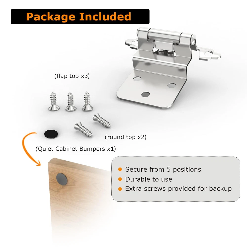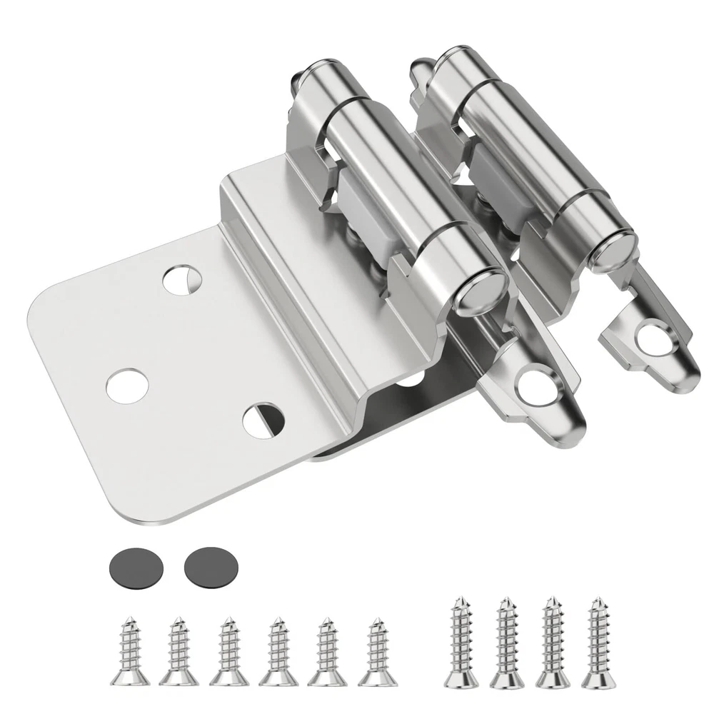 High-Quality and Durable - Looking for a set of hinges that are built to last? Look no further than our 3/8" Self-closing Inset Door Hinges. Crafted from high-quality thick metal, these hinges are designed to withstand even the toughest wear and tear. With their durable metal spring module and corrosion-resistant properties, these hinges are the perfect choice for anyone who wants a reliable and long-lasting solution. Convenient and Complete Package - Our Inset Hinges come in a convenient pack of 50 (25 pairs), and each package includes 250 screws to ensure you have everything you need for installation. The cabinet door hinge is designed to close automatically when the door is within 30 degrees. Plus, the Quiet Gaskets also guarantee that your every closure is silent, so you won't disturb anyone while you're close the cabinet door. Easy to Install - We know that installing cabinet hinges can be a hassle, which is why we've made sure that our 3/8" Inset Self-closing Door Hinges are easy to install. You don't need to have advanced carpentry skills to install them, and they don't require a mortise. Simply attach them to the surface of your cabinet and door, and you're good to go. These semi-concealed bulk hinges work perfectly on your American cabinets. Check Your Needs - Before ordering, please make sure to double-check whether you need an Overlay (1/2") or Inset (3/8") hinge. This will ensure that you receive the correct product and avoid any installation issues. Top-Notch Customer Service - At , we're committed to providing our customers with the best possible experience. If you have any questions or concerns about our Inset Hinges, don't hesitate to reach out to us. Our friendly team is always here to help and ensure that you're completely satisfied with your purchase.