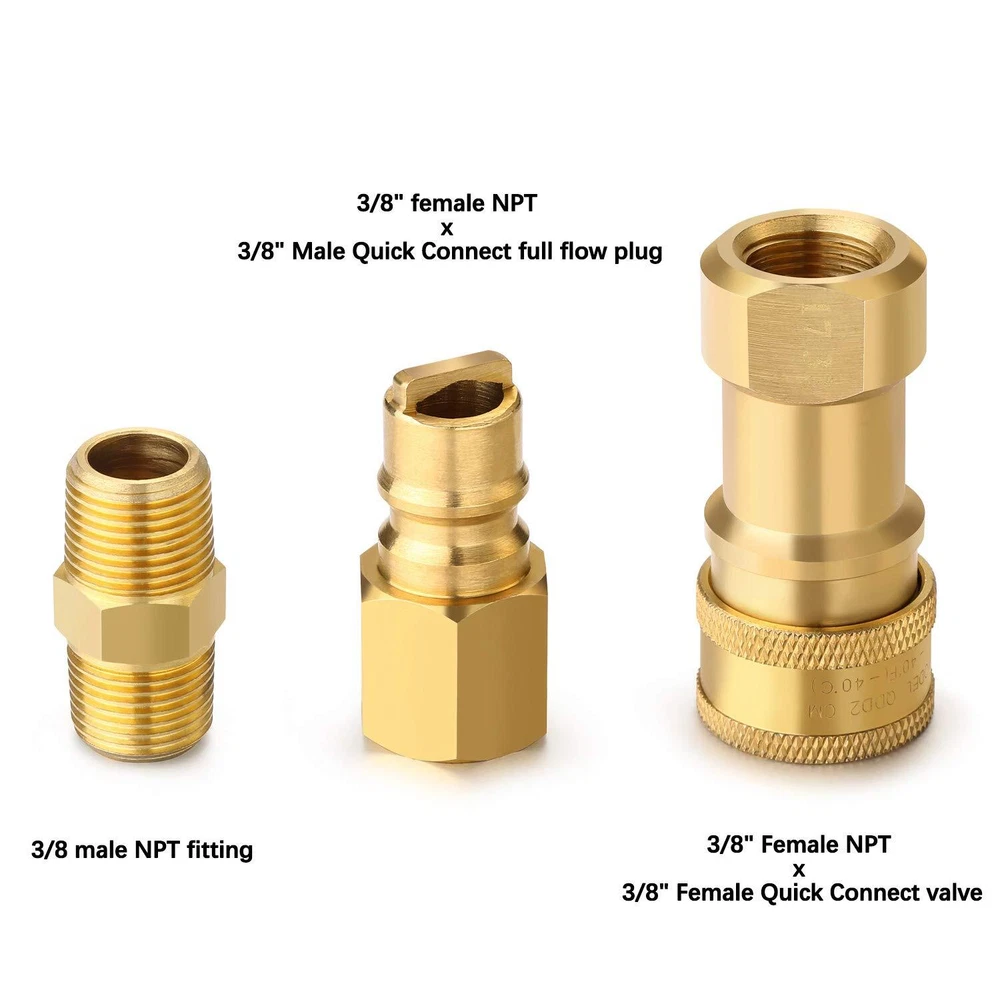 Material: 100% solid brass construction makes it corrosion resistant. The center hex nut of this quick connect adapter provides solid grip while installing, provide safe connection and leak prevention for you. Application: The propane quick connector adapter can be applied in low-pressure natural gas or propane systems, also suitable for other occasions, such as motorhomes, trailers, ships, gas grills, etc. Safety: Add a convenient connect / disconnect method ,automatically shuts off flow when you disconnect the hose. Easy to install: No tools required, the threads are tightly connected. We provide a thread seal tape. Bring convenience for you to insall it. Specification: 3/8" Male NPT Thread x 3/8" Female NPT Thread; ❗Attention: Do not suitable for 3/8'' flare thread hose, if you want to use this fitting on a 3/8'' female flare hose, you need to buy another fitting that can convert 3/8'' NPT Thread to 3/8'' Flare Thread.
