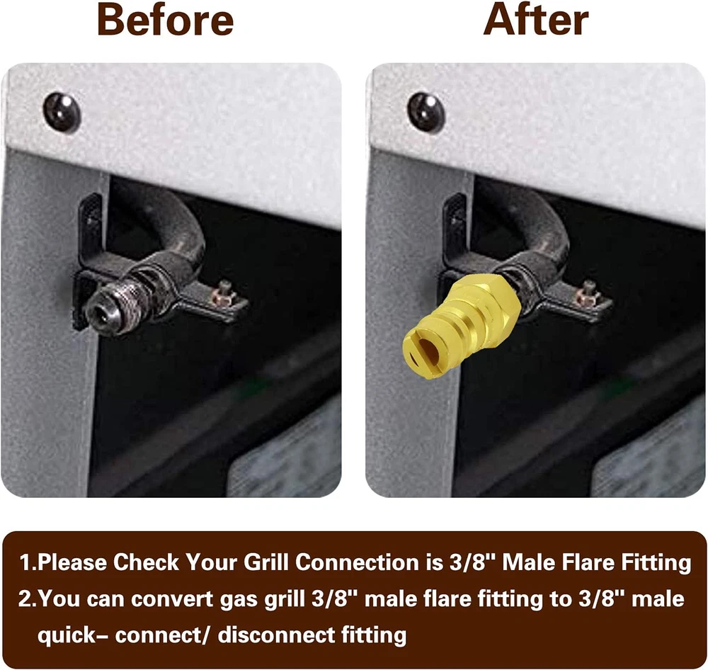 4 piece-Brass 3/8" Natural, Propane quick convert connect fittings adapter, include: 3/8 "Female Pipe Thread x 3/8"Male Flare Quick Connect /Disconnect adapter, 3/8 "female NPT x 3/8" male quick connecting full flow plug, 3/8" male NPT x 3/8" male NPT connecter, 3/8 "flare female x 3/8" male quick connecting full flow plug Sturdy material: These coupling connecter adapters and natural gas quick connecting fittings are made of 100% solid brass material, The center hex nut of these quick-connect adapters provides a solid grip while installing, not easy to break and deform, durable .ductility at high temperatures and low magnetic permeability provide a long service time This 3/8 Inch natural gas quick conversion connecting fittings kit can be applied in low-pressure natural gas or propane gas systems, suitable for Cart Style Liquid propane/ natural Gas Grill, motorhomes, trailers, ships, firepits, fireplaces, etc. 3/8" male quick connect full flow plug x 3/8" female NPT and 3/8" flare female thread with lp propane hose used in combination together can easily convert the BBQ grill and the fire pit table gas inlet to quickly connect/disconnect adapters mode, without tools, and easy to install, also easy to quick use This 3/8" quick-connect conversion coupling kit is powerful, widely used, and has many quick connection methods modes, suitable for all 3/8 connection gas cookers, fire pit quick connection; if you encounter this/8" If you have any questions about the quick-connect conversion coupling kit, please contact us directly through the Amazon platform (MCAMAPS). Get a 100% refund and technical support services within 24 hours Product Description 3/8“ Quick Connect Disconnect Adapter 3/8" Female NPT Thread x 3/8" Male Flare Quick Connect Disconnect. 1/2 PSI High Quality 100% Brass Fitting.Easy to install, no tools required Add a convenient connect/disconnect method ,automatically shuts off flow when you disconnect the hose 3/8" Quick Disconnect plug to 3/8“ Flare Female Thread 360-degree rotating 3/8" flare female x 3/8" quick disconnect plug connecters usually convert BBQ ovens, fire pits, etc. with 3/8" flare male connectors for quick disconnect adaption, Easy Connect and discount by the plug, Better to use and easy to use High Quality 100% Brass Fitting, operating temperatures range from-53 to 121 °C/-65 to 250 °F, the flare with threa fitting threads pipes provides a tighter seal which is non-leaking and safer 3/8" Quick Disconnect plug to 3/8“ Female NPT Thread 3/8" quick disconnect plug x 3/8" female NPT thread Connecter is used to convert all gas cooktops with 3/8 male NPT connector for quick disconnect High Quality 100% Brass Fitting, operating temperatures range from-53 to 121 °C/-65 to 250 °F,The connection between NPT thread and NPT thread cannot be fully screwed in place, it is sealed by the tightness of the thread, and must be tightened with a wrench 3/8" NPT Male to 3/8"NPT Male Thread 3/8 NPT to 3/8 NPT male brass equal hex nipples. NPT thread has a 60° taper, so usually unable to screw the thread to the end. 100% Premium solid brass nipple, thicker and stronger, durable, threads are deep and accurate, Used to connect female pipes with same diameters, or extending the pipe length. Apply to plumbing connections, compressed air, hydraulic, refrigeration, instrumentation, gas and other applications, hex nipples for easy tightening and loosening. Operating pressure: 1200 psi; Temperature range of -65°F to +250°F (-53°C to +121°C). It's hard connect way and in most cases do not require sealant. Use a 3/8 inch quick connect/disconnect adapter to connect to the BBQ grill. The BBQ grill inlet is a quick connect method and the 3/8 inch quick plug to connecting propane hose. Use a 3/8 inch NPT female or 3/8 inch flare female plug adapter Install to connect on the Mr heater, barbecue grill or gas generator has 3/8 Male thread fiiting adpater The 3/8 inch quick connect/disconnect adapter to connect the propane hose. In this way, they also form a quick connection/disconnection method when used 3/8" male NPT x 3/8" male NPT adapter plus 3/8 "Female Pipe Thread x 3/8" Inch Male Flare Quick Connect Disconnect adapter to connect the home backyard gas pipe to 3/8" Quick Connect Disconnect adapter Powerful 4 Piece 3/8" Natural/LP Gas Brass Quick Connect Fitting Adapter Sets Made of 100% high-quality brass, widely used Convert BBQ grills and fire pits to quick connect / disconnect method ,automatically shuts off flow when you disconnect the hose. Convert Gas power generator to quick connect / disconnect method ,automatically shuts off flow when you disconnect the hose.