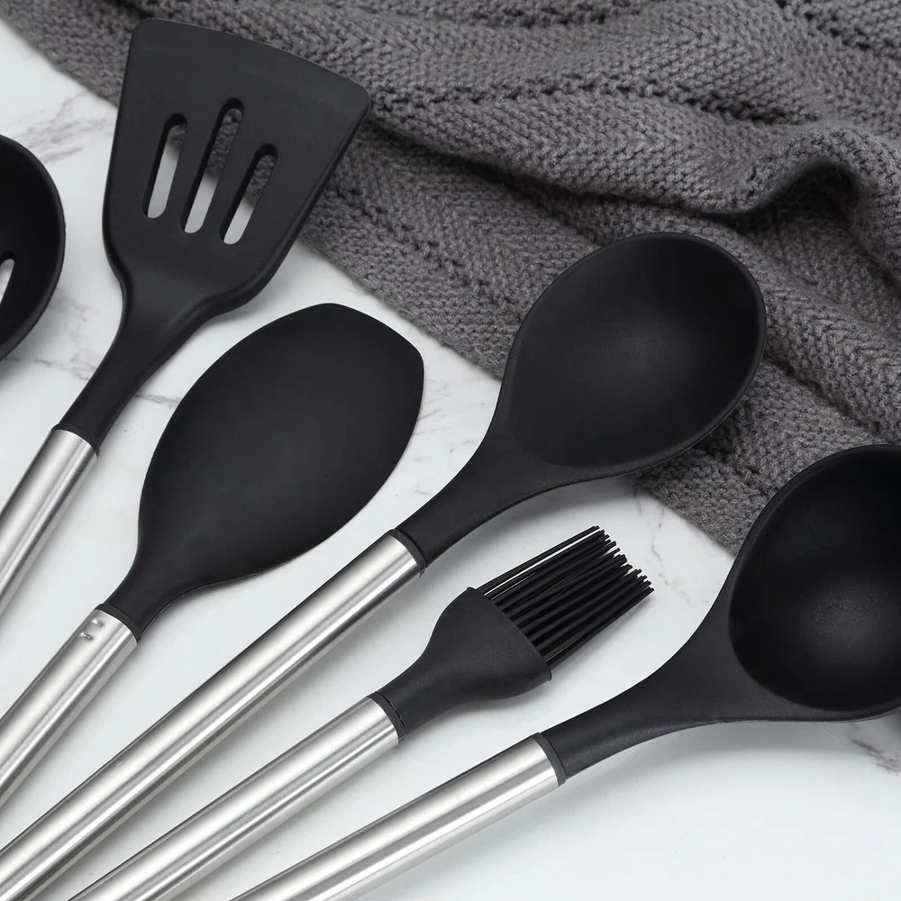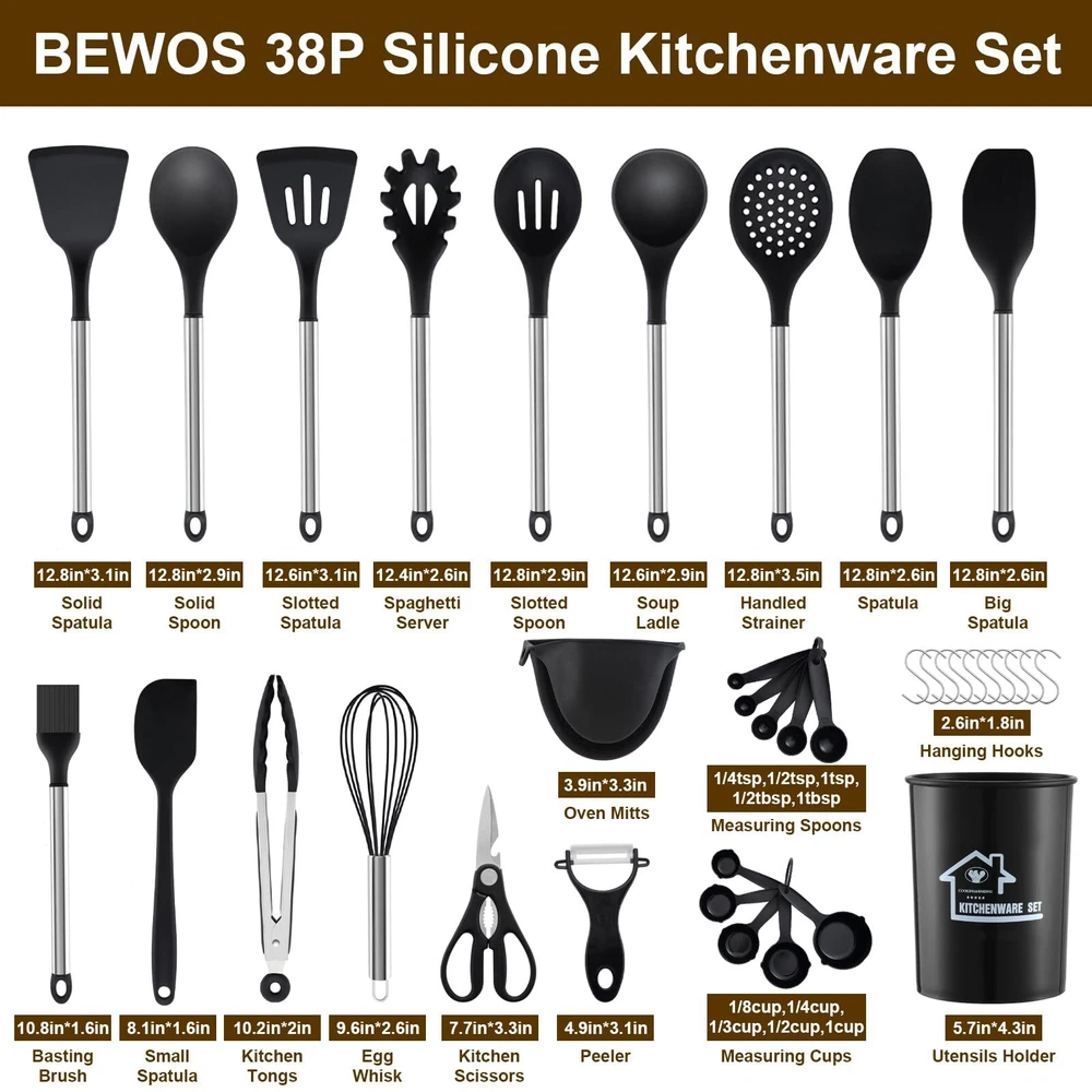【38-Piece Silicone Kitchen Utensils Include】Hanging Hook x 10, Measuring Spoon x 5, Measuring Cup x 5, different sizes of Spatula x 3, Oven Mitt x 2, Solid Spatula x 1, Slotted Spatula x 1, Solid Spoon x 1, Slotted Spoon x 1, Soup Ladle x 1, Handled Strainer x 1, Spaghetti Spoon x 1, Brush x 1, Kitchen Tongs x 1, Egg Whisk x 1, Kitchen Scissors x 1, Peeler x 1, Utensils Holder x 1. A single purchase will put together whatever kitchen gadgets you need without the need for multiple purchases 【High Quality Food Grade Silicone】Our kitchen utensils set is made of healthy and non-toxic silicone, so there will be no odor and no chemical reaction with any food and drink when cooking. Using it will not cause any health burden. It is recommended to soak the cooking utensils set for 30 minutes when using for the first time, and then dry them well to eliminate the initial odor 【High Temperature Resistance】 our silicone spatula can withstand high temperatures up to 180°C and does not melt or deform easily. Compared to other materials, our kitchen set has a longer service life. The flexible material also reduces noise and does not scratch the bottom of the pan 【No Stain Hiding Design】 High quality stainless steel handle of our kitchen utensils set with holder is healthy and durable, rust-proof and corrosion-resistant. The craftsmanship is exquisite with no gaps, easy to clean. If you think it's a hassle, you can put our kitchenware in the dishwasher to clean it and free up your hands 【Kitchen Essenti】Our cooking utensils have both spoon set and spatula set, as well as kitchen shears, peeler and other kitchen tools, which can fully meet your cooking and baking needs. The handle is designed with thoughtful hooks for easy storage and drying. In addition, the silicone utensil set also comes 10 hanging hooks and 1 utensil holder, providing you with a neat and organized kitchen experience 【Rapid Response After-Sales Service】 It is our pursuit to satisfy every customer. If you have any questions about our kitchen utensil set, please feel free to contact our customer service, we will reply and deal with it as soon as possible