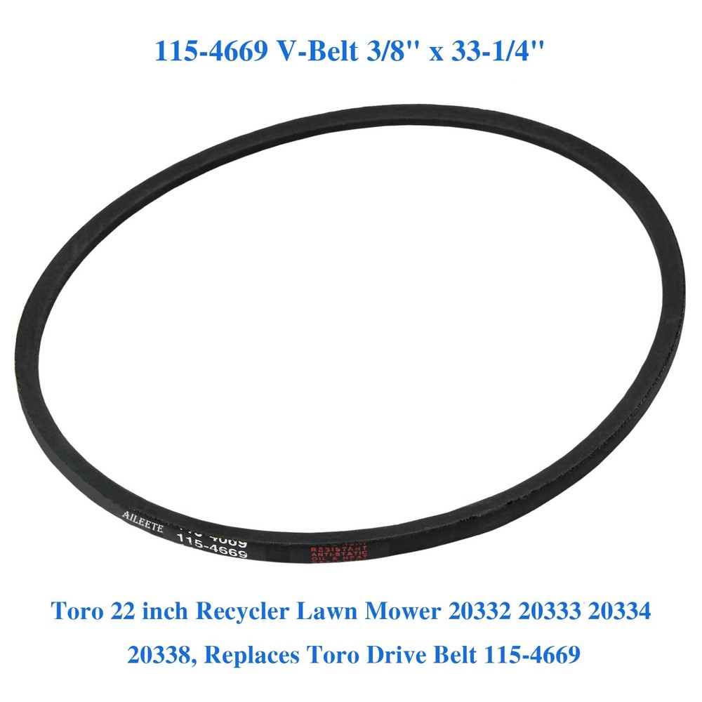 115-4669 V-Belt 3/8" x 33-1/4" for Toro 22 inch Recycler Lawn Mower 20332 20333 20334 20353 20372, Replaces Toro Recycler 22 Drive Belt 115-4669 Replaces OEM Parts: Toro 115-4669 Fits Models: Toro 20332, 20332C, 20333, 20333C, 20334, 20334C, 20337, 20337HD, 20338, 20352, 20353, 20372, 20373, 20374, 20376, 20792, 20955, 20956, 20958, 20960, 20964, 21381, 21690, 21691, 21762, 21763, 21766, 21767 Lawn Mowers Replacement Toro 22 inch Recycler Lawn Mower Drive Belt 115-4669 for Recycler RWD V-Belt Which is Attached to the Transmission Pulley and it Helps to Drive the Unit Width: 3/8", Length: 33-1/4", Belt Application: Drive, Belt Type: Covered 115-4669 V-Belt Made of High Quality Rubber, Durable and Stable, Easy to Install and Use Shipping We offer FREE shipping on all orders! We ship within Three business days of payment, usually sooner. We use a selection of shipping services such as UPS, FedEx, USPS etc. We only ship to the lower 48 states, no APO/FPO addresses or PO Boxes allowed. Local pickups and combined shipping options are not provided at this time. Return You can return a product for up to 30 days from the date you purchased it. Any product you return must be in the same condition you received it and in the original packaging. Please keep the receipt. Payment We accept payment by any of the following methods: PayPal Please pay as soon as possible after winning an auction, as that will allow us to post your item to you sooner! Feedback Customer satisfaction is very important to us. If you have any problem with your order, please contact us and we will do our best to make you satisfied. Contact Us If you have any queries, please contact us via ebay. We usually respond within 24 hours on weekdays. Please visit our eBay store to check out other items for sale! Thank you for shopping at our store.