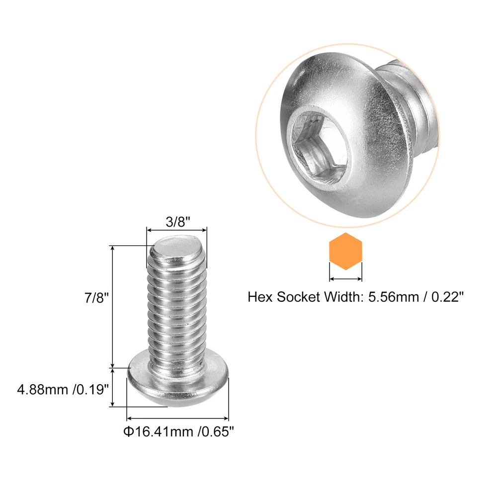 Document Description:1. Material: The button head socket cap screws are made of 304 stainless steel, which provides good corrosion resistance, durability, and long-lasting performance.2. Design: This socket head cap screw features a design with a hexagonal drive hole and a button head that provides better torque transmission and more stable performance.3. Usage Method: To use the hexagon socket head screw, insert the screw into a pre-drilled hole and turn it clockwise using a wrench. The hexagonal drive hole ensures that the drive tool will not slip or strip, providing a reliable and secure connection.4. Application: These hex socket head cap screws are suitable for various applications such as machinery, electronics, construction, and furniture assembly. Its strength, durability, and resistance to corrosion and rust make it good for indoor and outdoor use in harsh environments.Specification:Product Name: Machine Screws BoltsMaterial: 304 Stainless SteelModel:3/8-16x7/8"Screw Rod Length: 7/8"Thread Diameter: 3/8-16Hex Socket Width: 5.56mm / 0.22"Screw Head Size: 16.41mm x 4.88mm / 0.65" x 0.19"(Dia. x H)Applicable Wrench: 7/32"Screw Groove Type: Hex SocketPackage Content:5pcsx Button Head Socket Cap Screws 3/8-16x7/8" Button Head Socket Cap Screws, 5pcs 304 Stainless Steel Screws Description: 1. Material: The button head socket cap screws are made of 304 stainless steel, which provides good corrosion resistance, durability, and long-lasting performance. 2. Design: This socket head cap screw features a design with a hexagonal drive hole and a button head that provides better torque transmission and more stable performance. 3. Usage Method: To use the hexagon socket head screw, insert the screw into a pre-drilled hole and turn it clockwise using a wrench. The hexagonal drive hole ensures that the drive tool will not slip or strip, providing a reliable and secure connection. 4. Application: These hex socket head cap screws are suitable for various applications such as machinery, electronics, construction, and furniture assembly. Its strength, durability, and resistance to corrosion and rust make it good for indoor and outdoor use in harsh environments. Specification : Product Name: Machine Screws Bolts Material: 304 Stainless Steel Model:3/8-16x7/8" Screw Rod Length: 7/8" Thread Diameter: 3/8-16 Hex Socket Width: 5.56mm / 0.22" Screw Head Size: 16.41mm x 4.88mm / 0.65" x 0.19"(Dia. x H) Applicable Wrench: 7/32" Screw Groove Type: Hex Socket Package Content: 5pcsx Button Head Socket Cap Screws Hot Item Payment 1.We accept eBay payment . 2.Payment must be received within 7 business days of auction closing. Shipping 1.We ship to your eBay or Paypal address. Please make sure your eBay and Paypal address is correct before you pay. 2.Items will be shipped within 1-3 business day when we received payment. 3.Delivery time depends on destination and other factors. Description Policy 3/8-16x7/8" Button Head Socket Cap Screws, 5pcs 304 Stainless Steel Screws Description: 1. Material: The button head socket cap screws are made of 304 stainless steel, which provides good corrosion resistance, durability, and long-lasting performance. 2. Design: This socket head cap screw features a design with a hexagonal drive hole and a button head that provides better torque transmission and more stable performance. 3. Usage Method: To use the hexagon socket head screw, insert the screw into a pre-drilled hole and turn it clockwise using a wrench. The hexagonal drive hole ensures that the drive tool will not slip or strip, providing a reliable and secure connection. 4. Application: These hex socket head cap screws are suitable for various applications such as machinery, electronics, construction, and furniture assembly. Its strength, durability, and resistance to corrosion and rust make it good for indoor and outdoor use in harsh environments. Specification : Product Name: Machine Screws Bolts Material: 304 Stainless Steel Model:3/8-16x7/8" Screw Rod Length: 7/8" Thread Diameter: 3/8-16 Hex Socket Width: 5.56mm / 0.22" Screw Head Size: 16.41mm x 4.88mm / 0.65" x 0.19"(Dia. x H) Applicable Wrench: 7/32" Screw Groove Type: Hex Socket Package Content: 5pcsx Button Head Socket Cap Screws Hot Item Payment 1.We accept eBay payment . 2.Payment must be received within 7 business days of auction closing. Shipping 1.We ship to your eBay or Paypal address. Please make sure your eBay and Paypal address is correct before you pay. 2.Items will be shipped within 1-3 business day when we received payment. 3.Delivery time depends on destination and other factors.