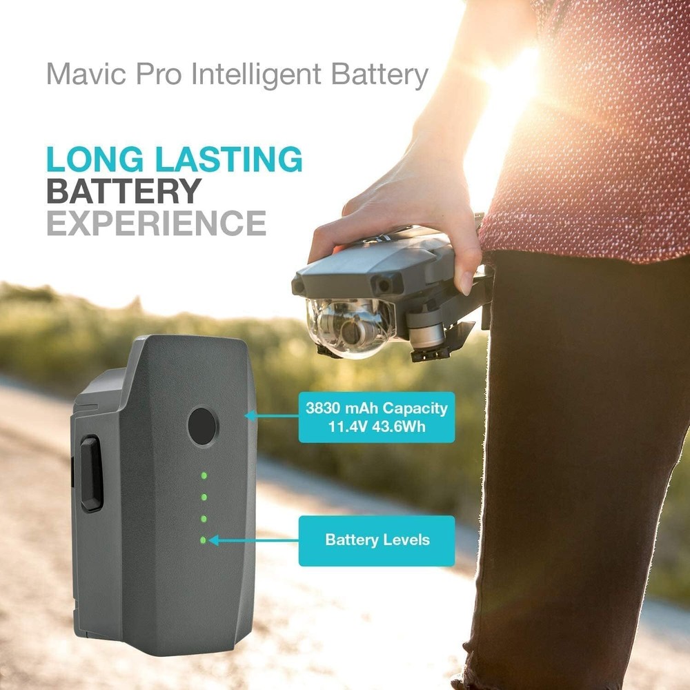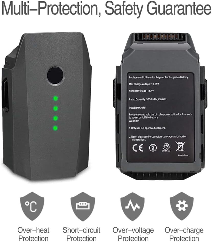 3830mAh 11.4V LiPo Intelligent Flight Battery Compatible for DJI Mavic Pro Drone About this item Intelligent Flight Battery: Cell Type: Rechargeable LiPo | Voltage: 11.4V | Capacity: 3830mAh, it can provide 25-30 minutes of flight time on a single charge, battery life varies with environment and flight mode. 100% Compatibility: The sturdy copper pin can maintain good contact with the drone and the charger. Compatible with DJI Mavic Pro, Mavic Pro Platinum, (NOT fit for Mavic 2) Built-in 4 LED indicator lights to show how much power, that is remaining at the touch of a button. Built-in intelligent charge and discharge protecting IC that can prevent batteries from short-circuit, over-charge, over-discharge, over-voltage, over-current, and over-heating Product Description Specifications: Battery type: Lithium-Polymer Battery Output voltage: 11.4V Capacity: 3830mAh Power: 43.6Wh Battery Weight: 230g /8.11oz Power ON/OFF: Press once and holder the circular power button for 2 seconds to power on/off Compatible with: DJI Mavic Pro DJI Mavic Pro Platinum DJI Mavic Pro Alpine White Original DJI Mavic Pro Charger Not compatible with DJI Marvic 2 NOTE: Please fully charged the battery before the first-time flight, and make several times flight test to make sure the battery fits your Mavic Pro Drone. And better charge with the OEM charger to avoid problems. Product Guarantee: Any problem, please feel free to contact us. Please click the "Ask a question" on our storefront or in "YOUR ORDER" options click the "contact seller". Tips: 1. Please fully charge the battery before each use. 2. Do not subject batteries to adverse conditions such as extreme temperature, deep cycling. Never leave a charging lithium battery unattended. 3. When the battery is unused, please take it out from the drone and store it in a dry, clean, cool, away from heat and metal objects. 4. When the battery is not used for a long time, we recommend using the battery at least once every two to three weeks. 5. After use, it is recommended that the battery be cooled and then recharged.