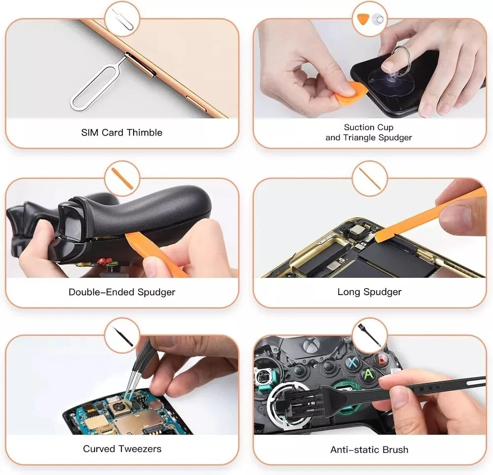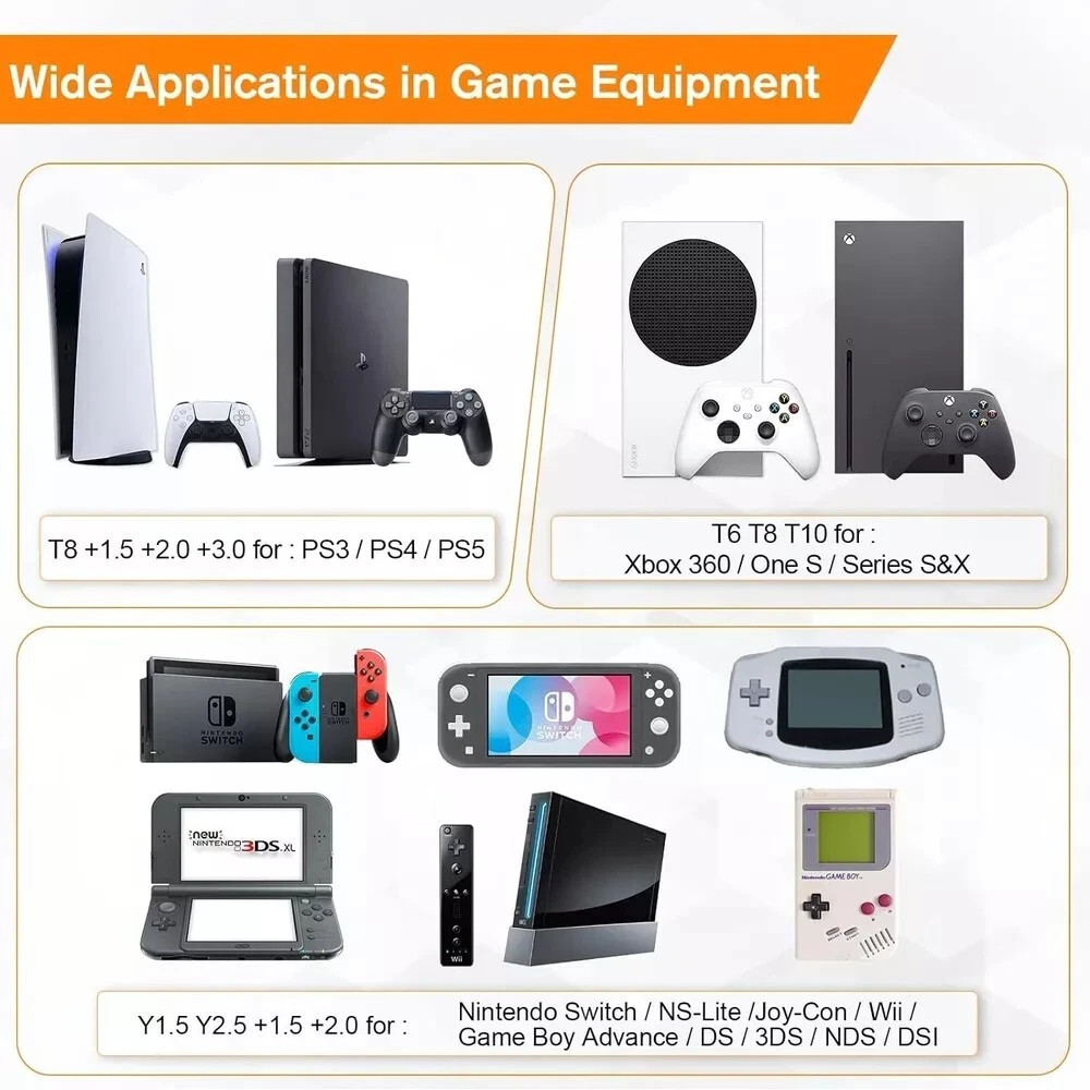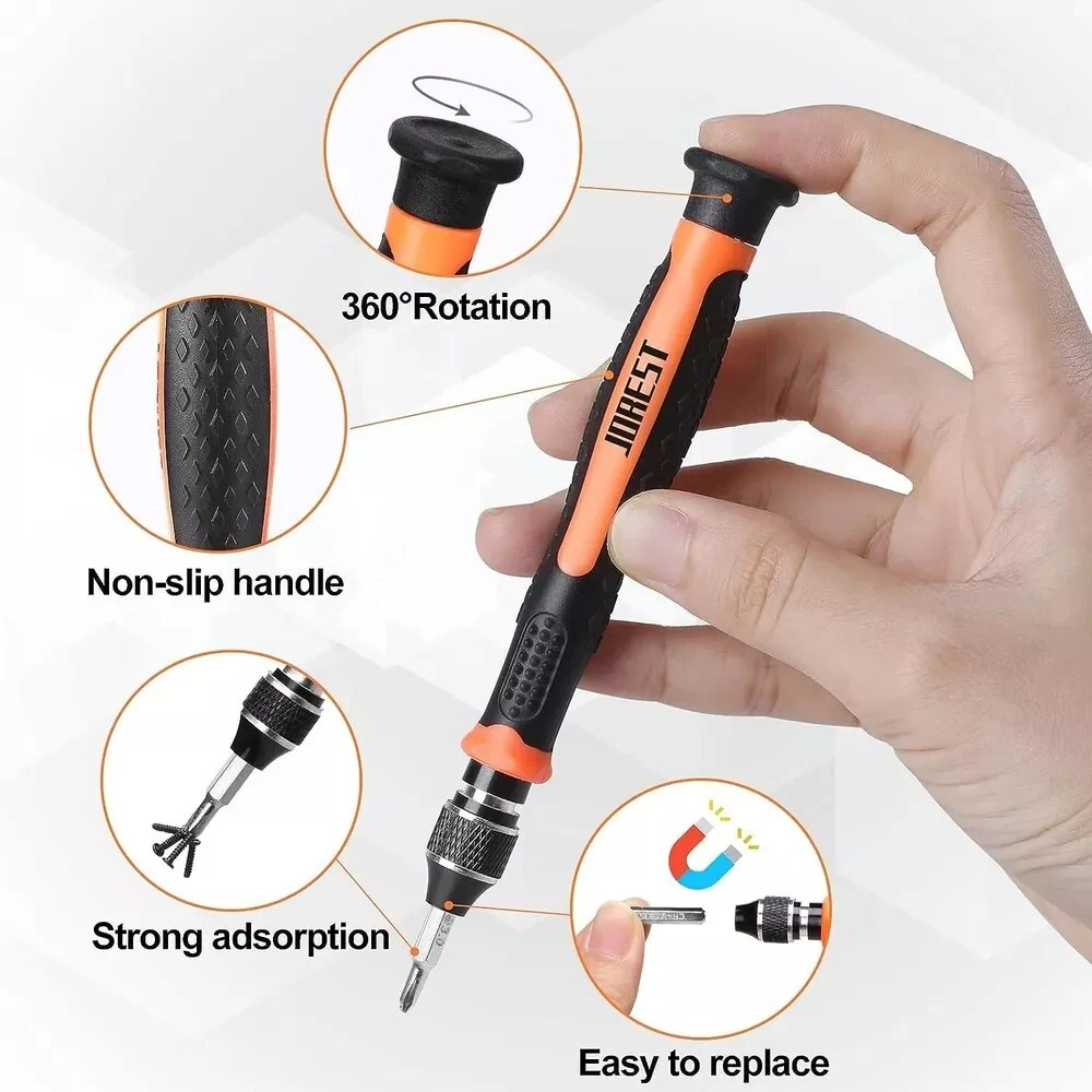 38-Piece Precision Screwdriver Set - Torx T5, T6, Y00 Mini Repair Tool Kit for Electronics 【Precision screwdriver set】 -- 38Pcs screwdriver set has 30 CRV screwdriver bits which are phillips PH000(+1.2) PH000(+1.5) PH00(+2.0) PH0(+3.0) PH1(+4.0), flathead -0.8 -1.2 -1.5 -2.5 -3.0, torx T1 T2 T3 T4 T5, torx security TR6 TR7 TR8 TR9 TR10 TR15 TR20, triwing Y000(Y0.6) Y00(Y1.5) Y0(Y2.5) Y1(Y3.0), pentalobe P2(0.8) P5(1.2) P6(1.5), MID 2.5, with a screwdriver handle, a double-ended spudger, a long spudger, a triangle spudger, Tweezers, a cleaning brush and a suction cup with SIM card thimble. 【Slip-resistant rotatable handle 】-- All our screwdriver bits are made of high quality CR-V chrome vanadium steel. CR-V screwdriver bits do not rust easily and are not prone to be broken. The screwdriver handle is made of TPR and PP materials, with a special non-slip design, offering a sense of comfortable. The top of the handle is rotatable design which makes it more convenient to remove the screws; the handle head and the screw head has magnetic adsorption which can quickly replace the screws. 【Portable gadgets】 -- The triangular spudger is more suitable for opening the screen of the mobile phone.The double-ended spudger is more suitable for opening the back cover of game devices. The long spudger can pry the internal parts of the device.The suction cup can open the screen, which is more convenient to repair the mobile phone.The SIM card thimble can be used to replace the SIM card of the mobile phone. The cleaning brush can clean the dust of the device.Tweezers can grip small parts.