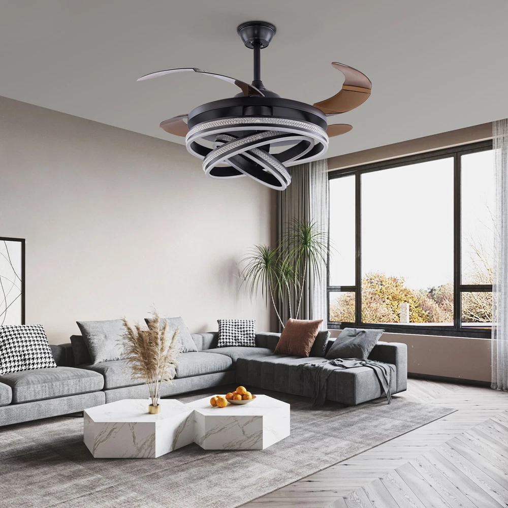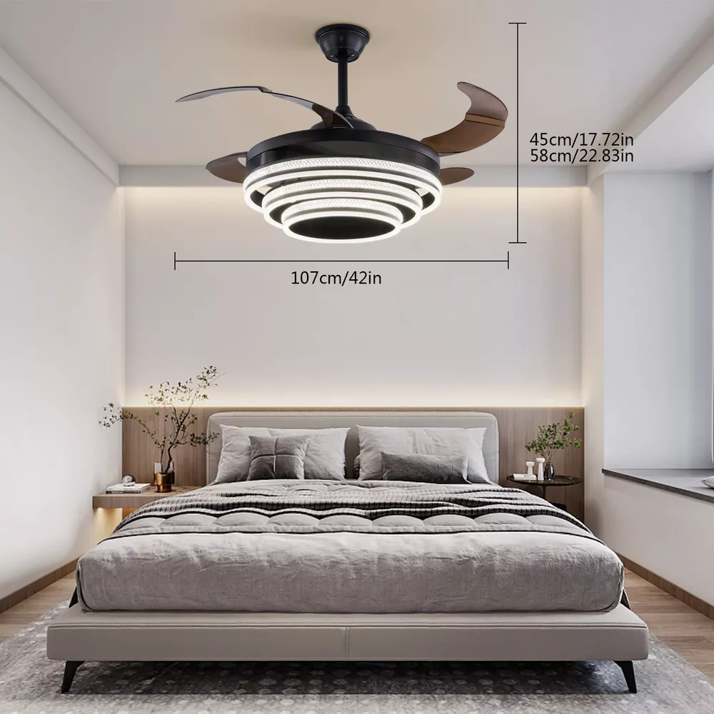 Specification Color: Black Material: Aluminum, Hardware, Iron, Acrylic Surface Treatment: Paint Baking and Electroplating Style: Modern Shape: Round Light Source Type: LED Color of Light: White Light(3000k), Warm Light(4500k), Neutral Light(6300k) Power: 18W Voltage: 110-240V Efficiency: E Luminous Flux: 1800 Lumen Number of Items: 1 Number of Speeds: 6 Timing Range: 1/2/4h Assembly Required: Yes Mount Type: Ceiling-mounted Product Diamter: 107cm/42inch Product Height: 45cm/17.72inch, 58cm/22.83inch Rod Length: 12cm/4.8inch, 25cm/9.8inch First-tier Lampshade Diameter: 30cm/11.82inch Second-tier Lampshade Diameter: 40cm/15.7inch Third-tier Lampshade Diameter: 50cm/19.68inch Base Diameter: 15cm/5.9inch Applicable Area: 20-25m²/215.28-269.1ft² 3-Color Modern LED Lamp Smart LED Ceiling Fan Light 6 Speeds Timing Range 1/2/4h Welcome~ Description Bright and soft lights can bring charm and warmth to your room, and let you experience a simple but elegant lifestyle. Our ceiling fan light with six speeds and three colors is made of premium aluminum, hardware, iron, and acrylic, and adopts exquisite paint baking, and electroplating technologies, making it beautiful and durable. No matter in day or night, it will be beautiful scenery in your home. Key Features Build to Last: High-quality aluminum, hardware, iron, acrylic, paint baking, and electroplating processes make the product durable, stereoscopic, and solid, so it can better keep practical and beautiful. Excellent Source: The LED light source with a luminous flux of 1800lumen and three colors (white light(3000K), warm light(4500K), and neutral light(6300K)) not only is non-stroboscopic and eye-friendly but also provides you more natural and bright light. Safety Guard: The ground wire connection mode that can quickly lead the current to the ground so that the equipment shell no longer carries electricity, cooling holes, and wide voltage(110-240V) can ensure the safety of you and the light. Comfortable and Convenient: 18W pure copper variable frequency motor with less energy consumption, noise less than 65 decibels, 2-in-1 function (lighting+fan), switchable lights, 6 wind speed, timing function (1/2/4h), and intelligent remote control can bring you more comfortable and convenient experience. Careful Design: The product can be turned forward in summer to meet the cooling demand, and reversed in winter to promote air circulation. In addition, the fan and lamp can be used together or separately, with high-cost performance. Attractive Appearance: The timeless black, smooth lines, and three different colors make the product modern and fashionable and your rooms with various decorative styles luxurious and beautiful. Ideal Gift: With a fashionable appearance, this item can be regarded as a holiday or housewarming gift for parents, friends, and lovers so that they can enjoy a more convenient and emotional life. Effortless Cleaning: The smooth surface and simple structure make it convenient for you to clean with a towel. Details Sturdy Base: The 5.9-inch base increases the stress area, making the product more stable and not easy to fall. Practical Lampshade: It can not only make the light bright but also prevent dust from entering the interior to reduce the cleaning difficulty. Retractable Fan Blades: These wear-resistant blades can not only save space but also have a wide air supply area. Two Rods: Two rods of different sizes (4.8inch, 9.8inch) provide more convenience and flexibility for your installation and use. Application This item is suitable for an area of 215.28-269.1ft² indoors, such as halls, entryways, hallways, foyers, restaurants, studios, double rooms, children’s rooms, bedrooms, exhibition halls, clothing stores, coffee shops, bars, nurseries, shops, play areas, attics, gyms, examination rooms, farmhouses, and other places that require air circulation. It is suitable for installation on the ceiling about 7.55ft from the ground. Specification Color: Black Material: Aluminum, Hardware, Iron, Acrylic Surface Treatment: Paint Baking and Electroplating Style: Modern Shape: Round Light Source Type: LED Color of Light: White Light(3000k), Warm Light(4500k), Neutral Light(6300k) Power: 18W Voltage: 110-240V Efficiency: E Luminous Flux: 1800 Lumen Number of Items: 1 Number of Speeds: 6 Timing Range: 1/2/4h Assembly Required: Yes Mount Type: Ceiling-mounted Product Diamter: 107cm/42inch Product Height: 45cm/17.72inch, 58cm/22.83inch Rod Length: 12cm/4.8inch, 25cm/9.8inch First-tier Lampshade Diameter: 30cm/11.82inch Second-tier Lampshade Diameter: 40cm/15.7inch Third-tier Lampshade Diameter: 50cm/19.68inch Base Diameter: 15cm/5.9inch Applicable Area: 20-25m²/215.28-269.1ft² Battery Type(Not Included): 2*AA Batteries Remote Control Use Range: Within 50m/164.04ft Suitable Height: 2.3m/7.55ft Volume: Less than 65dB Package Included 1* Ceiling Fan Light 1* Remote Control 1* English Manual All Accessories for Installation Notes Please use and install it in strict accordance with the instructions, and pay attention to the safety precautions inside. Please ensure that the power supply has been cut off and tested before installation. Please install it by someone with an electrical license if necessary, and we recommend two people install it together. Please note that the battery of remote control is not included in the package, and you need to prepare 2 AA batteries. Please note that this product does not support step-less color adjustment temperature, and does not have a memory function. Please note that the effective use range of the remote control is within 50m/164.04ft. Please allow the slight color difference caused by the shooting light and 1-3cm error due to manual measurement, and make sure you do not mind before ordering. Welcome to Rongorange Any problem Please Contact the Seller! Payment Delivery details Terms of sales About us Contact us Payment We accept ebay payment 。 Fees such as import duties, taxes are not included in the item p