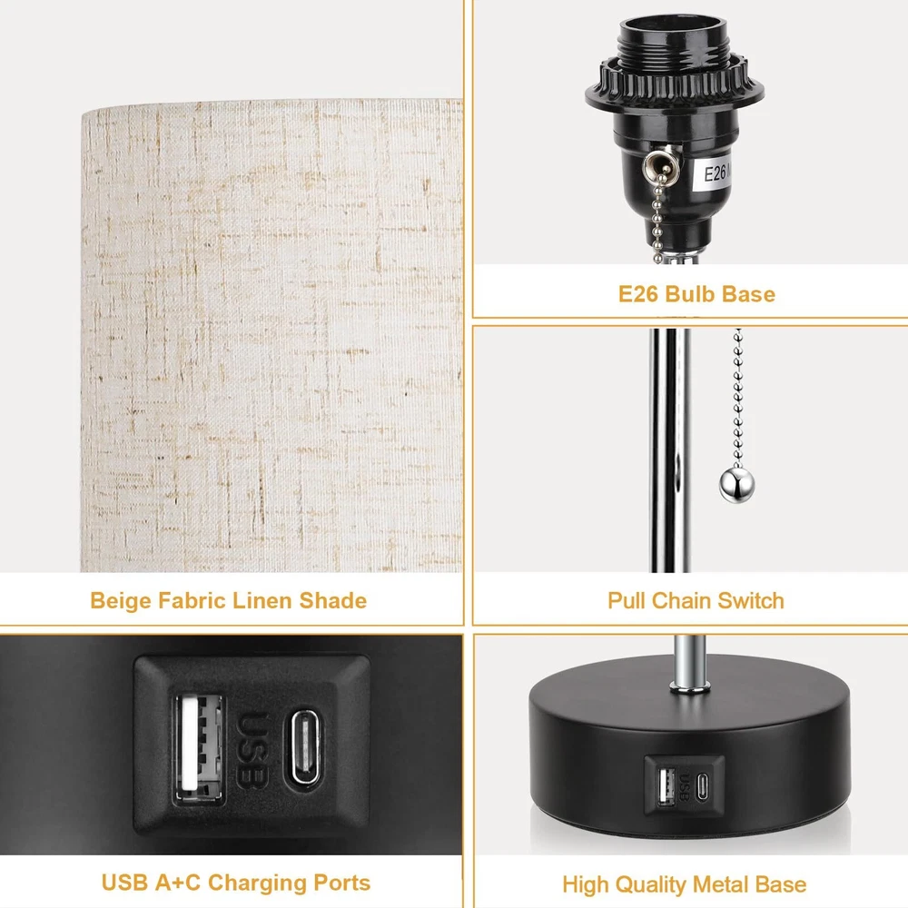 【3-Color Temperature Bedroom Lamp】The small desk lamp comes with a 9W LED light bulb, it has 3 color temperature modes (3000K/4000K/5000K) which can meet your different needs in different scenarios. You can change the light by pulling the chain. Different Modes creates a different atmosphere. 【USB A&C Fast Charging Ports 】The modern table lamp for bedroom euipped with USB A and C charging ports (5V/2.1A) for fast charging, getting your phones, humidifier, kindle, headsets, speaker and other electronics fully charged. And what the greatest advantage of our nursery lamp is that whether the lamp is on or off, these charging ports can still keep working. 【Free LED Bulb Included】 For your convenience, there is free bulb in the package to save you from the trouble of purchasing bulb. The light bulb emits 3000K/4000K/5000K 800LM light with only 9 watts consumption, which is super energy-saving and environmentally friendly, greatly saves you electricity bills. What's most important is that the bulb has no flicker, no dizziness, and can protect your eyes efficiently. 【Minimalist Design for Home】 The USB table lamp with the minimalist design, makes it be a perfect addition to your home.The fabric shade and black metal base is perfect to decorate anywhere at your house. It's a great choice to take this night stand lamp as a gift for your friends, family. A perfect bed side lamp for living room, bedroom, study room, room, den, nursery. 【Eye Protection Glow】The gray lampshade is stylish and sturdy, and also it can soft the light radiation to protect your eyes and give your bedroom a soft tone. Our small table Lamp cteates a nice and comforting feeling in the house when spending time with your family as the linen fabric shade softens the light making it better for protecting your eyes.