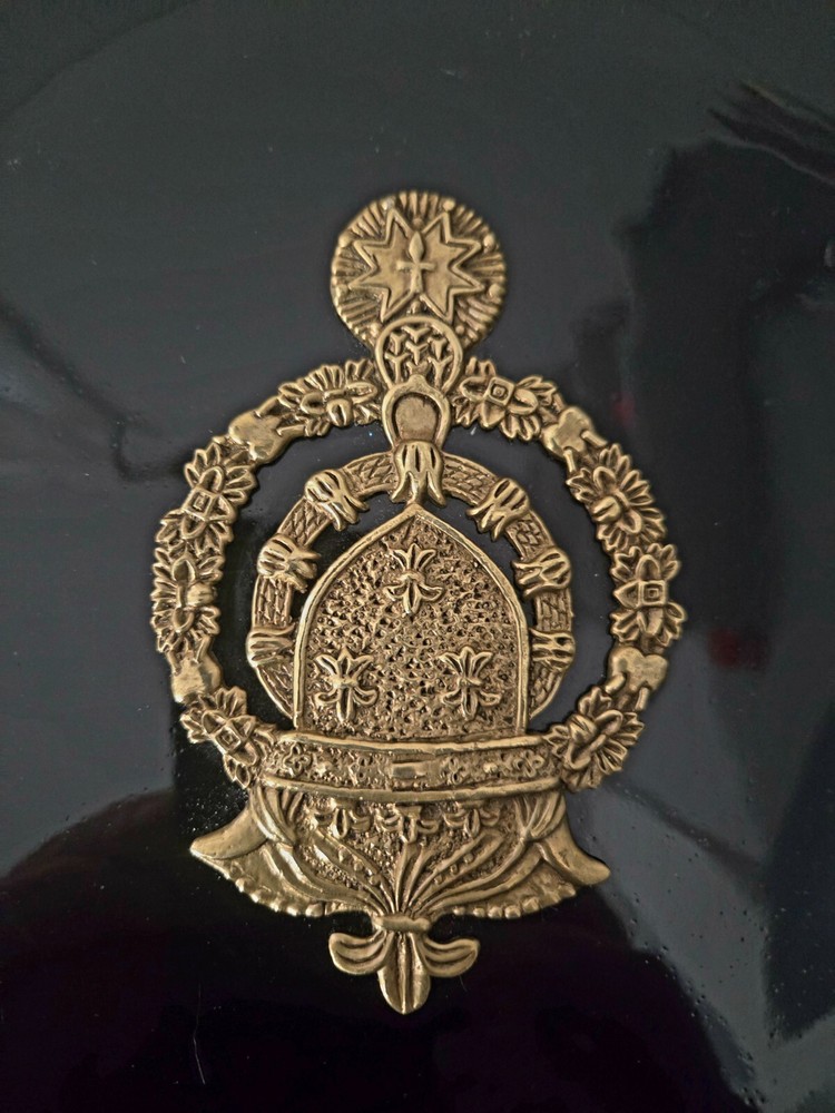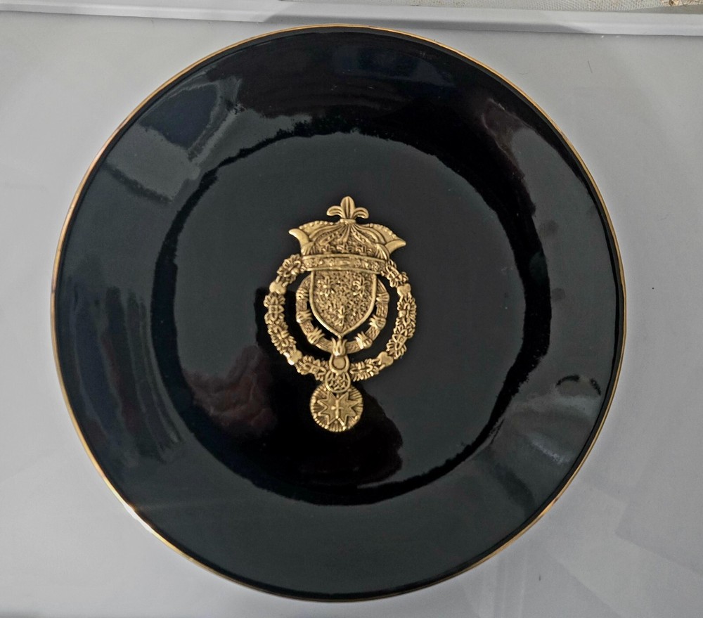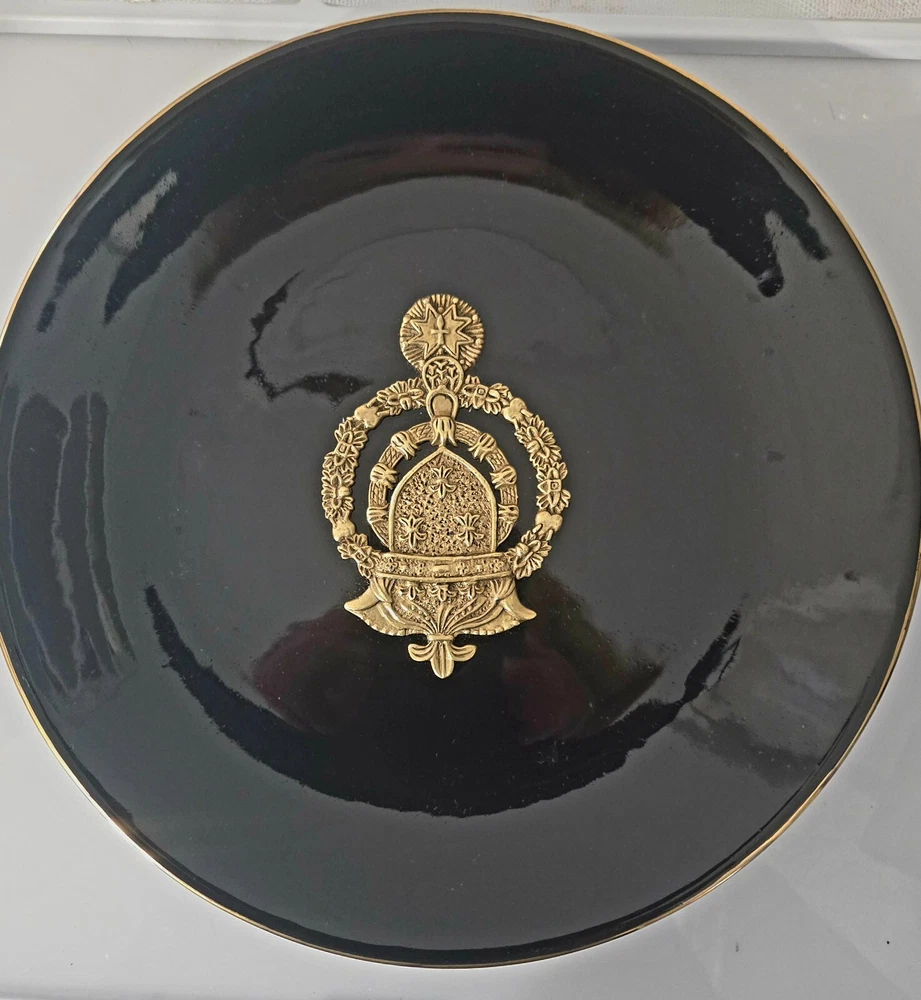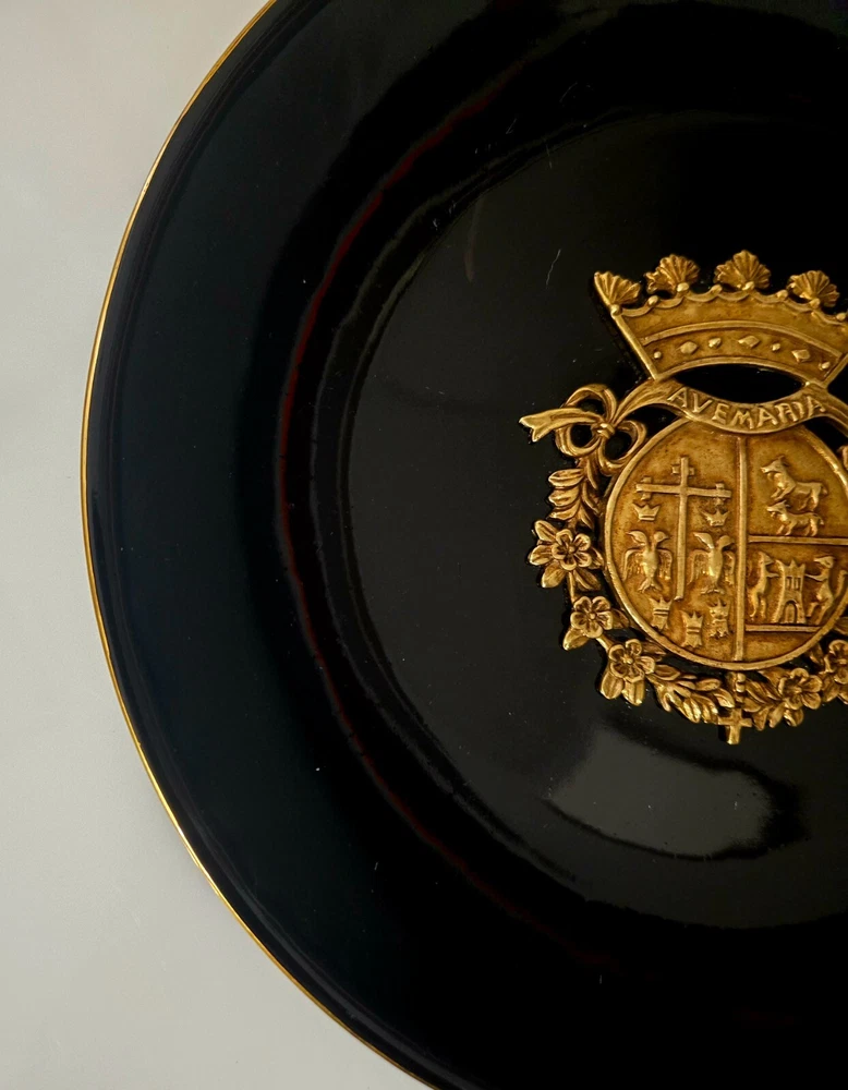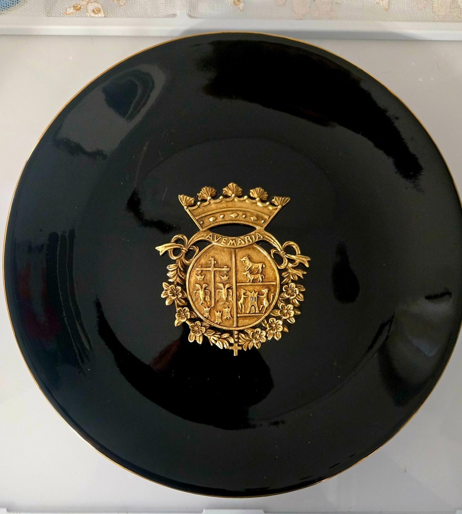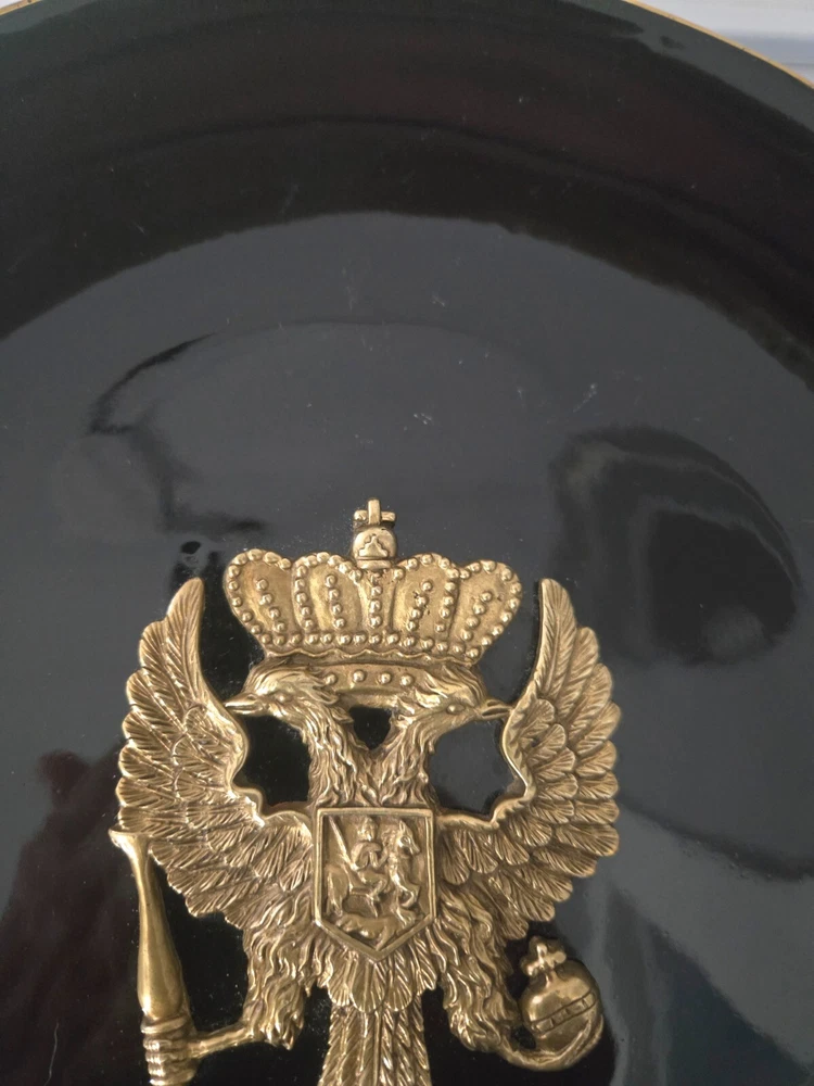 The product is a set of three heavy black ceramic collector plates with a round shape and a diameter of 10.5 inches. Each plate features a 3D brass design of various coat of arms representing Russia and Spain. These decorative plates are intended for hanging on the wall and would make a unique addition to any collector's display. There is some normal wear -- see pictures. The intricate designs and cultural significance of the coat of arms add a touch of history and elegance to these collector items. J083