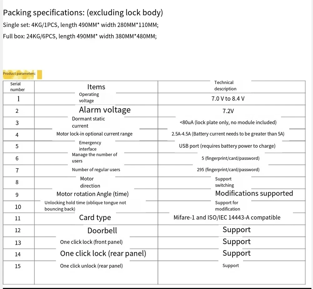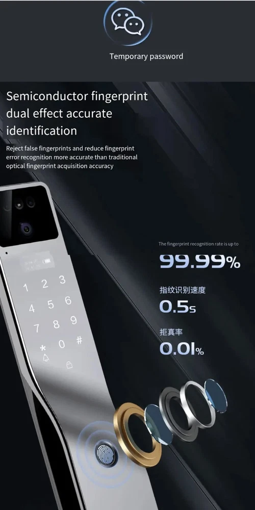 Video Description 00:12 00:28 Features: What's the difference between 518 and 688? 1.5 unlocking methods: WiFi remote unlocking, fingerprint unlocking, PIN code, card, mechanical key unlocking; 2. Convenient APP management system, you can manage smart locks anytime and anywhere; 3. One click biometric fingerprint access. 4. Query the unlocking records anytime and anywhere to know your family safety at the first time; 5. It is suitable for all kinds of moritse of 99% doors, especially for European standard 85 and 72 (CC size) series. 6. Type-c interface emergency power supply; 7. We can customize production according to your requirements, OEM/ODM; 8. The market uses 240 nylon polishing process, and we use the new 320 nylon polishing process to make the surface more smooth and bright 9. The panel size is larger, so we expand the size to fit and cover the old door opening. 10. The newly upgraded backplane is fully sealed, with better water resistance 11. New mobile phone glass curved surface technology is used to upgrade our smart lock glass curved surface to 2.5R, making the surface smooth and beautiful 12. The new door lock handle size conforms to the ergonomic hand type, and the handle glass curve surface process is specially customized Technical specification: material: aluminum alloy, glass Available colors: black, silver, gold Panel size: L 300 (mm) * W 68 (mm) Unlocking method: WIFI, M1 card, pass code, fingerprint, wrist strap or key Application name: Tuya application or tt lock application Support system: IOS7.0 or Android 4.4 or higher Battery life: 10000 times of normal opening (12 months) Power supply: DC6V, 4 alkaline batteries Quiescent current: 45Ua Dynamic current:<200Ma Unlocking time: 0.5-1 seconds Old 528:280 (L) * 65 (W) mm New 688:300 (L) * 68 (W) mm IP65 outdoor waterproof Product Description