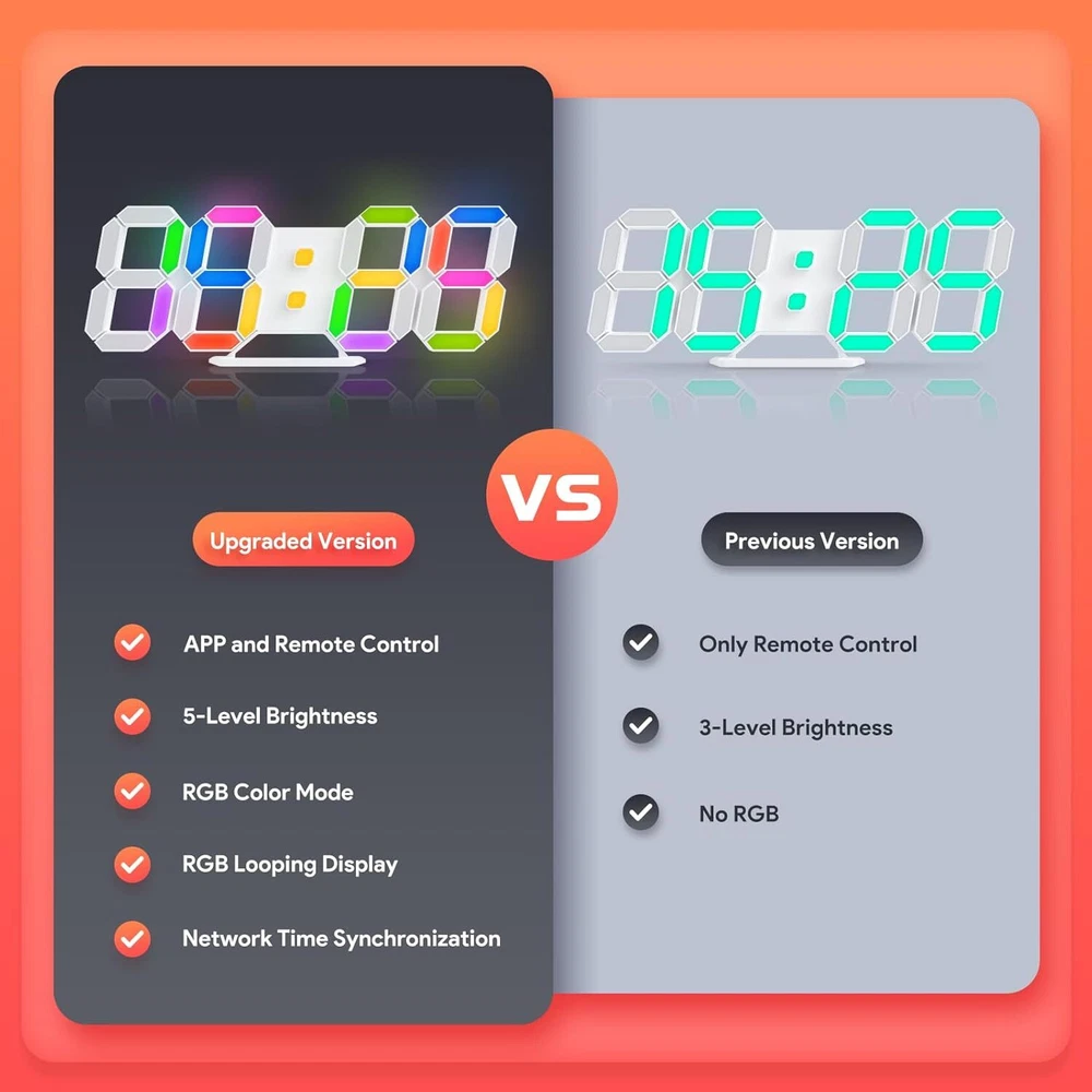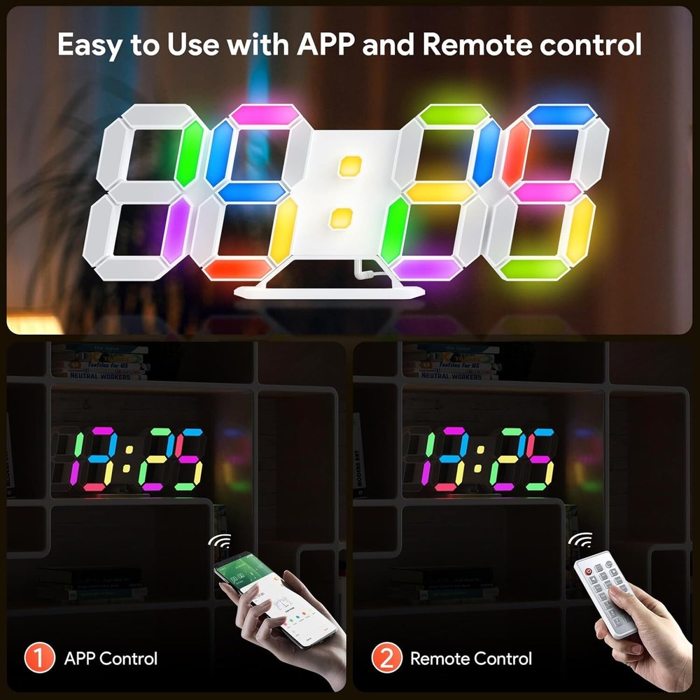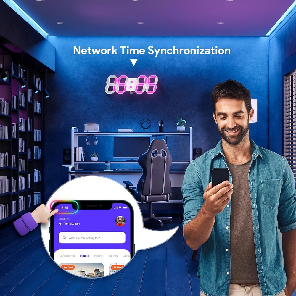 RGB LED LIGHT CLOCK - Enjoy an improved color display compared to any previous LED clock, featuring RGB colors in a spectrum of 7 shades. The neon digital clock serves as an extraordinary gift for a gaming room, suitable for both wall or desk decor. This 3d LED clock is a fantastic addition to any gaming enthusiast's space. NETWORK TIME SYNCHRONIZATION - Compared with previous clocks, this neon light 3d LED clock automatically syncs with mobile network time, ensuring accurate time display at all times without the need for manual adjustments. POWER SUPPLY - The 3d led desk clock is powered by USB cable only, not battery. You can hide the power wire behind some items or into the wall. (Note: The USB Adapter is not included in the package but a cable is provided) 9.7’’ MULTICOLOR DISPLAY SCREEN - This RGB LED digital clock features a dynamic, multicolor LED display screen that shows you the time, date, and temperature at a glance. What’s more, this hanging digital clock features large LED numbers that are clear and easily readable, making it perfect for checking the time at night or from a considerable distance. APP/REMOTE CONTROL - Evolving from traditional remote control, this clock now offers APP control, providing a more convenient method to configure all desk/wall clock functions. Suitable for Various Places - Versatile in its placement, this digital neon light large number clock can be positioned on a desktop or wall-mounted, catering to various settings such as a bedside clock, desk clock, or a stylish addition to living room, bedroom, classroom, meeting room, college room decor, or a gaming room.
