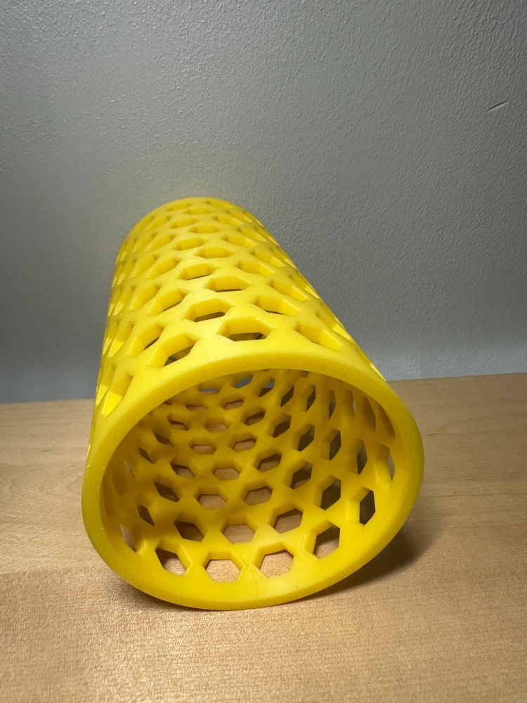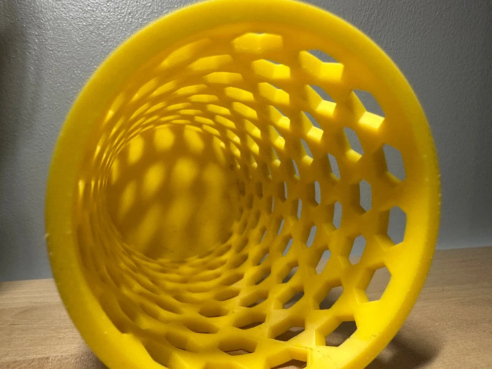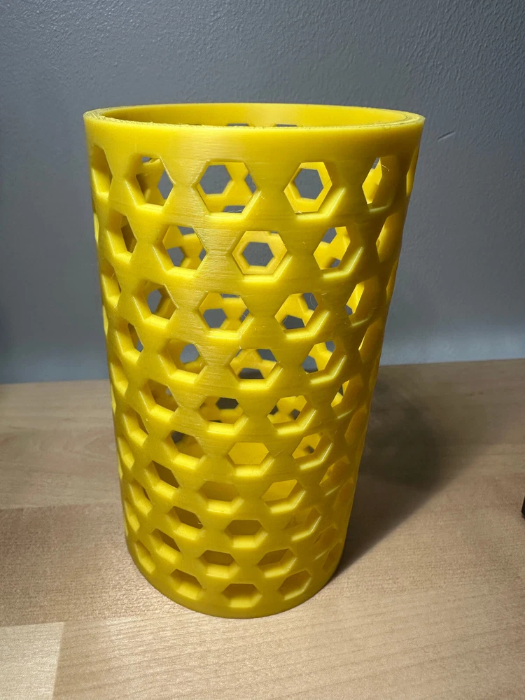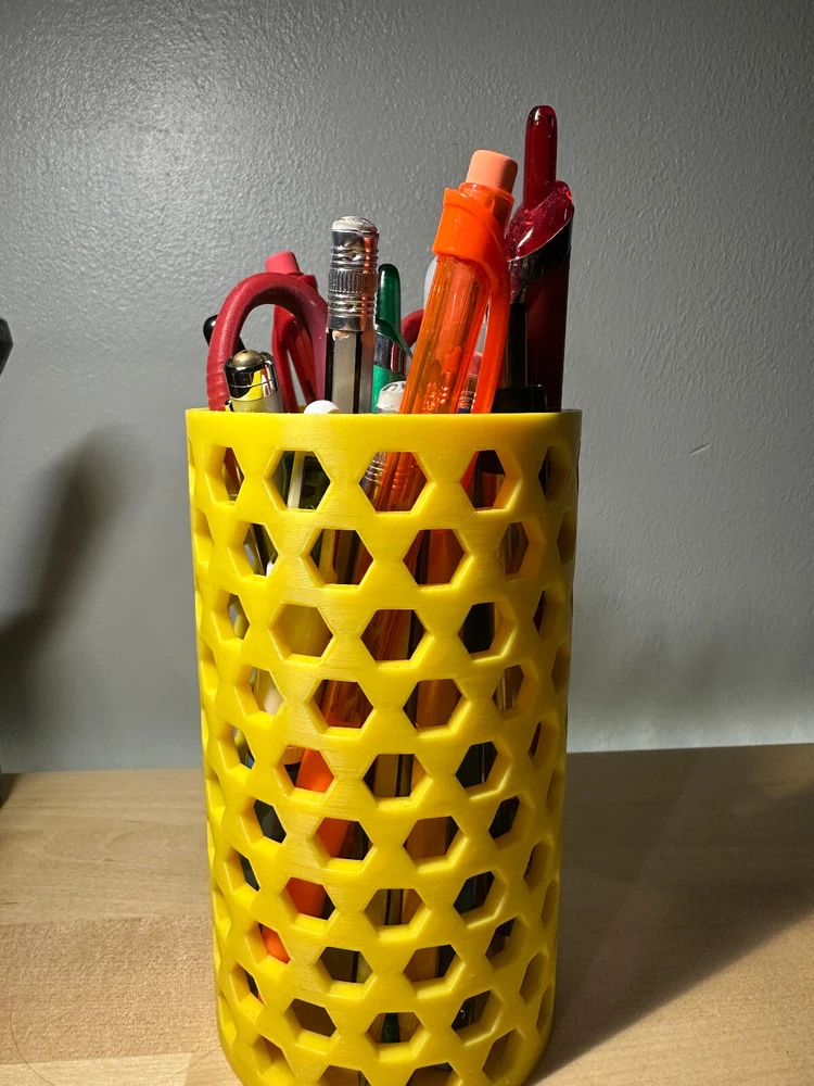 3D printed container for anything but will most likely be used for pen/pencils. I designed this myself in Shapr3D. If you want to 3d print this yourself here is my makerworld profile. https://makerworld.com/en/@Mangomaster