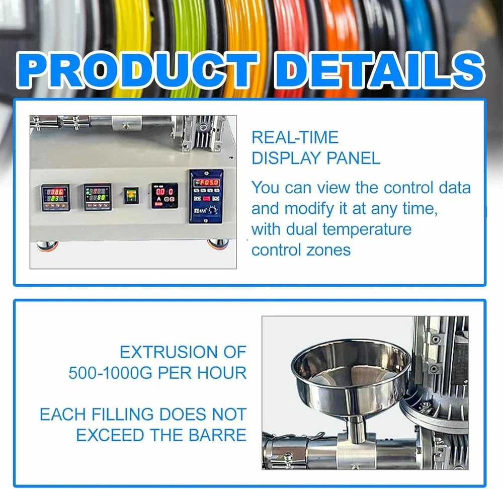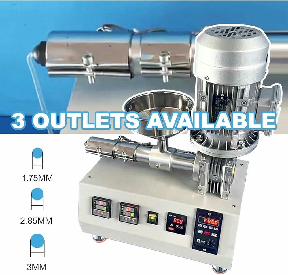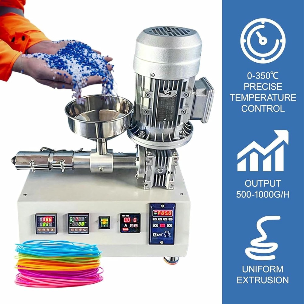 Specifications Temperature Control Range: 0-350°C Power: 1000W Extrusion Speed: 500-1000 grams/hour Screw Diameter: 20 mm Outlet Sizes: 0.175 cm / 0.285 cm / 0.3 cm Compatible Materials: PE, PP, PS, PA, ABS, PET, TPU, PVC (soft) Product Description This 3D Printing Filament Extruder is designed to be space-saving and portable, featuring a user-friendly interface and an easy-to-clean single-screw mechanism. It is ideal for home labs, schools, or 3D printing studios. Service : If you have any questions about this product, feel free to contact us at any time, and we will reply within 24 hours! Wide Material Compatibility : Compatible with a variety of materials including PE, PP, PS, PA, ABS, PET, TPU, and soft PVC pellets. The filament diameter can be adjusted to match your 3D printer's requirements (0.175 cm / 0.285 cm / 0.3 cm). Precise Temperature Control (0-350°C) : With adjustable PID temperature control, this extruder can handle various materials such as TPU, ABS, PET, and PVC. The dual temperature control zones ensure stable melting and reduce the risk of clogging. This compact 1000W extruder is designed for high-speed production, capable of producing up to 1000 grams of filament per hour. It is perfect for small studios, laboratories, or DIY 3D printing enthusiasts. Specifications Temperature Control Range : 0-350°C Power : 1000W Extrusion Speed : 500-1000 grams/hour Screw Diameter : 20 mm Outlet Sizes : 0.175 cm / 0.285 cm / 0.3 cm Compatible Materials : PE, PP, PS, PA, ABS, PET, TPU, PVC (soft) Package Contents Desktop Plastic Pellet Extruder × 1 This 3D printing filament extruder offers a versatile and efficient solution for filament production, making it an essential tool for any 3D printing workspace. Shipping & Handling Return & Refund Payment Warranty & Feedback Shipping & Handling Handling Time: Shipping is usually made in 1-5 business days after payments cleared. Orders are processed from Monday-Friday; Not on the weekends & public holidays,If the machine you order includes voltage or mold, please note the voltage or size you need when ordering so that we can arrange delivery for you! Shipping Time: Items are shipped via SpeedPAK or DHL or any other shipping method that suits your country and we will choose a reasonable method for you. Sales tax/Customs duties: Any sales taxes or Customs duties are not included. If you have any requirements for the declared amount, please contact us. Please note: Buyers from certain remote countries may need to contact us prior to payment. You may be asked to pay for additional shipping costs charged by the shipping company or the order may be automatically cancelled due to insufficient payment of shipping costs. Return & Refund If you are not 100% happy with your purchase, please contact us. Please don't directly opened a request or case without informing us,We are committed to 100% customer satisfaction and we can solve any problem for you, provided you contact us. All returns must be made within 14 days of delivery date. Items must be in new, unused condition, with all original materials included with the shipment. A partial refund may be applied for opened or damaged items, depending on the condition. If the machine is returned without any damage, the return shipping cost must be borne by the buyer and the original shipping cost will be deducted from the refund. Returns that are the result of our seller's error,Buyer will receive a full refund of the item as well as shipping charges. If product was received damaged or not as described, please send us some pictures or videos, so we could well understand your problem, then solve them for you ASAP. Besides, it's much helpful for us to claim with express, remind our related department to pay much more attention to packaging later on. Hope for your understanding. After receiving the machine and inspecting all its accessories, we will arrange a refund for you. After the refund, eBay will process your refund for you. Please receive the refund promptly. Payment Please accomplish payment within 7 days after purchase. If you do have any reason cannot make payment timely, kindly please email me.If the best bids fail to make timely payments, the system will automatically cancel the order. Please rest assured of payment, ebay will guarantee your fund security. Import duties, taxes and charges are not included in the item price or shipping and handling. These charges are the buyer's responsibility. Warranty & Feedback 1 year warranty for the machines, not for the consumables. We stand behind our products all the item, so even if your warranty period has expired, you can still seek for service or technical support from us with low cost. Any warranty shipping cost to us is responsible by buyer. We committee to the customer satisfaction and want to bring you the best purchase experience. If there is any problems, please contact us ASAP. If not, please leave us a positive feedback as it's very important for us. Thanks very much. Business Hour: Monday To Friday: 9:00 AM to 6:00 PM (Beijing China time) Due to time zones, our reply to your questions may not be immediately. But we will reply your email within 24 hours. Please feel free to contact us if you have any questions.