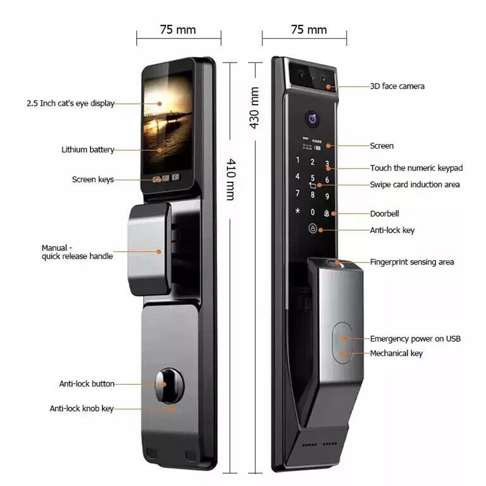 Professional German Nail Clippers for Thick Nails, Stainless Steel Nail Clippers 11.36 USD 11.89 USD Free shipping 4% off Car Under LED Strip RGB DIY LED Strip Underbody System Neon Light Kit &Remote US 19.8 USD 22.0 USD Free shipping 10% off Wireless WiFi Smart Video Doorbell Phone Door Ring Intercom Security Camera Bell 27.84 USD 32.0 USD Free shipping 13% off Wireless Headphones Bluetooth Noise Cancelling Stereo Earphones Over Ear Headset 18.99 USD Free shipping Kids Smart Watch GPS Tracker SOS Call Camera Phone Watches For Boys Girls Safe 15.67 USD 16.49 USD Free shipping 5% off German Nail Clipper,Ultra Sharp Stainless Steel Nail Clippers for Men Women US 11.89 USD Free shipping Products Description 1. High strength aluminium alloy material, corrosion resistance. 2.4200mAh lithium battery power supply, reusable charging,environmental protection. Normal continuous use for 6 months 3.100 fingerprints, password, IC card can be input. 4. After closing the door, the latch will pop out and lock automatically. 5. The door can be opened with key in any condition. 6. Even if the power is off, the fingerprint, password and IC card data will not be lost 7. The alarm will sound automatically when the power is low, and the alarm will also be given if theunlocking is unsuccessful for many times. 8. If battery is power off, there is USB port as emergency charge. Special Features : 3D Face Recognition, Built-in Camera, Built-in Doorbell, Built-in Screen, NIGHT VISION, Tamper Alarm, Two-way Audio,WIFI, usmart go app Unlock way : APP +Fingerprint + Password + Card + Key+Face Material :Aluminum alloy Mortise : 6068/240*24mm Color :Black Power supply :7.4V Lithium-ion Rechargeable Batteris Weight(kgs) : 5.5Kg Size : 75*430mm Door thickness : 40mm - 120mm Work Temperature : -20-7 Please Note: Communication is the best way to solve the problem.Your satisfaction is our top priority. We appreciate your positive feedback! We have always been committed to providing the best service and reliable products to every customer. However, accidents may occur at times, and we understand your concerns and setbacks. Please contact us to resolve the issue before leaving negative feedback. You may also like 1x-2x Corn Cob Peeler Stainless Steel Thresher Stripper Remover Kitchen Cut Tool 3.99 USD Free shipping Solar Water Pump Controller MPPT Funtion Brushless DC Regulator For Well Pump 72.0 USD Free shipping Wireless Bluetooth5.0 Receiver Adapter Stereo Audio 3.5mm Jack AUX for Home Car 15.49 USD Free shipping Long Range Bluetooth 5.3 Transmitter Receiver For TV Home Stereo Audio Adapter 16.99 USD Free shipping Mini 2.0 USB-Powered Desktop Speakersfor Pcs and Laptops with Volume Control 20.89 USD Free shipping Bluetooth 5.0 Earbuds Wireless Earphones TWS Stereo Deep Bass in-Ear Headphones 11.69 USD Free shipping