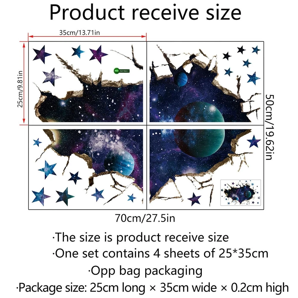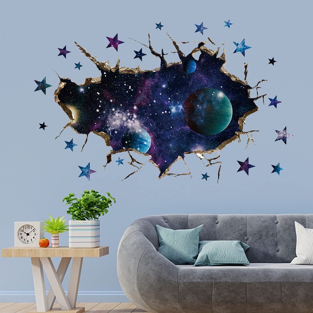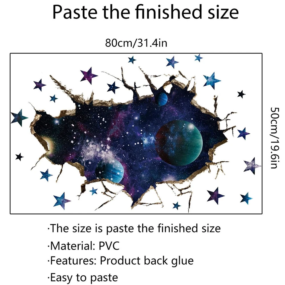 3D Space Galaxy Wall Decor Stickers, Removable Broken Outer Space Planet Waterproof Vinyl Floor Decals, 3D Art Magic Wall Mural Decals for Bedroom Living Room Home Wall Decor Product Details Brand: ASMPIO Color: Multicolor Item dimensions L x W x H: 0.28 x 9.84 x 13.82 inches Recommended Uses For Product: Window Theme: Cartoon,Cat,Magic,Space Cartoon Character: 3D Space Galaxy Special Feature: Waterproof Number of Pieces: 4 Style: 装饰艺术 Age Range (Description): Kid Brand: ASMPIO Color: Multicolor Item dimensions L x W x H: 0.28 x 9.84 x 13.82 inches Recommended Uses For Product: Window Theme: Cartoon,Cat,Magic,Space Cartoon Character: 3D Space Galaxy Special Feature: Waterproof Number of Pieces: 4 Style: 装饰艺术 Age Range (Description): Kid Reusability: Single Use Item Form: Sheet Pattern: Cartoon Indoor/Outdoor Usage: Indoor Finish Type: Polished Animal theme: Cat Water Resistance Level: Waterproof Number of Items: 4 UPC: 785382594216 Product Dimensions: 0.28 x 9.84 x 13.82 inches Item Weight: 2.39 ounces Manufacturer: ASMPIO Item model number: 1 Date First Available: July 22, 2021 Package & Size4 Sheets of cartoon cat wall stickers with a size of 35 x 25cm/13.7 x 9.8 in (L x W), after finish size 50cm80cm/19.6 31.4 inch. Premium Material The 3D Space wall decals are made of premium self-adhesive PVC with high-resolution colorful printing. Safe, non-toxic, waterproof, no easy tear. It can be removed easily and will not leave residues, friendly to the wall, will last for years without fading, wrinkling, or peeling. Easy to Stick & PeelThey are pre-cut stickers, each animal and pattern sticker has been polished. You just need to peel them off and stick them on the smooth, clean and dry surface, there is no need for additional glue. Decoration ScenesThis vivid outer space blue cosmic wall decal is suitable to decorate bedroom, living room, and also perfect for doors, windows, closet, floor decoration, ceiling decor, home decorations, space exhibition hall, amusement parks. Great gift for like Christmas, birthday. 3D Design3D effect technology can create incredible views and depicting a vast universe scene. This outer space decals will bring a colorful refreshing change to walls, will transform your room in seconds, unique, a fun and creative way of decorations. Specification:Item Type: Removable Wall StickersMaterial: PVC and paperPattern: DIY 3D Space Galaxy Wall StickersPackage Contents: 4 Sheets of cartoon animal wall stickers with a size of 35 x 25cm/13.7 x 9.8 in (L x W)Easy to use:Before you paste the stickers, please ensure the surface is clean and dry without any spot, dirt or water; just need to peel and stick them on the smooth; It is normal to find out some bubbles when you complete, just press the bubble out.Notes:1.Before use, please make sure that the surface is smooth, level, clean, dry and non-porous, so as to avoid the problem of falling decals2.Since the size is measured manually,please allow a slight deviation in the measurement data