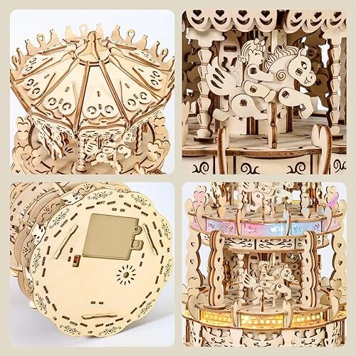 3D Wooden Puzzles for Adults LED Carousel - DIY Crafts Model Music Box