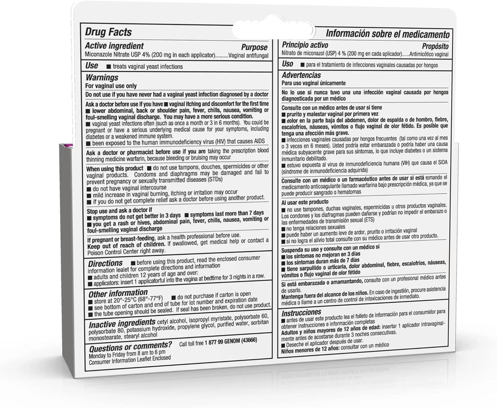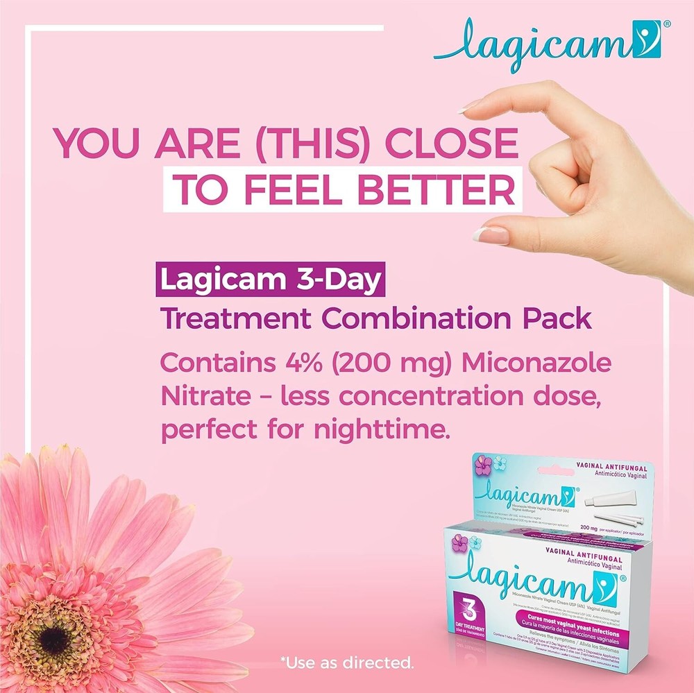 aginal Yeast Infection, Antifungal 3 Day Miconazole Nitrate Treatment Cream, Relief for Itching, Burning, Odor and Discharge, 3 Applicators TREATMENT IN JUST 3 DAYS: Lagicam's Vaginal Yeast Infection Antifungal 3 Day Treatment Cream cures most vaginal yeast infections and works from Day 1 to relieve associated symptoms such as itching, burning, irritation, odor, and discharge FIGHT FUNGI: A yeast infection is a common condition caused by overgrowth of yeast which lives in the vaginal area. Your doctor may call this infection “vaginal candidiasis” or "vaginitis". Our anti-fungal cream eliminates the fungi that causes infection READY-TO USE TREATMENT: Each treatment contains 200 mg of Miconazole Nitrate, a powerful antifungal ingredient to treat vaginal yeast infections and relieve external itching and irritation. Product includes 3 disposable applicators and 1 tube of anti-fungal cream SOOTHE SYMPTOMS: Lagicam's Antifungal Treatment Cream works from Day 1 to relieve the symptoms of a vaginal yeast infection including: itching, burning, irritation, malodor, and discharge. Treat the infection and soothe symptoms at the same time FAST ACTING RELIEF: Lagicam offers a convenient and effective treatment that starts working on the first day for women who don’t want a 1-week treatment. For use by adults and children 12 s of age and over: use one filled applicator at bedtime for 3 consecutive nights Starts working on the first day. Eliminates the fungi that cause yeast infections. Relieves the itching, burning, irritation, malodor and discharge associated with yeast infection. Lagicam active ingredient, Miconazole nitrate cream 4% is one of the leading OTC treatments for yeast infections. Lagicam offers a convenient and effective treatment course for women who don’t want a 1-week treatment. Cura la mayoría de las infecciones es por levadura. Comienza a trabajar desde el primer día Elimina los hongos que causan infecciones es por levaduras Alivia la comezón, quemazón, irritación, mal olor y flujo asociado con la infección por levadura El ingrediente activo en Lagicam, Nitrato de miconazol crema 4%, es uno de los principales tratamientos OTC para infecciones es por levadura Lagicam ofrece un curso de tratamiento cómodo y eficaz para las mujeres que no queremos un tratamiento de 1 semana. Cures most yeast infections.