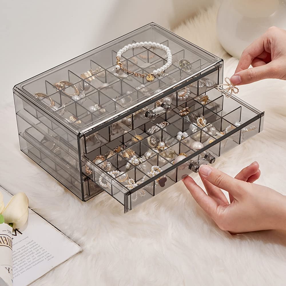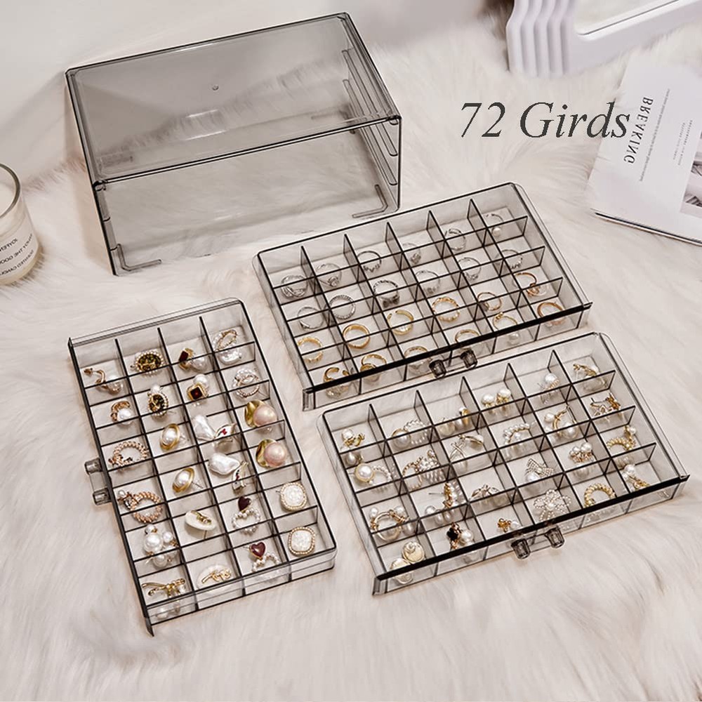 Clear Jewelry Box: Jewelry box is made of clear material, keeps your ring and earring organized in separate space and displayed 3 Layer Drawers: Removable and clear drawers design makes it easy to find your items, you can take earrings you need easily by pull out the drawers Large Capacity: This acrylic earring storage box has 3 drawers with 72 grids, total Size 8.5 x 5.5 x 3.5 inches, each compartments size 1.26 x 1.26 inches Dustproof Jewelry Organizer: Jewelry box with lid keeps your jewelry free from dust and tangles, you can clean the box can just with a damp cloth Awesome Gift: Fits most small size jewelry, earring, necklaces, rings and it will be an excellent addition on your dresser