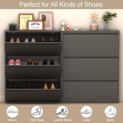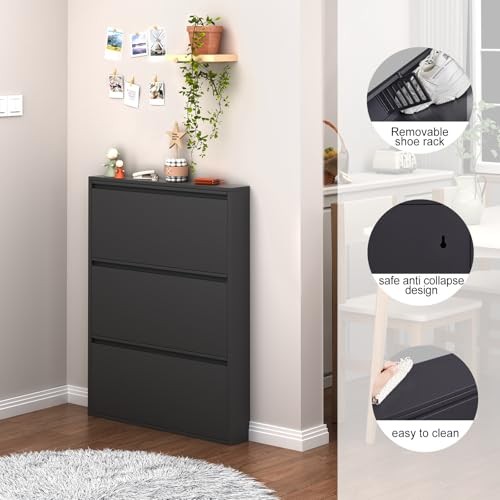 This shoe cabinet is a game-changer for small spaces! The sleek black metal design looks modern and fits perfectly in my entryway. The three flip drawers hold all my shoes neatly, and assembly was quick. Love how sturdy and space-saving it is—highly recommend for anyone needing smart storage! Fast shipping and great seller too.