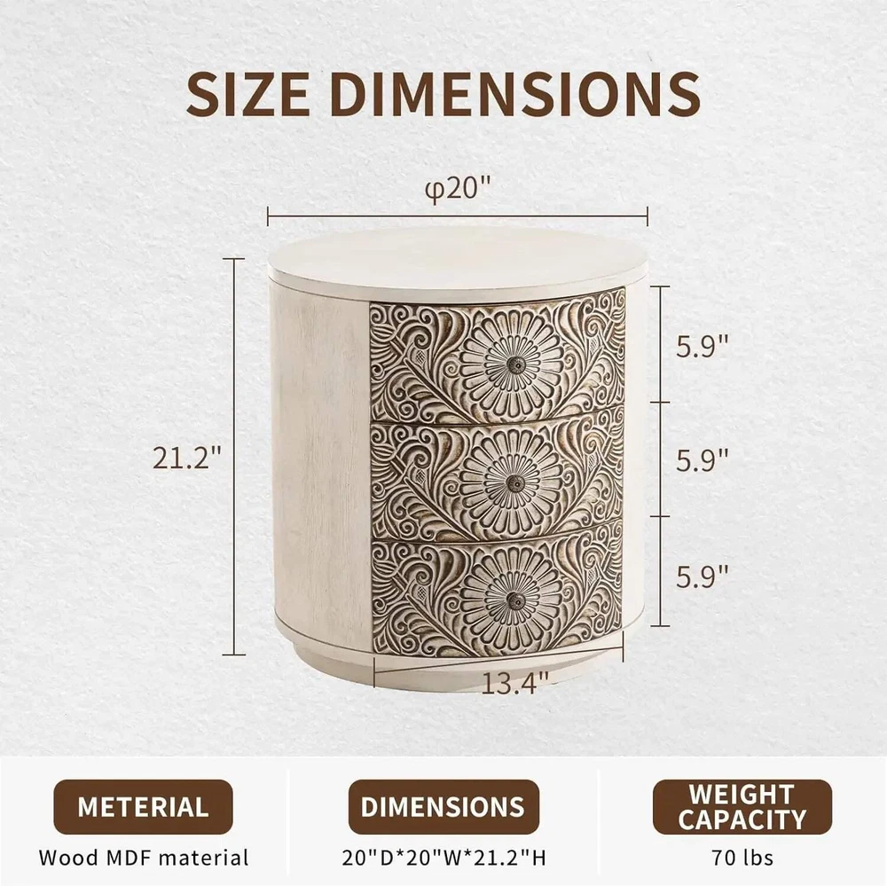 3 Drawer Chest of Drawers Round Storage Cabinet Nightstand Bedside Table Introducing the Ljustra 3 Drawer Chest of Drawers Transform your living space with our multi-functional 3 Drawer Chest of Drawers. This stylish round storage cabinet is perfect as a nightstand, side table, or a chic storage solution for your accessories. Product Specifications Dimensions: 20"D x 20"W x 21"H Material: Medium-Density Fiberboard (MDF) Design: Retro Whitewash Finish, Round Shape Why Choose the Ljustra 3 Drawer Chest? Versatile Use: Perfect for various settings, from bedrooms to living rooms, allowing you to keep your essentials organized. Unique Design: The round shape and vintage pattern offer a modern yet timeless appeal that complements any decor style. Quality Craftsmanship: Made from high-quality MDF, this chest is durable and performs better than traditional wood. Ample Storage: With three drawers, you can easily organize your items, making your space clutter-free. Safety First: The rounded edges ensure safety, while the easy-to-use drawer handles make accessing your belongings a breeze. Invest in the Ljustra 3 Drawer Chest of Drawers today and elevate the charm of your home while enjoying functional storage solutions! Explore more from Ljustra Nightstand furniture Home Decor 3 Drawer Chest of Drawers Round Storage Cabinet Nightstand Bedside Table Introducing the Ljustra 3 Drawer Chest of Drawers Transform your living space with our multi-functional 3 Drawer Chest of Drawers . This stylish round storage cabinet is perfect as a nightstand, side table, or a chic storage solution for your accessories. Product Specifications Dimensions: 20"D x 20"W x 21"H Material: Medium-Density Fiberboard (MDF) Design: Retro Whitewash Finish, Round Shape Why Choose the Ljustra 3 Drawer Chest? Versatile Use: Perfect for various settings, from bedrooms to living rooms, allowing you to keep your essentials organized. Unique Design: The round shape and vintage pattern offer a modern yet timeless appeal that complements any decor style. Quality Craftsmanship: Made from high-quality MDF, this chest is durable and performs better than traditional wood. Ample Storage: With three drawers, you can easily organize your items, making your space clutter-free. Safety First: The rounded edges ensure safety, while the easy-to-use drawer handles make accessing your belongings a breeze. Invest in the Ljustra 3 Drawer Chest of Drawers today and elevate the charm of your home while enjoying functional storage solutions! Explore more from Ljustra Nightstand furniture Home Decor × × × × × × × × × × × × × Shipping info Click the Shipping & Payments tab above the listing description for more info FREE Shipping Click the Shipping & Payments tab above the listing description for more info! Additional delivery notes PICK UP OPTION Sorry, our items are NOT available for pick-up. PAYMENT Immediate payment is required upon selecting "Buy It Now" or upon checking out through the cart. We accept payment via U.S. PayPal accounts and all Major Credit Cards, Debit Cards & Google Pay. We are legally required to collect sales tax in those states and localities where we maintain a physical presence (nexus). The applicable amount of sales tax charged to an order will be calculated based on the shipment destination's state and local sales tax laws. Thank you for shopping with us on eBay! Additional Information No additional information at this time Ask seller a question You might also like Modern Black U-Shaped Corduroy Sectional Sofa w/ Chaise Lounges, 130" Wide Ljustra 104" L-Shape Modular Couch - Modern Comfy Upholstered Sectional Sofa for Luxurious 3 Piece Velvet Chesterfield Living Room Sofa Set Ljustra 110 Inch Sleeper Sofa Sectional Bed with Storage Chaise Contact To contact our Customer Service Team, simply click the button here and our Customer Service team will be happy to assist. Ask seller a question © My Store Shipping & Payments Shipping is FREE for this item Payment Accepted Payment Methods Immediate payment is required upon selecting "Buy It Now" or upon checking out through the cart. We accept payment via U.S. PayPal accounts and all Major Credit Cards, Debit Cards & Google Pay. We are legally required to collect sales tax in those states and localities where we maintain a physical presence (nexus). The applicable amount of sales tax charged to an order will be calculated based on the shipment destination's state and local sales tax laws. Thank you for shopping with us on eBay! Returns Returns are accepted Items must be returned within 14 days of the auction ending Buyer will pay for return shipping. eBay integration by