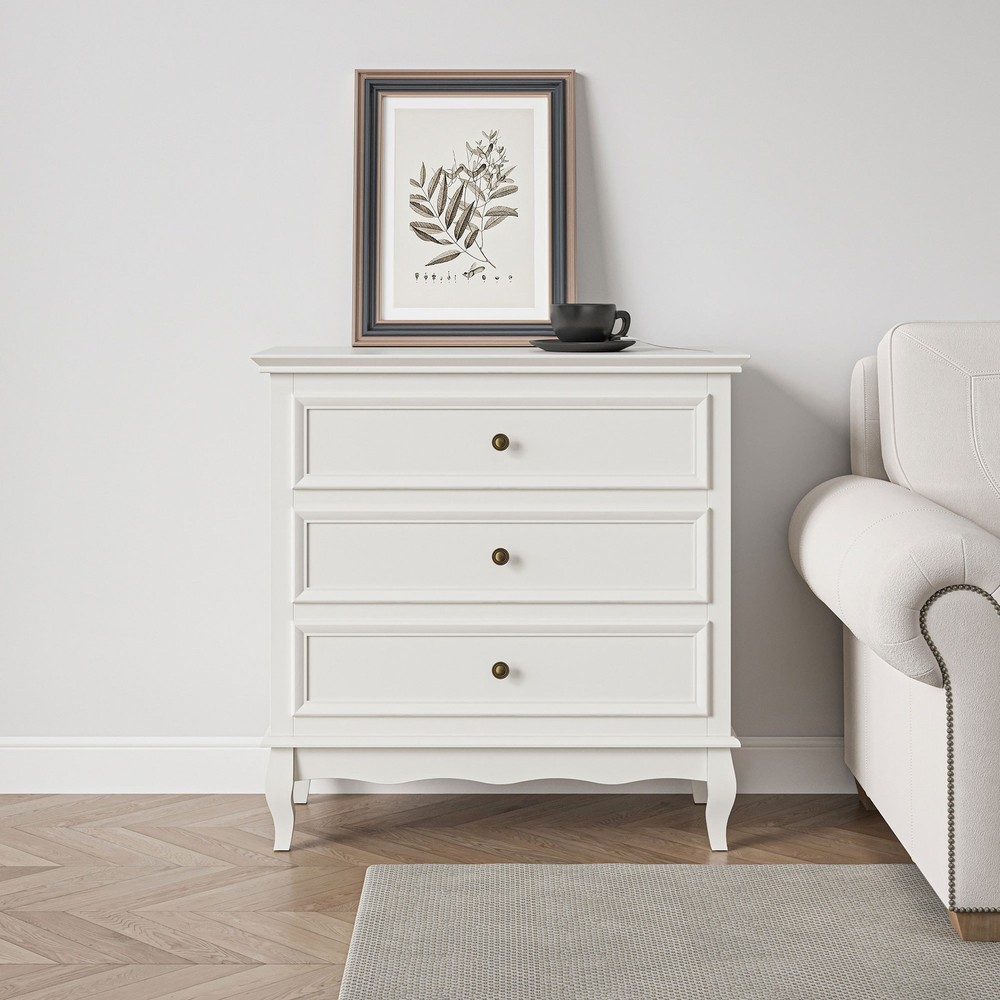 Unveiling modern elegance with a vintage twist, our 3 drawer dresser showcases decorative molding on table corners, adorned with round handles, a wavelike bottom, and uniquely styled legs, epitomizing the charm of modern shabby chic. Crafted with a sturdy wood frame for stability and coated with eco-conscious paint for safety, it becomes an ideal choice for you. Featuring 5 drawers for organized storage, this dresser effortlessly fits into your daily scenes. In the bedroom, it excels as an organizer for clothes and essentials. In the nursery, it serves as a reliable storage nook for baby supplies. Stepping into the living room, it seamlessly transforms into a sofa side table. This dresser isn't just furniture; it adapts to your life with a practical touch, making every moment a bit more Free Shipping Over $49.99* Details 3 - Drawer Dresser Product Description: Unveiling modern elegance with a vintage twist, our 3 drawer dresser showcases decorative molding on table corners, adorned with round handles, a wavelike bottom, and uniquely styled legs, epitomizing the charm of modern shabby chic. Crafted with a sturdy wood frame for stability and coated with eco-conscious paint for safety, it becomes an ideal choice for you. Featuring 5 drawers for organized storage, this dresser effortlessly fits into your daily scenes. In the bedroom, it excels as an organizer for clothes and essentials. In the nursery, it serves as a reliable storage nook for baby supplies. Stepping into the living room, it seamlessly transforms into a sofa side table. This dresser isn't just furniture; it adapts to your life with a practical touch, making every moment a bit more organized. Features Space-Savvy Storage- With dimensions of 31.5"L x 16"W x 31.5"H, this dresser maximizes storage efficiency, boasting a spacious tabletop and 3 large drawers for clothes, blankets, and toys. Sustainable Construction- Crafted with P2-grade MDF and sturdy solid wood legs, our table ensures durability. The safe paint finish adds elegance without emitting strong odors. Modern Shabby Chic- Featuring decorative molded table corners, zinc alloy handles, a wave-shaped bottom, and distinctive wooden legs, our dresser seamlessly blends modern aesthetics with classic elegance. Steady Design- With a decorative wave-shaped reinforcement strip, this dresser elevates aesthetics while ensuring heightened stability. The anti-tip design at the back adds an extra layer of security. Improved Drawer Mechanism- Equipped with silent anti-derailment slides, this dresser highlights a modernized drawer performance, ensuring a serene environment with its effortlessly quiet movement. Adaptable Design- Ideal for use as a bedroom nightstand, nursery storage solution, entryway console, or a living room sofa side table, this versatile furniture effortlessly meets diverse needs. Specification Product Type3-Drawer Dresser ColorWhite MaterialP2 Grade MDF, Rubberwood Overall Dimensions31.5" L x 16" W x 31.5" H Drawer Dimensions24.5" L x 11.5" W x 4" H Weight Capacity of Countertop180 lbs Weight Capacity of Drawer30 lbs CertificationCPSIA Paint Certified
