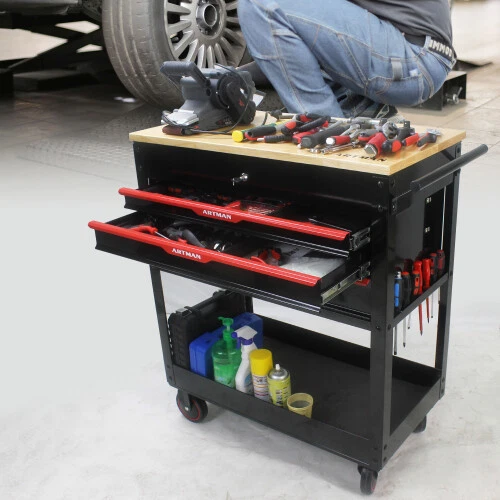 Package Size Length (in.): 33.46 Width (in.): 19.48 Height (in.): 18.50 Weight (lbs.): 92.60 Product Features High Capacity Large Storage Cabinet Adjustable Shelf, for Warehouse, Workshop Garage Organizer Cart with 3 Drawers Tool Chest The opening and closing of the drawers of the tool cabinet is very gentle thanks to the ball-bearing drawers Description One Side with Handle Tool trolley with side handles for free movement Large Storage Basket Large storage basket on the bottom of the tool cart for a large number of tools Solid Wood Top Top cover with solid wood top is the perfect work surface.There is also a lockable cabinet on top of the tool cart to store important tools or parts. Product Information Product Name 3 DRAWERS MULTIFUNCTIONAL TOOL CART Material Metal Product Size 31.88*17.51*38.38 Package Size 33.46*19.48*18.50 Color Black+Red Net Weight 37.8KG Gross Weight 42.2KG