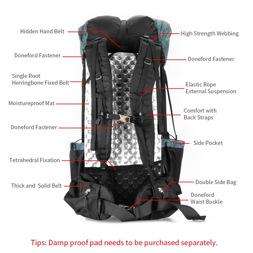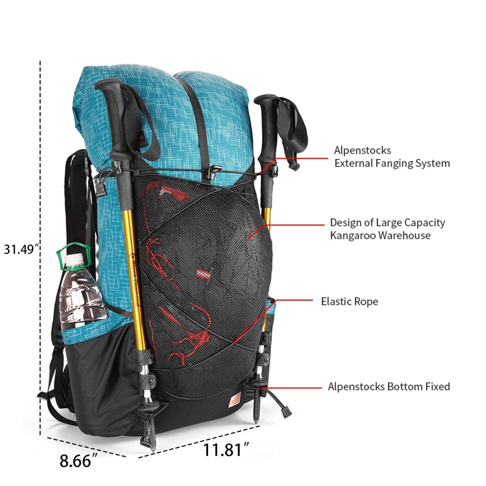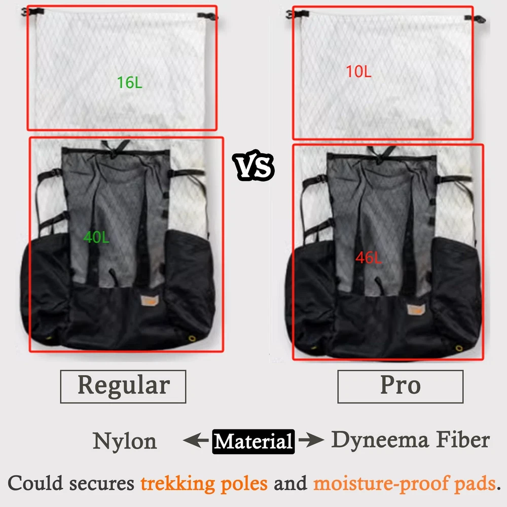 It weights 1.87lb only LARGE CAPACITY:This mountaineering rucksack is designed to carry your trekking pole and ice-axe. The regular version has a capacity of 40+16L while the version has a capacity of 46+10L.The front cross elastic mesh allows for quick and easy attachment of clothing, hats, and other frequently accessed items. Size: 80*30*22cm/31.4*11.8*8.6inch. DURABIE AND PRATICAL: This backpacking pack is made of high quality 210D nylon, which is not only durable and long-lasting, but also has the function of preventing tears and scratches, and also has waterproof performance to prevent the entry of light rain. The adjustable straps and padded back ensure maximum comfort even during extended wear.And this backpack also secures trekking poles and moisture-proof pads for added peace of mind on your back! COMFORTABLE DAYPACK: This climbing backpack is specially designed for traveling enthusiasts, ergonomic padded shoulder straps and back support,gives you more comfortable feeling.ventilation and easing burden.Sturdy frame and high-nylon extend service life. Breathable mesh shoulder straps with plentiful sponge padding help relieve the from your shoulder. Widened and thickened S-type shoulder straps and high elastic breathable back support for best. LIGHTWEIGHT: The lightweight backpacking backpack is made of durable water resistant Polyester. It weights 1.87lb(Reguar)/1.94lb() only. And the regular is the nylon fabric, the is the Dyneema Fiber. Featuring its classic silhouette,the convenient and comfortable pack is great for Backpacking use. Quality & Professional After-sales Service: We are committed to providing our customers with high-quality products. We provide customers with excellent after-sales service, if you have any questions, please feel free to us via .