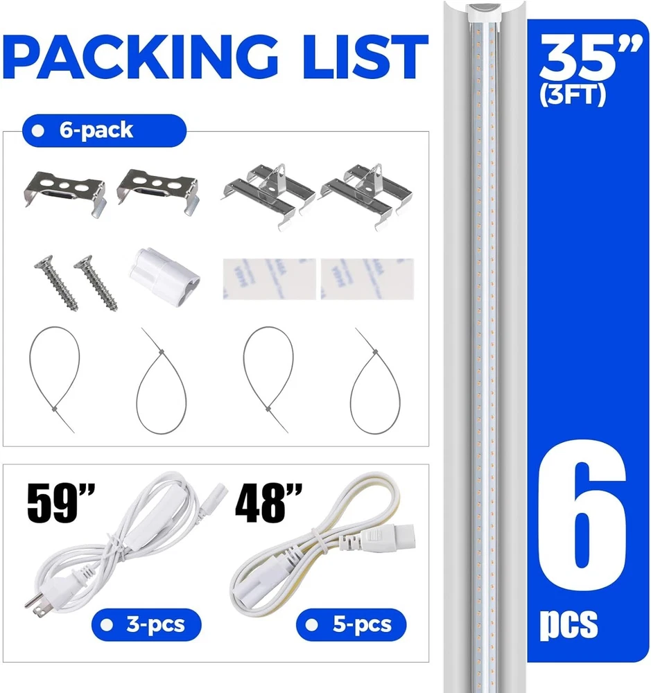 Grow Lights, 3FT Full Spectrum Plant Light, 180W6 x 30W, 1000W Equivalent, T8 Growing Lamp Fixture, LED Grow Light Strips for Indoor Plants, Greenhouse, able Design, Yellow, 6-Pack New Upgrade: Please note that we have a product new upgrade. If you need to connect new and old products, make sure to use the new male-female connector cables. The second generation is designed to be safer, preventing accidental electrical connections caused by human error Full Spectrum LED Grow Light: T8 grow lights 3ft provide indoor plants with full-spectrum sunlight . It provides the most reasonable grow light wave based on the ratio of the absorption of the plants. Is a great option for plants that in seedling, vegetative and flowering cycle Super Bright & High PPFD: These 3ft led grow lights consume only 180W with 864 LEDS totally, replace 1000w general plant grow lights. Over 95% light energy can be absorbed by plants. It works extremely well for your plant grow tents, plant grow shelves, seedling cultivation, hydroponic rooms, greenhouses, etc V-shaped Reflector & High Efficiency: The light efficiency can be increased by 17~20% with reflector, providing you with the best light intensity. The shell of our t8 led grow light was made of 100% aluminum which provides the high-efficiency heat dissipation. Ensuring the longer service life of the led chips Easy Installation: With included tape, clips and cable ties, you could install the grow light bulbs by yourself in minutes. Just plug in and light up, and you could up to 8 plant light strip in a series What You Get: 6 x LED Grow lights 3FT (Yellow Color), 3 x Power cords with ON/OFF switch, 5 x Connecting Cords(48''), 6 x Small Connectors, 24x Installation Clips, 12 x Tapes, 24 x cable ties
