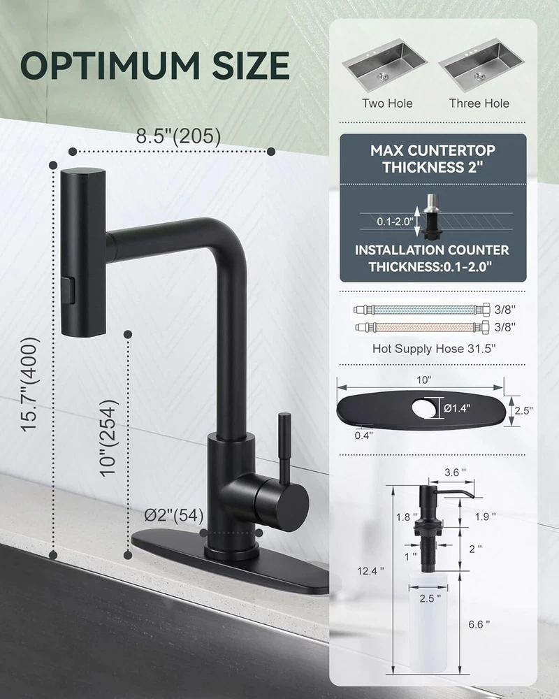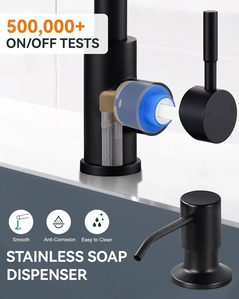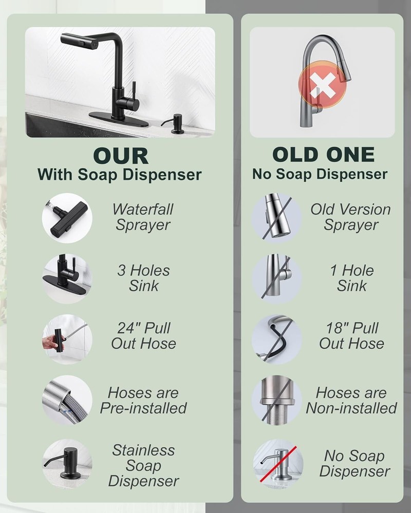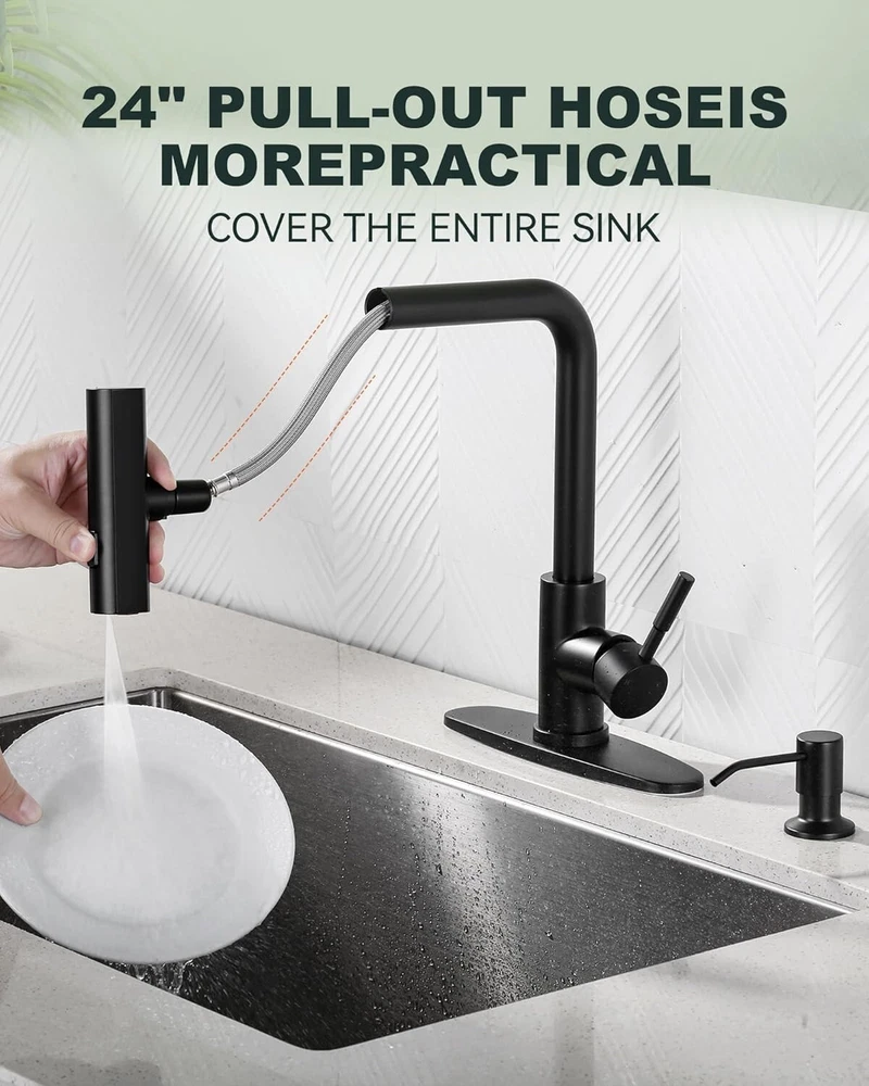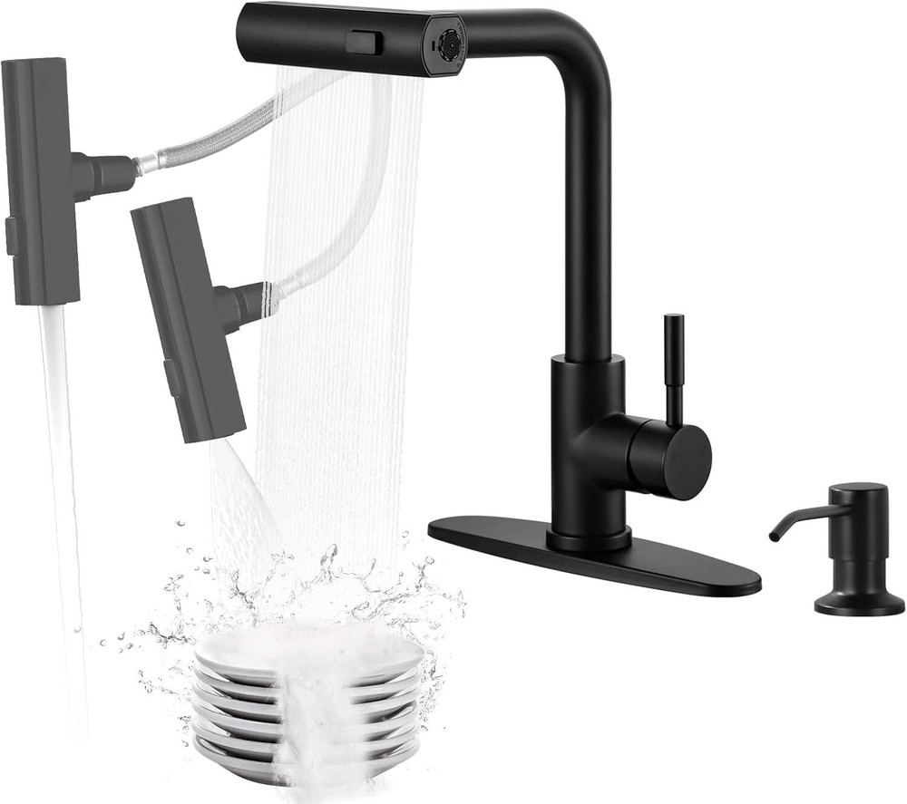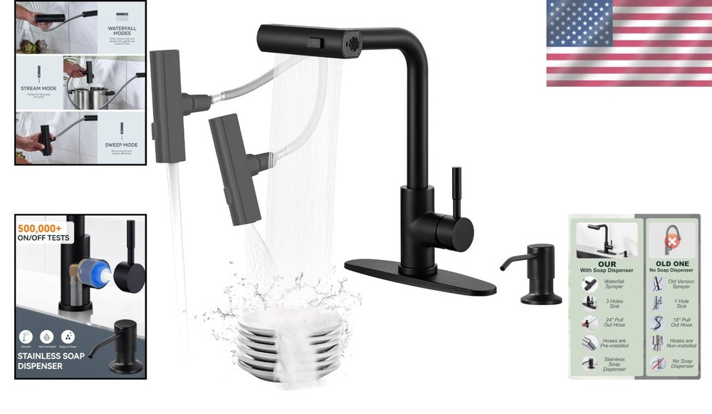 3-Function Black Kitchen Faucet with Soap Dispenser - Easy Installation Included ‹ › ‹ › ‹ › ‹ › ‹ › ‹ › ‹ › ‹ › ‹ › 3-Function Black Kitchen Faucet with Soap Dispenser Discover the elegance and functionality offered by our stunning 3-Function Black Kitchen Faucet with Soap Dispenser. This value-packed set combines two essential kitchen features into one sophisticated solution, enhancing both the efficiency and aesthetics of your kitchen. Features: Value-Packed Set: Save counter space and reduce clutter with this dual-function design. Innovative Waterfall Design: Delivers a powerful yet gentle stream of water, perfect for rinsing dishes and washing hands. 90° Rotating Spout: Effortlessly switch between spray modes with just a twist of the spout – from a focused stream for rinsing to a wider spray for cleaning. Durable Construction: Crafted with high-quality materials, this faucet and soap dispenser are built to withstand daily use. Enhanced Durability: Corrosion-resistant finishes help resist scratches, fingerprints, and water spots, ensuring lasting beauty and functionality. Effortless Operation: Smooth faucet levers and a perfectly calibrated soap dispenser make kitchen tasks efficient and enjoyable. Fit for Three-Hole Sinks: Easy installation with pre-installed hoses, compatible with single-hole and three-hole sinks. Customer Service Guarantee: Each unit undergoes rigorous testing to ensure quality; we offer a limited lifetime and dedicated customer support. Why choose our Kitchen Faucet? Transform your kitchen experience with our 3-Function Black Kitchen Faucet. Its innovative design not only elevates your kitchen's style but also streamlines your culinary tasks. Say goodbye to clutter and embrace a functional workspace that seamlessly blends elegance with efficiency. Enjoy effortless operation and peace of mind with our customer service guarantee, ensuring you receive only the best. Don't miss the opportunity to enhance your kitchen décor and functionality - order your 3-Function Black Kitchen Faucet with Soap Dispenser today! Shipping Free & Fast Shipping - We offer free shipping to most of the USA with a normal delivery time of 3-7 days. However, due to the current situation, additional delivery time (up to 3 weeks) may be required for some items. Alternative Carriers - We may use alternative carriers (e.g. USPS, FedEx, UPS, etc.) to ensure your package arrives safely and on time. Due to the use of multiple carriers, we are unable to provide a tracking number automatically. Handling Time - Orders are processed and shipped within 1-2 business days of receiving cleared payment. Shipping Restrictions - Shipping to Alaska, Hawaii, Puerto Rico, Guam, and other US territories may incur shipping charges or delivery restrictions. Please contact us before ordering, or your order can be refunded/cancelled. State Restrictions - There may be restrictions based on your state of purchase. For example, certain items may not be shipped to California due to state regulations. Contact for Tracking Updates - If you require tracking updates or have any concerns about the delivery of your order, please feel free to contact us, and we will be happy to assist you. Return 30-Day Hassle-Free Returns - We want you to be completely satisfied with your purchase. If you are not, you can return the item within 30 days of receiving it for a full refund or exchange. Easy Return Process - To start a return, simply contact us and we will provide you with a prepaid return shipping label and detailed instructions. Restocking Fee - There are no restocking fees for returns. However, the buyer is responsible for return shipping costs if the return is not due to a seller's error. Refund Processing Time - Refunds will be processed within 5 business days of receiving the returned item in its condition. Payment We accept all major credit cards, PayPal, and Apple Pay for your convenience. Your payment information is secure and encrypted to ensure a safe and seamless transaction. Please complete your payment within 3 days of purchase to avoid any delays in shipping. Feedback Your feedback is extremely important to us. We strive to provide the best products and customer service possible. If you are satisfied with your purchase, please take a moment to leave us a positive review. If you have any concerns or issues with your order, please contact us before leaving negative feedback. We are committed to resolving any problems and ensuring your satisfaction. Contact Us If you have any questions or concerns, please feel free to out to our customer support team. You can contact us through the eBay messaging system. We are available Monday to Friday, 9:00 am to 5:00 pm EST, and we will do our best to respond to your inquiry within 24 hours. Buy it now and enjoy a pleasant shopping experience! Item Weight: 5.19 Unit Quantity: 1 Material: Stainless Steel Suitable For: Kitchen Sink Features: Pull-Out,Pull Down Sprayer,Soap Dispenser,360 Swivel Room: Kitchen Items Included: Instruction Manual,Deck Plate,Soap Dispenser Type: Kitchen Faucet Finish: Black Number of Faucet Holes: 3 Color: Black Number of Faucet Handles: 1 Handle Type: Lever Faucet Mounting Type: Deck Mount Shape: Pull-Down Installation: Single Hole Faucet Hole Spacing: 3 Spout Height: 3.9 Inches Style: Modern Unit Type: lb