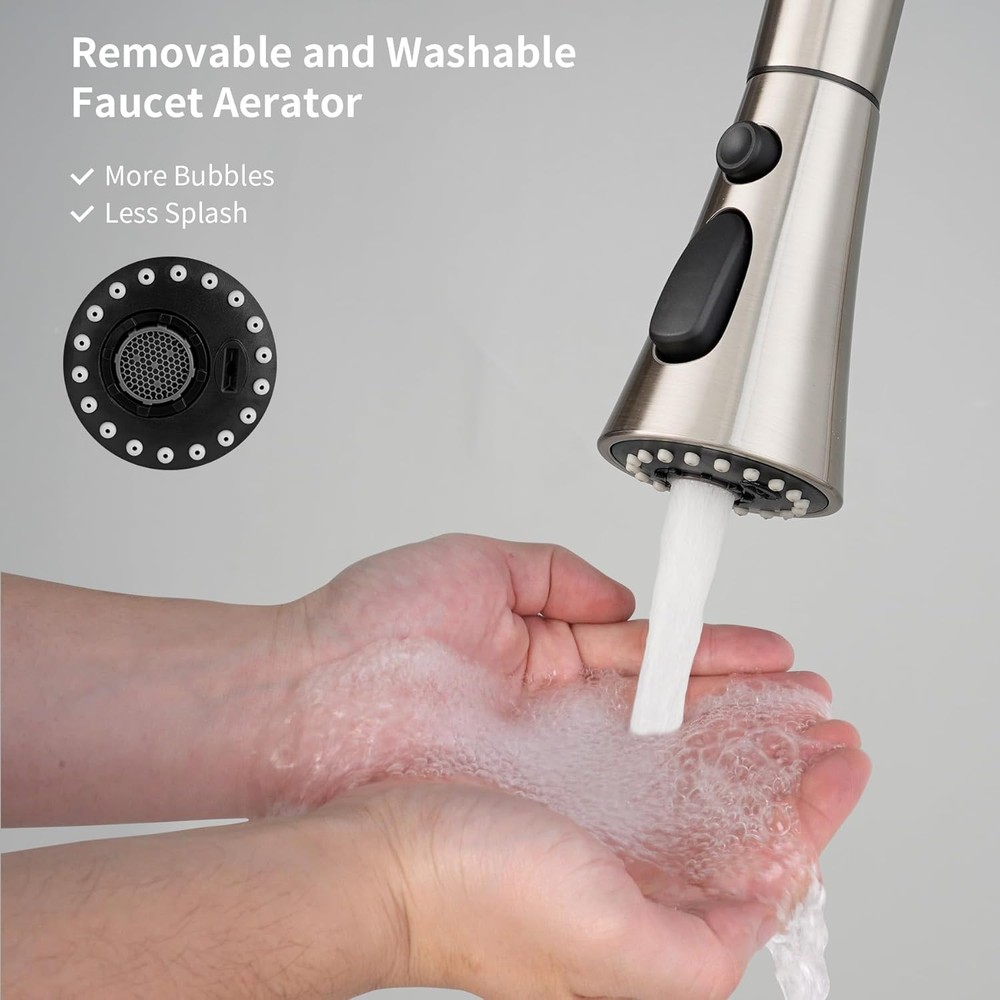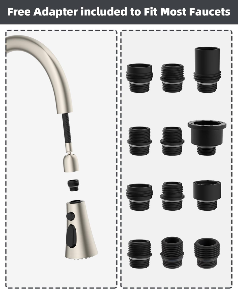 Versatile 3-Function Sprayer Head: Experience unmatched versatility with our sleek brushed bickel pull-down faucet sprayer head, offering three distinct modes: stream, spray, and high-pressure rinsing. The innovative high-pressure mode generates a potent water blade that effortlessly clears food debris, while a sturdy light button facilitates seamless switching between stream and spray. An additional round button activates the high-pressure mode, catering to your cleaning needs Universal Compatibility with 12 Adapter Options: This brushed bickel faucet sprayer head replacement comes with 12 adapters, making it compatible with major brands like compatible with American Standard, Moen, Delta, AquaSource, Kohler, Hansgrohe, and Grohe (not fitting Pfister or Glacier). Before purchasing, please measure the diameter of your faucet thread Removable and Washable Aerator: The pull-down faucet head replacement comes with a removable faucet aerator. The interior multi-mesh aerator creates a perfectly aerated stream that is quiet and has no splashing. You can easily remove and clean the aerator to maintain clean water and continuous flow High-quality Construction and No Dripping: Crafted from engineering-grade plastic (PC/ABS), this kitchen faucet head is built to last. It effectively resists daily rust, ensuring long-term quality and durability. There will be no water dripping, as long as you install it properly Easy Installation and No Water Splashing: Installing this sink faucet replacement head is a breeze. Simply unscrew your old faucet head and replace it with the new one, no tools are required. The pull-down sprayer replacement head delivers a stable water flow, no splashing and significantly improves your overall user experience Product Description 3 Modes Meet Your Different Needs 3-Function Mode: Stream, Spray, and high pressure rinsing. No Tools are Needed, easy to install. Collocations included 12 connections for various pull down faucet types. Not limited to compatible with American Standard, Moen, Delta, AquaSource, Kohler, Hansgrohe and Grohe. (Pfister or Glacier not included). Free aerator key for removing faucet aerator to clean. Specification: Note: Please make sure to double-check if your faucet can fit before placing the order. Finish: Brushed Nickel Material: Engineering grade ABS plastic Package Included: 1x faucet spray head 12x connectors Easy to install: Simply unscrew your old shower head and replace it with your new one. Easy to use: Switch between 3 modes by pressing the buttons with one finger. Easy to Clean: The periphery of the pull-down spray head is made of silicone nozzles which is very convenient to clean. Touch Clean Nozzles The soft rubber spray holes made of silicone are allowed to simply wipe away for an instantly refreshed look. Solid and Lightweight The pull down kitchen sprayer head is made of engineering grade plastic (PC/ABS) with brushed nickel finish that can withstand daily rust effectively, which ensures quality and longevity. Removable and Washable Aerator The aerator can be removed and cleaned to ensure clean water and continuous flow.