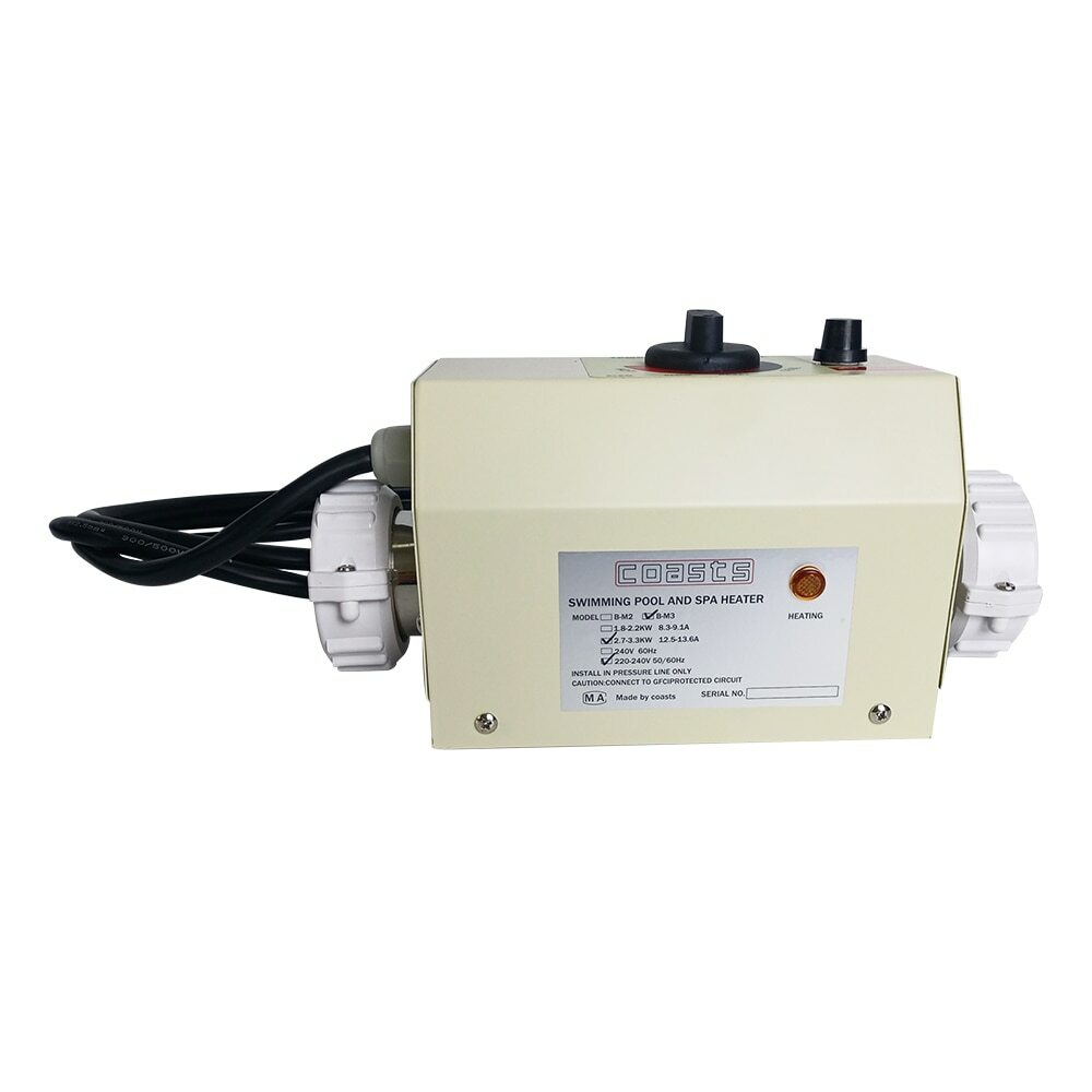 Item specifics Condition New: A brand-new, unused, unopened, undamaged item in its original packaging (where packaging is applicable). Packaging should be the same as what is found in a retail store, unless the item is handmade or was packaged by the manufacturer in non-retail packaging, such as an unprinted box or plastic bag. See the seller's listing for full details. See all condition definitionsopens in a new window or tab Origin CN(Origin) Brand Unbranded Type Sauna Rooms Model Number 3KW Feature With Transom Windows Certification CE Item description from the seller You must have the following conditions to use this product! !! 1、Circulating pumps with a power of more than 500 W must be supplied 2、Pool less than 70 cuft (2CBM) 3、It is best to prepare a valve installed at the machine outlet to increase water pressure when water pressure is not enough. Note :1. This product is a thermostatic equipment. It takes about 10 hours for first heating 2、Product reset button for machine high temperature protection, machine high temperature will pop up, must be cooled before reset Description: This thermostat is designed specifically for the hot tub, the thermostat is installed in the pipeline jacuzzi. When adding hot water bath, start the pump, the thermostat automatically heat insulation work, so the water temperature bath maintained at 39 degrees Celsius, give your Jacuzzi to create a more comfortable environment Feature and operation: 1.The initial set temperature settings: COASTS equipped with ultra-high temperature protection thermostat switch, thermostat to limit overheating and protect users against danger, however, users should be done after the installation is complete, the first under the premise of safety checks to ensure that the operation of the thermostat's normal function,By using the tub filled with water to a suitable level and start the system automatically checks and let the system run until the thermostat temperature stabilized at the highest level and display lights go out, use an accurate thermometer to measure the water temperature should be at 40 °C 2.thermostat operation is fully automated, clockwise, the heating is on, indicator light, temperature reaches a preset temperature, will remain at that temperature 3.The thermostat can be maintained within a temperature not exceeding 40 °C (104 °F) range. If cold water is started, will be 6 ~ 8 °C / h elevated temperatures 4.Automatic heating: thermostat will first reach the preset temperature, then stop working until the temperature dropped a few degrees, the thermostat automatically turns on 5.Ultra-high temperature (over 49 °C), ultra-high temperature switch will automatically trip (power off) Parameter: 1.Input voltage:220V 2.Power:3KW 3.Current:13.6A 4.Weight:3.5kg Note: thermostat outlet to the bath tub in the middle of the pipe or valve or check valve can not be installed Package Included: 1 x 3KW SPA Heater