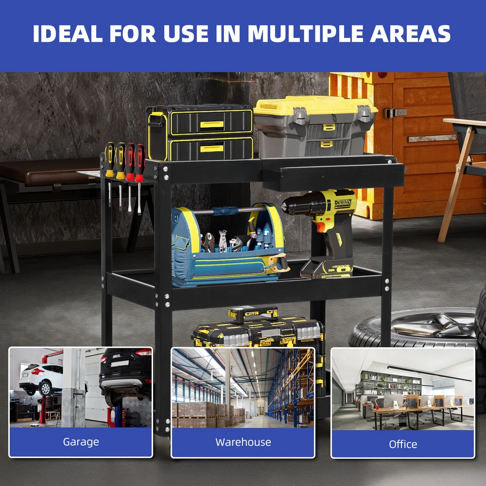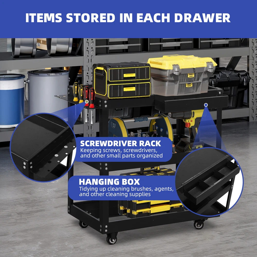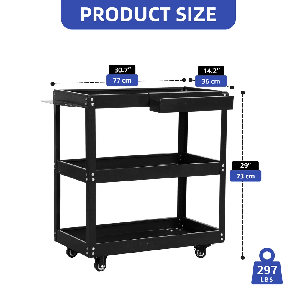 3 Layer Heavy Duty Rolling Metal Cart Service Mechanic Tool Utility Board Storage Product Description NOTE: Professional Installation would be Highly Recommended. Description: 1. Material: Metal, Steel 2. Color: Black 3. Special Design: Rolling Cart, Storage Space, Screwdriver Rack, Hanging Board, 4. Suitable for: Garage, Warehouse, Office Features: 1. Durable Metal Construction: Crafted from high-quality steel with a sturdy frame, this rolling cart ensures exceptional durability and strength. Its robust metal build makes it perfect for heavy-duty applications in garages, warehouses, and offices, providing a reliable storage solution for years to come. 2. Space Organization Features: Designed with ample storage space, this rolling cart includes multiple compartments, a built-in screwdriver rack, and a convenient hanging board. These features help keep tools, accessories, and essential supplies neatly arranged, making your workspace more efficient and clutter-free. 3. Smooth Mobility: Equipped with four high-quality swivel casters, this rolling cart moves effortlessly across various surfaces. Whether maneuvering around a garage, warehouse, or office, the smooth-rolling wheels provide excellent mobility while maintaining stability, allowing you to transport tools and materials with ease. 4. Compact & Versatile Design: Measuring approximately two and a half feet in length, slightly over one foot in width, and nearly two and a half feet in height, this rolling cart is compact enough to fit in tight spaces while still offering ample storage capacity. Its thoughtfully designed structure makes it a versatile addition to any workspace, keeping essential tools within reach. 5. Handle Substantial Weight: Engineered to support up to nearly 300 pounds of weight, this rolling cart is built to hold a variety of heavy tools, equipment, and materials. Whether storing power tools, hardware, or office supplies, its reinforced construction ensures maximum strength and stability for demanding tasks. Dimensions: 1. Product Dimensions: 30.7"L x 14.2"W x 29"H 2. Product Load Capacity: 297 lbs Package Included: 1. 1x Rolling Cart 2. 4x Swivel Casters 3. 1x Hanging Board Shipping 1. Normally the item will be dispatched within 1 business day if payment is cleared before 12pm PST. 2. Please verify the correct shipping address in your PayPal account before making the payment. We only dispatch the item to the address that is sent to us at the time of checkout. 3. We don't ship to Hawaii, Alaska, Puerto Rico, APO/FPO/PO Boxes. 4. We don't provide local pick-up service. 5. Normally we will use USPS, UPS, FedEx & LTL to dispatch items. Payment 1. We accept PayPal and credit card. 2. We will ship to the confirmed Paypal shipping address that is provided with the payment only. Return 1. 30 days Money Back Guarantee. 2. Please contact our customer service to receive a RMA form first if want to return the item. 3. All returned items MUST in new condition with the original package. Contact If has any problem, please contact us by sending an ebay message. Our customer service will resolve the problem as soon as possible. On Nov 8, 2024 at 00:31:14 PST, seller added the following information: On Feb 3, 2025 at 19:08:01 PST, seller added the following information: