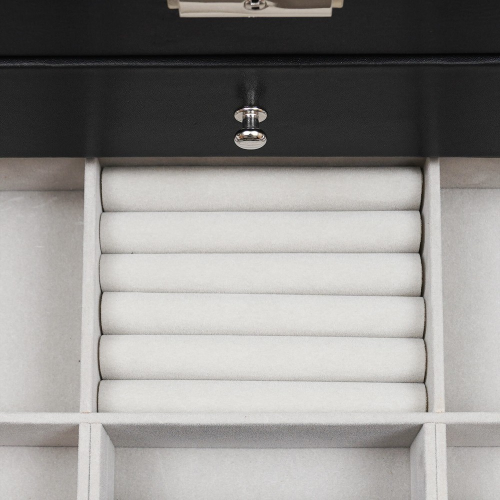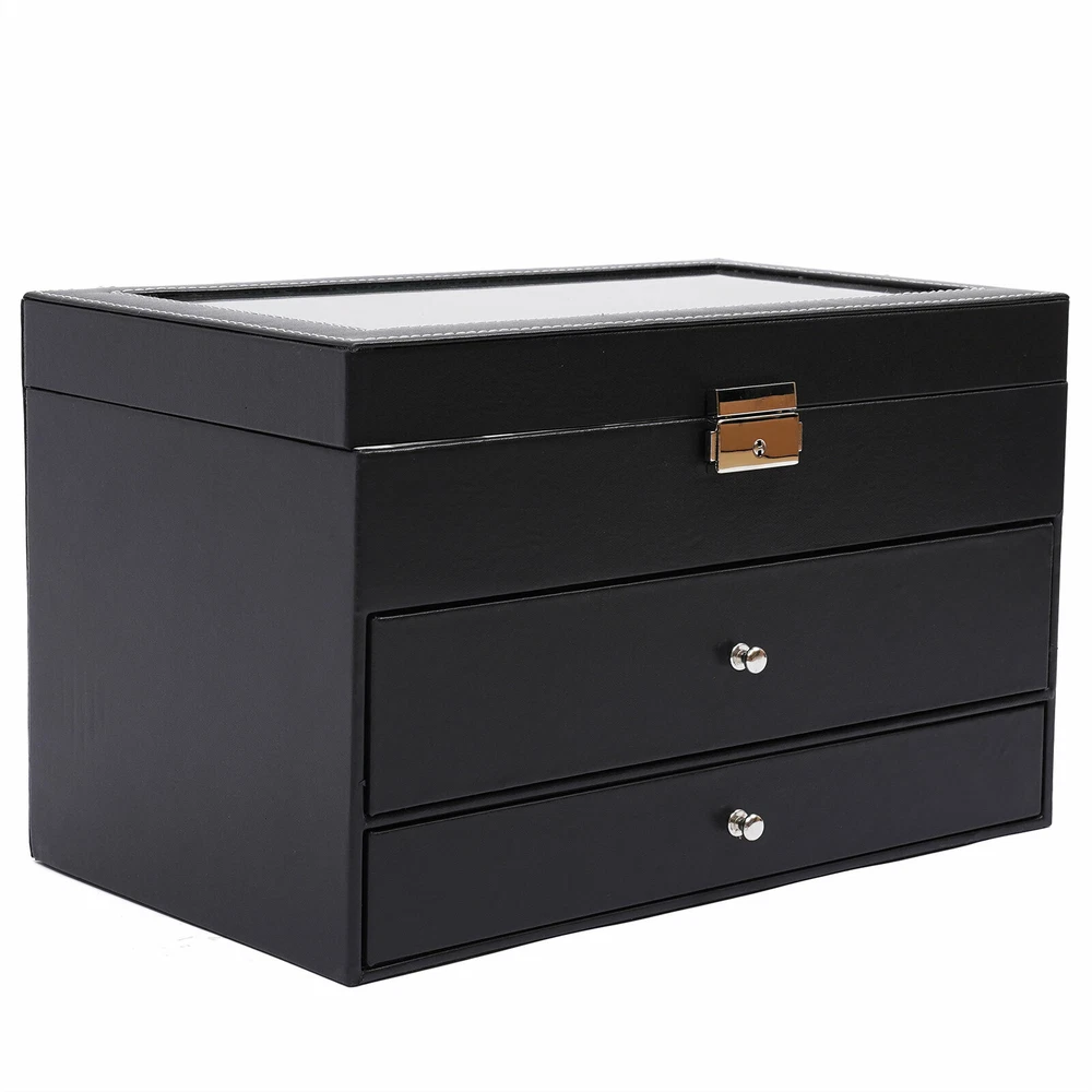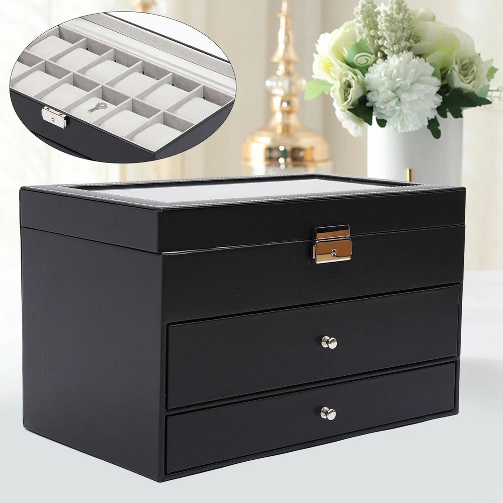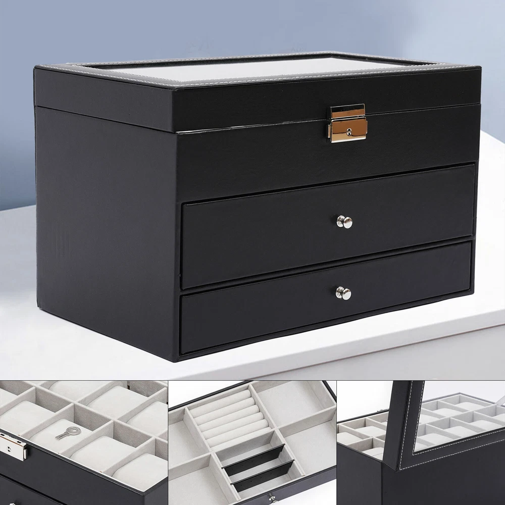 Features: 1.Material:high Quality Pu Jewelry Box , Attractive Appearance,Simple Structure,Fine Workmanship and Sturdy Construction 2.Capacity: Metal Lock and Three Layers,First Layer Include 12 Slots to Storage Watch, Second Layer Include 6 Slots to Storage Sunglasses Third Layer Include 7 Slots and a Ring Slots to Storage All Kinds of Jewelry. 3.Design:divided into Plenty of Unit Space Which Are Easy to Clean and Maintain,It Will Keep Your Watches and Eyeglasses & Sunglasses Securely 4.Safety:this Elegant Jewelry Case Allows You to Show Your Glasses and Watch and Other Jewelry While Protecting Them Away from Dust,Fingerprints,Scratches and Thieves 5.Wonderful Gift:practical Function with Beautiful Appearance, Safety Lock with Key Adds Security. Amazing Gift for Valentine's Day, Mothe 3 Layers Lockable Watch Box Jewelry &Sunglass Storage Case 25 Slots +metal Lock Features: 1.Material:high Quality Pu Jewelry Box , Attractive Appearance,Simple Structure,Fine Workmanship and Sturdy Construction 2.Capacity: Metal Lock and Three Layers,First Layer Include 12 Slots to Storage Watch, Second Layer Include 6 Slots to Storage Sunglasses Third Layer Include 7 Slots and a Ring Slots to Storage All Kinds of Jewelry. 3.Design:divided into Plenty of Unit Space Which Are Easy to Clean and Maintain,It Will Keep Your Watches and Eyeglasses & Sunglasses Securely 4.Safety:this Elegant Jewelry Case Allows You to Show Your Glasses and Watch and Other Jewelry While Protecting Them Away from Dust,Fingerprints,Scratches and Thieves 5.Wonderful Gift:practical Function with Beautiful Appearance, Safety Lock with Key Adds Security. Amazing Gift for Valentine's Day, Mother's Day, Thanksgiving, Christmas, Birthdays and Weddings. (Note: Watches and Jewelry Are Not Included.) Product Specification: - Material: High Grade Pu Leather,Medium Density Fiberboard - Window: Glass - Color: Black - Product Dimensions (L X W X H): 33.7*19.4*20.5cm/13.26*7.63*8.07inch -Weight:3kg Packaging List: - 1 X Jewelry Display Box Payment Delivery details Terms of sales About us Contact us Payment We accept ebay payment 。 Fees such as import duties, taxes are not included in the item price or shipping costs. These charges are the buyer's responsibility. Delivery details Shipping: 2-9 working days to: USA Terms of sales We maintain high standards of excellence and strive for hundred percent customer satisfaction. Feedback is very important to us. We hope that you contact us immediately before you give neutral or negative feedback, so that we can address your concerns. It is impossible to address issues if we do not know about them! About us Your satis faction is our ultimate goal. We work hard to earn your trust and future business. Our certified technicians have tested each item before shipping. The unit comes with 1 year limited warranty on all manufacturing defects. a) If you receive a defective item, you may return it or ask for a discount. Please contact us within 14 days after you receive the package. b) What you returned must be intact and in its original packaging as re? u. Customer is responsible for shipping costs of the returned item. c) We will cover the cost of shipping back t with the shipping rate indicated in the registration page. We will send you a new unit or refund the full payment you paid. Thank you. Contact us Business Hour Business Hour: Monday To Friday: 8:30 AM to 5:00 PM (Beijing China time) Due to time zones, our reply to your questions may not be immediately. But within above working time, we will reply your email within 24 hours. If it's non-workdays, please kindly be patient and wait till Monday. Please contact us with ebay message. Please feel free to contact us if you have any questions. Monday To Friday: 8:30 AM to 5:00 PM (Beijing China time) Due to time zones, our reply to your questions may not be immediately. But within above working time, we will reply your email within 24 hours. If it's non-workdays, please kindly be patient and wait till Monday. Please contact us with ebay message. Please feel free to contact us if you have any questions. Brand TBvechi Shipping Note Cannot ship to Puerto Rico & Hawaii Features Stable characteristics, high reliability Transportation does not include canarias Manufacturer Warranty ( 制造商保修 ) Yes UPC Does not apply MPN ( MPN ) N/A Item Weight 3 KG Product Dimensions 33.7*19.4*20.5cm/13.26*7.63*8.07inch MPN Does Not Apply Material pu Color Black Type Storage Box Capacity n/a