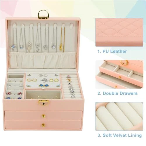 Return Policy Fast Delivery Trusted seller Jewelry Box for Women, 3-Layer Jewelry Organizer, Jewelry Storage Case PU Leather for Earrings, Bracelets, Ring, Necklaces-Pink Product Description 【Jewelry Organizer Materials】This jewelry case is made of durable PU leather, which is dirt-resistant, waterproof, non-deformable and easy to clean. The inner lining is wrapped in durable and soft velvet to provide all-round protection for your jewelry, and with a smooth and exquisite metal buckle for easy opening and closing. The material of leather gives your jewellery box an excellent touch and a premium look. 【Large Capacity Travel Jewelry Case】The jewelry holder uses a 3-layer design with 2 drawers. The lid has hooks and small pockets for necklaces or long earrings; The first compartment is for earrings and rings; The second compartment can store small items, hair clips or charms; The compartment space can be adjusted freely; The third compartment is a large drawer w you can put larger items, watches or lipsticks and so on. 【Space-Saving Jewelry Holder 】This travel jewelry box can keep your jewelry organized and prevent your necklaces from tangling. The jewelry box displays your jewelry neatly and stylishly, which can better classify jewelry. No more messy, damaged or misplaced. No more struggling to find w your matching pieces are everyday. Gets your daily dressing up quicker and easier. 【Portable & Perfect Size】The jewelry box looks very cute, large enough to store jewelry but small enough to save space, lightweight,great to throw in a suitcase or tucking in a drawer,super convenient when traveling! Compact and generous design goes easily with your decor. Portable earring box is a breeze to pack and sits beautifully on your dresser, nightstand, bathroom counter or vanity, saving lots of space to make your dressing table and room look neater. 【Ideal Decorative Jewelry Gift Box】This velvet jewelry organizer looks elegant and considerate. It's perfect for the women who has lots of jewelry or accessories. Our jewelry box is perfectly packaged and comes with a beautiful greeting card. Stylishly designed, this jewelry display is perfect gift for mother, wife, girlfriend, daughter, friends even bridal party on Wedding, Christmas, Birthday, Anniversary, Mother's Day, Valentine's Day. Shipping Returns Payment Shipping Shipping is FREE to all addresses other than APO/PO boxes in the lower 48 states. All our stock ships from US-based warehouses. Shipped via USPS or UPS (depending on location and package weight) Unless stated otherwise, all orders will ship within 24-72 hours of your payment being processed. Check our feedback to see the great reviews of FAST shipping we offer. Returns Seller does not accept returns Payment We currently accept payment via eBay managed payments only. Once payment is cleared, we will dispatch your shipment within 1-3 business days. Please refer to the "Shipping" tab for more information regarding shipping speed to your destination.