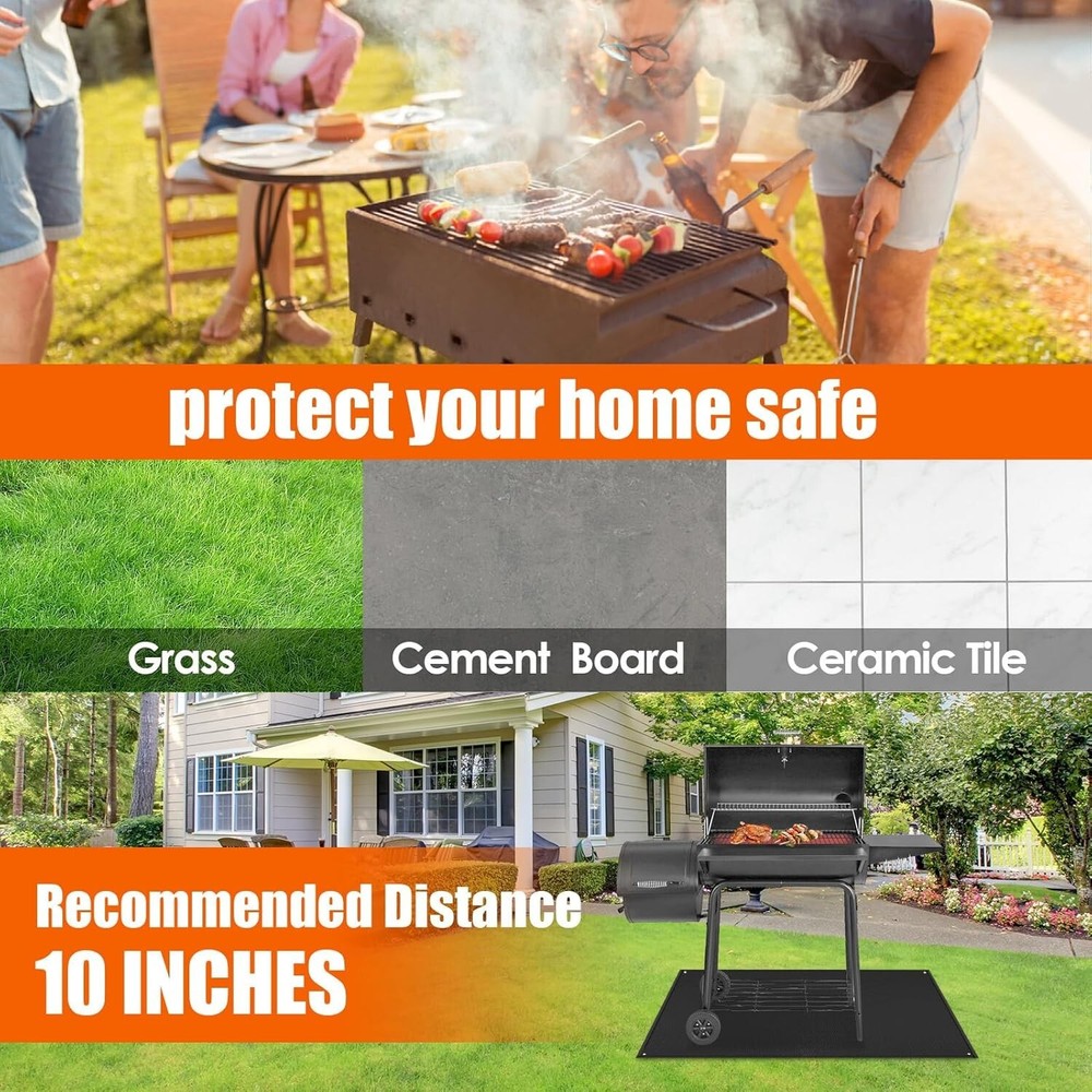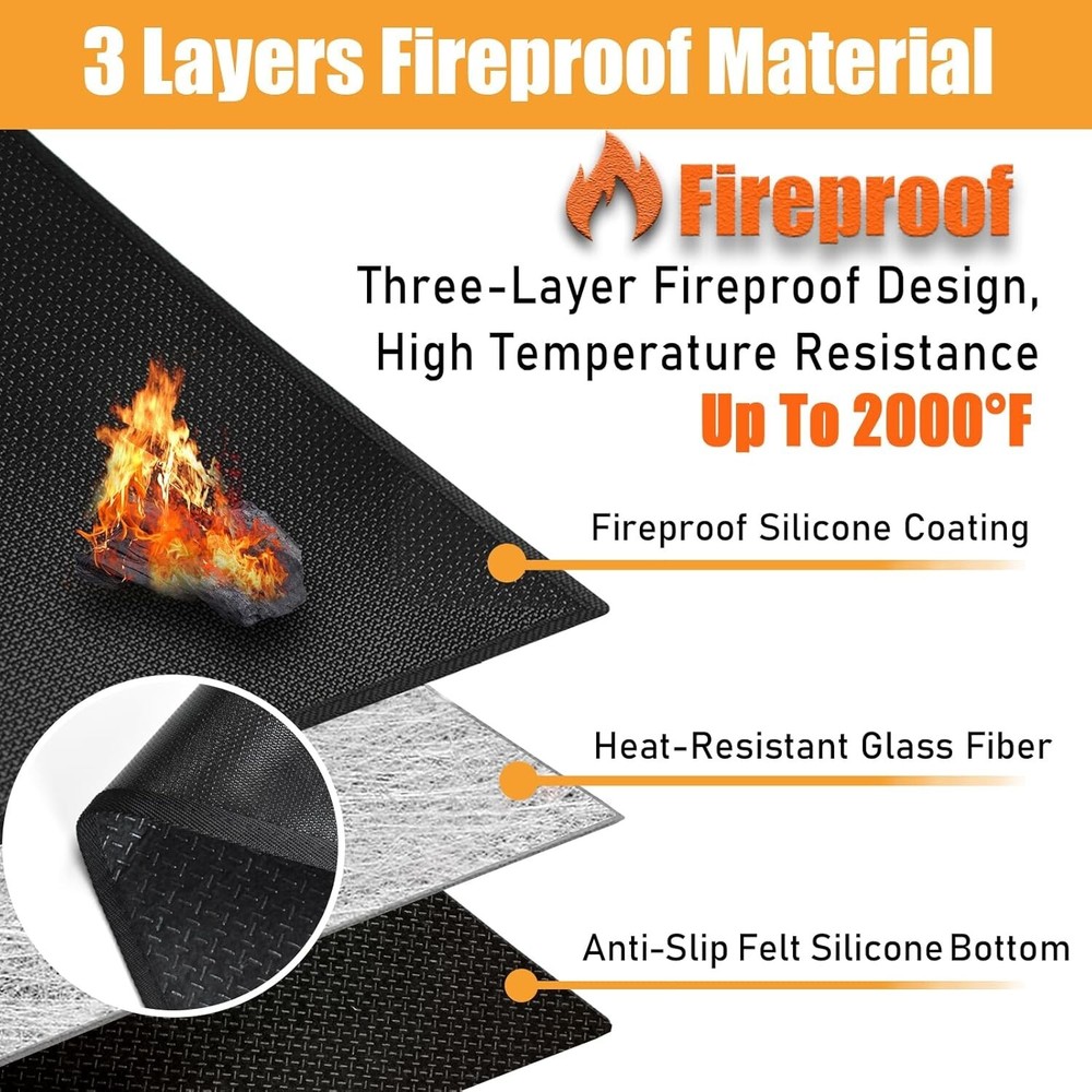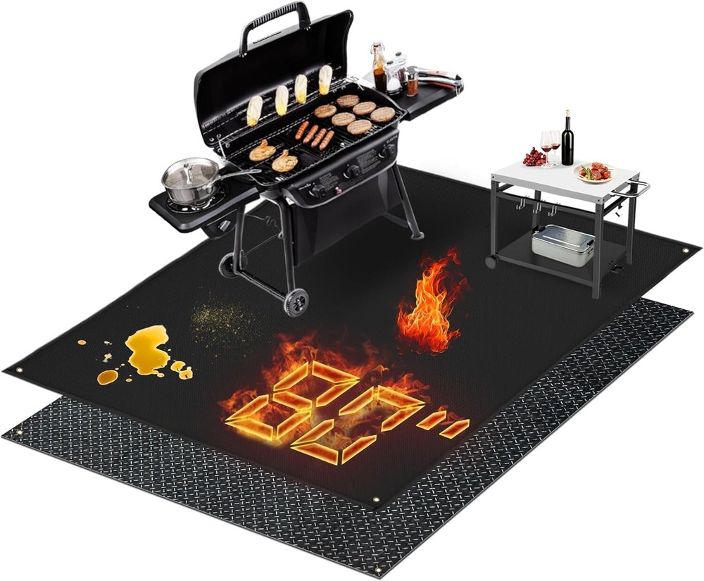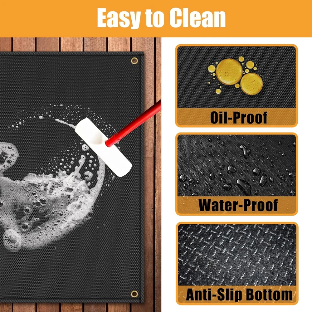 3 Layers Thickening 80x48 inchs Large Grill Mat for Outdoor Grill,Barbeque Grill Cooking Mats for Outdoor Floor Mat,BBQ Grill Mat Under Grill to Protect Deck,Grass,Patio,Indoor Fireplace Mats High temperature resistance: barbecue grill mat is made of glass fiber, and the two sides are evenly coated with a silicone coating that can withstand high temperature of 1020°F, which can resist various high temperature damage to the deck and patio. Large Size: 48x30 inches grill mat, protect the area under the grill from high temperature and fire, and collect any splatter and food stains, keep the environment hygienic, reduce the burden of cleaning, and enjoy the outdoor time to the fullest. Multipurpose:The Grill Mat Can Also Be Used for Charcoal, Flat Top, Smokers, Gas Grills, Fire Pit, Indoors Fireplace and to Blackstone, Weber, Ninja, Royal Gourmet Etc. Easy to Clean: The grill mat adopts a unique waterproof and oil-resistant design, and the silicone coating on the surface will not absorb oil stains, sauces and food stains. When cleaning, just prepare soap, rinse with a hose or wipe with a damp towel. Convenient Fixation: When Used Outdoors, It is Convenient to Insert the Floor Nails into the Holes Reserved at the Four Corners of the Barbecue Mats to Prevent Strong Winds From Blowing the Grill Mat Away. 80x48 in Under Grill Mat for Blackstone,Weber,Traeger,Pit Boss,Royal Gourme, BBQ Protector for Decks and Patios,Fireproof Outdoor Charcoal, Flat Top, Smokers, Gas Grills Heat Resistant Mats, Oil-proof Waterproof Fire Pit Floor Pads