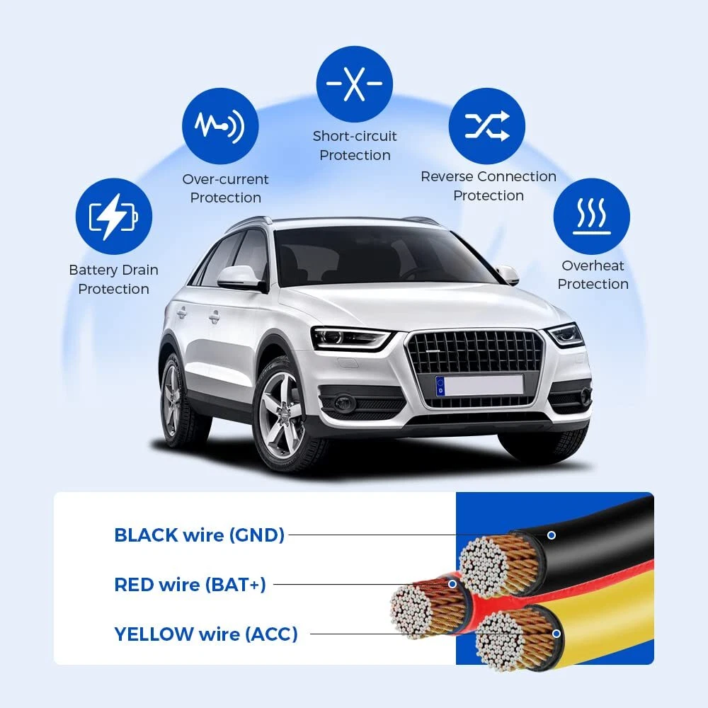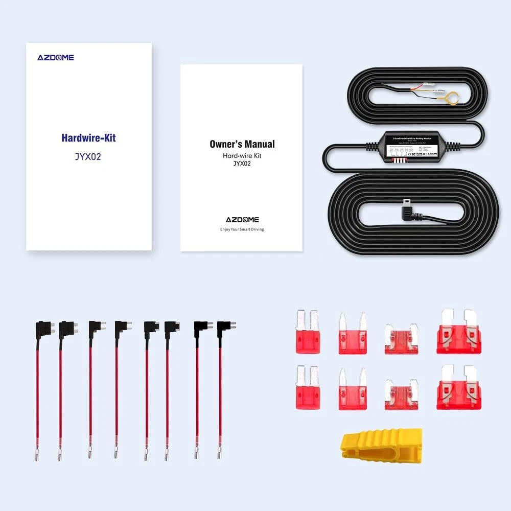 3-Lead ACC Mini-USB Port Hardwire Kit contains all the components required to easily piggyback on the fuse box of any vehicle. Simply plug the required fuse tap cable into the vehicle’s fuse box to provide the with its own power supply. This allows the Dash Cam to be installed in your vehicle without the need to use the 12V outlet (car cigarette socket). With the Hardwire Kit installed, the Dash Cam will power on and start recording automatically when the vehicle is opened or starts. If you turn on the function of parking monitoring on the dash cam, it will automatically enter the time-lapse recording mode or the continuous recording mode. The inbuilt minimum voltage limiter will protect the vehicle's battery from going flat. The 3-lead Mini USB Hardwire Kit is a power management device that provides power to your dashcam from your car’s battery via fuse box to keep your dashcam continuously running even after your engine is turned off to utilize the 24HR Parking Monitor feature. The output current can reach 5V/3A. It can match with M550 dash cam. M550 dash cam is built in Super Capacitor. No power pack or batteries. It must be powered by connecting to your car in of three ways direct connect to a fuse, cigarette light adapter or a OBD cable. So if you want to use parking mode you need to purchase hard-wiring kit with 3 wires, the output current need reach 5V/2.5A. Steps: 1. Please connect the red wire to ACC, the yellow wire to always powered, and the black wire to ground. 2. If the hardwire kit is connected correct, find the "Park" menu in the menu, press OK to select connected, tick parking monitoring, and press the menu button to exit and save the settings 3. Once the car turns on ACC, M550 dash cam will automatically turn on, and once the car turns off, the will enter time-lapse video parking monitoring mode automatically when hardwire the correct. 3-Lead ACC Mini-USB Port Hardwire Kit - This allows the Dash Cam to be installed in your vehicle without the need to use the 12V/24V outlet (car cigarette socket). Converts 12V-24V to Output 5V/2.5A Max. Automatically Enter Parking Mode - With the Hardwire Kit being installed, the Dash Cam will power on and start recording automatically when the vehicle is opened or starts. If you turn on the function of parking monitor on the dash cam, it will automatically enter the time-lapse recording mode or the continuous recording mode. Low Voltage Protection - The inbuilt minimum voltage limiter will protect the vehicle's battery from going flat. If the voltage of your car battery drops to this default voltage 11.8V or 23.6V, it will cut off the power, which leaves you with enough power to start your car for the next time. Complete Accessories - Contains all the components required to easily piggyback on the fuse box of any vehicle. Simply plug the required fuse tap cable into the vehicle’s fuse box to provide the with its own power supply. Fuse sizes and the type of Fuse Taps vary depending on your vehicle, please check your Fuse Box to see what type of fuse tap your vehicle requires. There are 4 variations of the add-a-fuse that we carry: ACZ(), ACS(mini), ACN(LP-mini) and ACU(ATO) as photos (2 Needed Per Vehicle). Note: It is NOT with some Ford trucks and vehicles with the included fuse taps . If you have Ford F150 2021, Ford F150 Lariat 2011, Ford F350, Ford Edge 2011, Ford Explorer 2013, Ford Expedition 2013, Ford Ranger 2021 trucks/cars, this will not work for you.