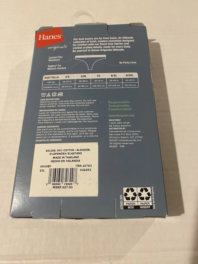 Type:PantiesFeatures:StretchNumber in Pack:3 PackDepartment:WomenMaterial:CottonSize Type:PlusColor:MulticolorPattern:SolidStyle:Thong/StringBrand:HanesSize:2XL