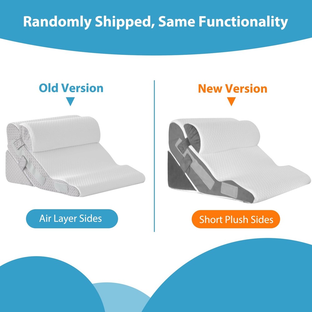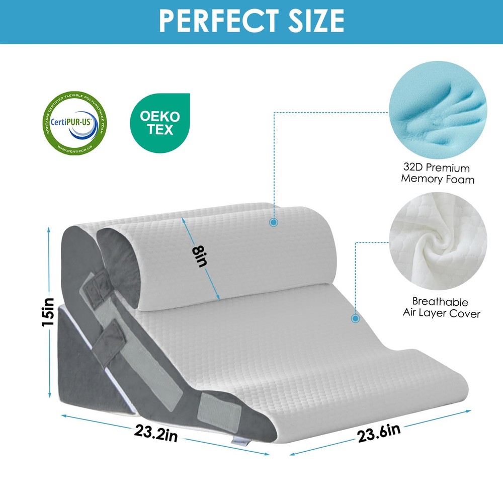 Introducing the bed wedge pillow for sleeping, crafted for comfort and support. Featuring a memory foam headrest and high-density foam base, the wedge pillow for back pain relief, wedge pillow for acid reflux relief and back pillow for bed sitting up offers over 10 adjustable configurations to suit various sleep positions and needs as a body positioner. Certified safe and healthy, our bed wedge pillow post surgery and triangle pillow wedge promotes spinal health, alleviates muscle tension, and aids in post-surgery recovery. The breathable and removable covers of our incline elevated pillows for sleeping ensure convenience for home and travel use. Our shoulder surgery pillow features a skin-friendly cover for a good sleep experience. The cover of the bed pillow for sitting up is machine washable. Our acid reflux pillow provides a comfortable sleeping experience, serving as wedge pillows for seniors and back support pillow for bed. Ideal for enhancing well-being, the bed wedge pillow for headboard and sit up pillow for bed is a thoughtful gift for anyone improved sleep and comfort. 【Soft and Supportive Foam】Our 23.6-inch wide bed wedge pillow post surgery features a headrest pillow of 45D cooling memory foam that gently conforms to the neck.The back and base pillow, crafted from 25D high-density foam, provide ample support to perfectly fit the body curve, disperse body pressure, and help relieve physical fatigue. Additionally, our wedge pillow headboard is certified by CertiPUR-US and Oeko-Tex Standard 100, ensuring a safe and healthy choice. 【Adjustable Versatile Design】wedge pillow offers over 10 combinations and serves as a headboard, head support, back support, or leg wedge. It features adjustable heights (15" or 23") and angles (30° or 60°) to meet diverse sleep positions and individual needs.Designed with ample dimensions (23.2'' depth x 23.6'' width), the back pillow for bed sitting up promotes spinal health, alleviates muscle tension, and ensures comfort for relaxation, reading, recovery, or better sleep. 【Comprehensive Health Improvement】Our back support pillow for bed is designed to enhance sleeping quality and overall well-being across various health needs. It effectively alleviates pain in the shoulders, neck, back, spine, and legs as a body positioner. Moreover, the triangle pillow wedge aids in post surgery recovery, relieves symptoms of acid reflux, GERD, and heartburn, addresses snoring, promote blood circulation and breathing, and provides pregnancy support. 【Breathable & Washable Cover】Our orthopedic bed wedge pillow set features a breathable and skin-friendly knitted air layer fabric cover, promoting airflow for a cool sleep experience. The removable cover with a hidden zipper is machine washable for easy maintenance. Wide and foldable velcro sewn on the side allows for various combinations. 【Product Sides Variation】The new version features short plush sides instead of the previous air layer. Both versions will be shipped randomly, with the same quality and functionality. 【Warm Tip】wedge pillows are vacuum-rolled and packed for efficient shipping. We recommend placing the wedge pillow in a well-ventilated area for 24 hours upon receipt to allow it to naturally expand to its original shape. Expansion time may vary. Please be patient and allow 24-48 hours for optimal support. Before use, remember to remove the protective layer from the Velcro.