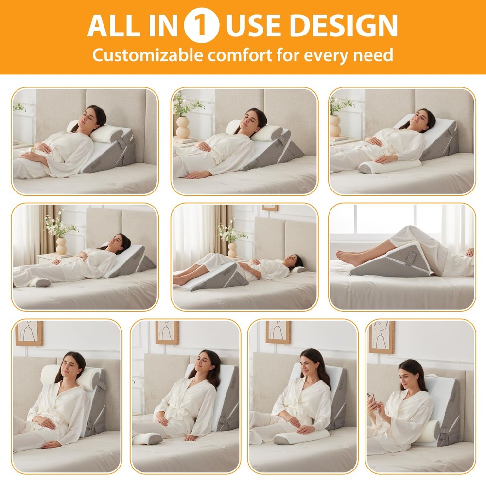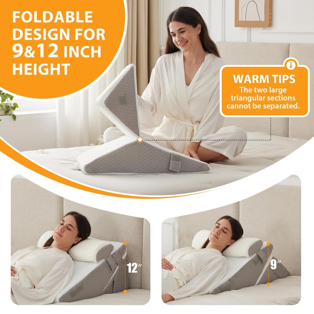 Our premium wedge pillow set combines a top layer of 40D memory foam with a 25D high-density foam bottom layer, providing exceptional comfort and support. This versatile 10-in-1 wedge pillow set is perfect for neck and back support while sleeping, working, or reading, and also aids in elevating legs and knees for post-surgery recovery. The newly upgraded design includes a convenient portable handle and side pockets for storing essentials, enhancing ease of use. Its ergonomic curve improves blood circulation, alleviates acid reflux and snoring, supports post-surgery recovery, and offers pregnancy care. For optimal use, allow the pillow to expand for 24-48 hours after unpacking or use a low-temperature dryer to speed up the process. The removable pillowcase is machine washable for easy cleaning. MULTIFUNCTIONAL WEDGE PILLOW: Wedge Pillow Set offers a 10-in-1 adjustable design, perfect for various needs. Whether you need neck and back support while sleeping, working, or reading, or elevation for legs and knees post-surgery, this versatile incline pillow has you covered. NEWLY UPGRADED DESIGN FEATURES: Our upgraded 3-piece bed wedge pillow for sleeping features a convenient portable handle for easy use in the bedroom, on the sofa, or anywhere you need. Plus, it includes side pockets for storing your phone, remote, and other essentials while you relax. PREMIUM MEMORY FOAM: The semi-cylindrical pillow in this 3PCS wedge pillow set is crafted with high-quality 40D memory foam, while the triangle pillows are made from 25D high-density foam. It provides enhanced support and exceptional comfort. ERGONOMIC DESIGN & HEALTH SUPPORT: Designed with an ergonomic curve, this orthopedic bed wedge pillow set delivers exceptional comfort. Our post surgery pillow improves blood circulation, alleviates acid reflux and snoring, supports post-surgery recovery, and provides essential pregnancy care. WARM TIPS: This bed wedge pillow is shipped in a vacuum-sealed package. For optimal expansion, allow it to sit for 24-48 hours upon arrival, or use a low-temperature dryer to expedite the process. Before use, ensure that you remove the protective layer from the Velcro strips. Besides, the pillowcase is removable and machine washable for hassle-free cleaning.