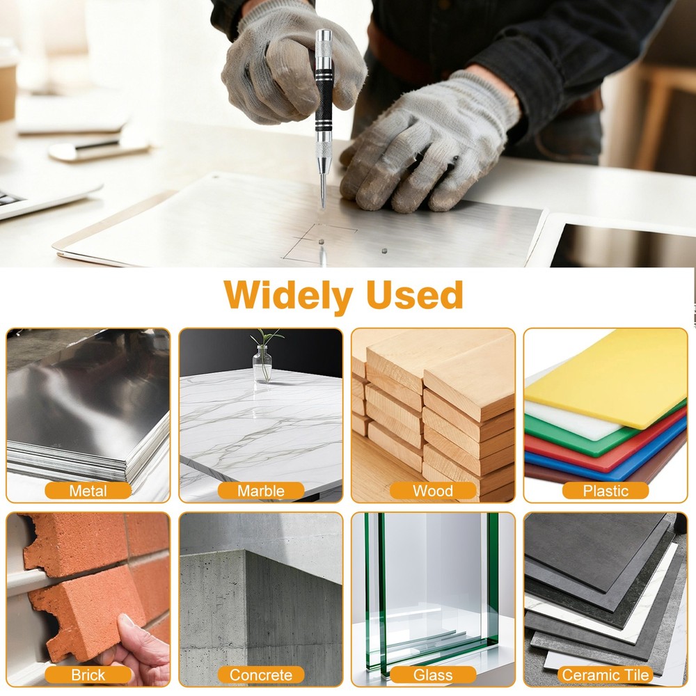 Product Description This 3pcs Automatic Center Punch Set is designed for precise marking, drilling, and metalworking applications. Each punch features an adjustable spring-loaded mechanism, allowing you to create accurate indentation points without using a hammer. Made of premium alloy tungsten steel, these spring loaded punches deliver excellent hardness, wear resistance, and durability for long-term use. The metal center punch tool with ergonomic knurled grip provides superior control and comfort, ensuring steady operation even during heavy-duty tasks. Ideal for metal, wood, plastic, leather, and glass, this universal punch set is a must-have tool for machinists, carpenters, engineers, and DIY enthusiasts. Product Feature 💥 Adjustable Spring Tension: The metal center punch tool built-in spring mechanism allows you to control the striking force— ideal for various materials and depths . 🔩 High-Strength Tungsten Steel Tip: Automatic center punch with hardened tip ensures sharp and consistent marking performance, resistant to wear and impact. 🎯 Anti-Slip Knurled Grip: Spring Loaded Metal Drill Tool with precision-machined handle design provides comfortable, firm control for accurate positioning. 🚀 Easy One-Hand Operation: The metal wood drill hole marking tool is no hammer needed — simply press down to activate the spring and make a perfect center mark. 🛠️ Versatile Application: Adjustable center punch set is suitable for drilling, metalworking, woodworking, glass marking, and layout work. 🧰 3-Piece Drill Hole Marking Tool Set: Includes three different styles for various marking needs—ideal for professionals and hobbyists. Product Specification Type Automatic Center Punch Color Black / Brass / Brass with Red Cap Mechanism Adjustable Spring-Loaded Operation Mode One-Hand Press Action (No Hammer Needed) Material Alloy Tungsten Steel + Metal Handle Use For Metal, Wood, Plastic, Glass, Leather Function Marking, Center Punching, Drilling Positioning Features Adjustable Tension, Anti-Slip Grip, High Precision, Heavy Duty, Wear-Resistant Application Metalworking, Woodworking, DIY Projects, Engineering, Crafting Package Included 🎁3 × Automatic Center Punch Tools Location Descriptions To improve your buying experience and ensure fast delivery, Your order will be shipped from the warehouse located in either new jersey or california that is closest to your address. If you have any questions, Please contact us. Thank you for your support ! On Oct 17, 2025 at 07:24:26 PDT, seller added the following information:
