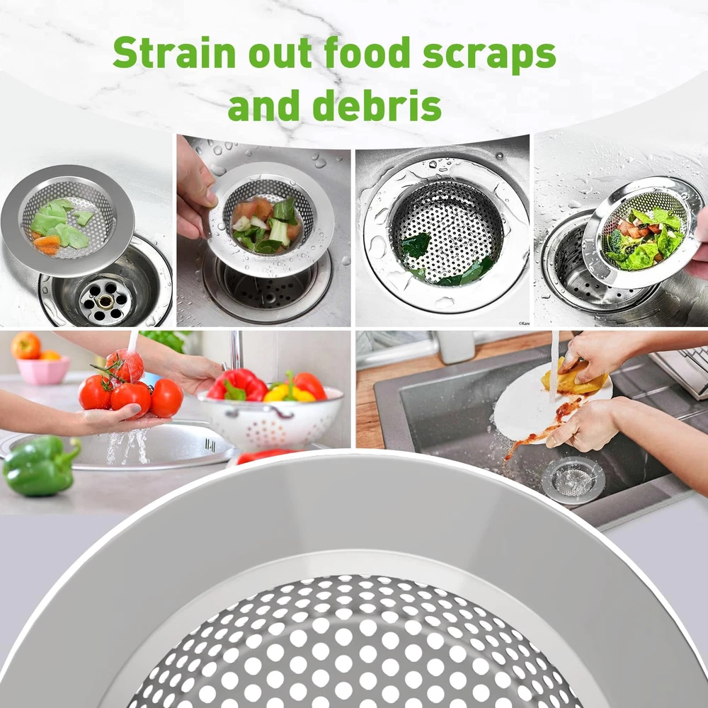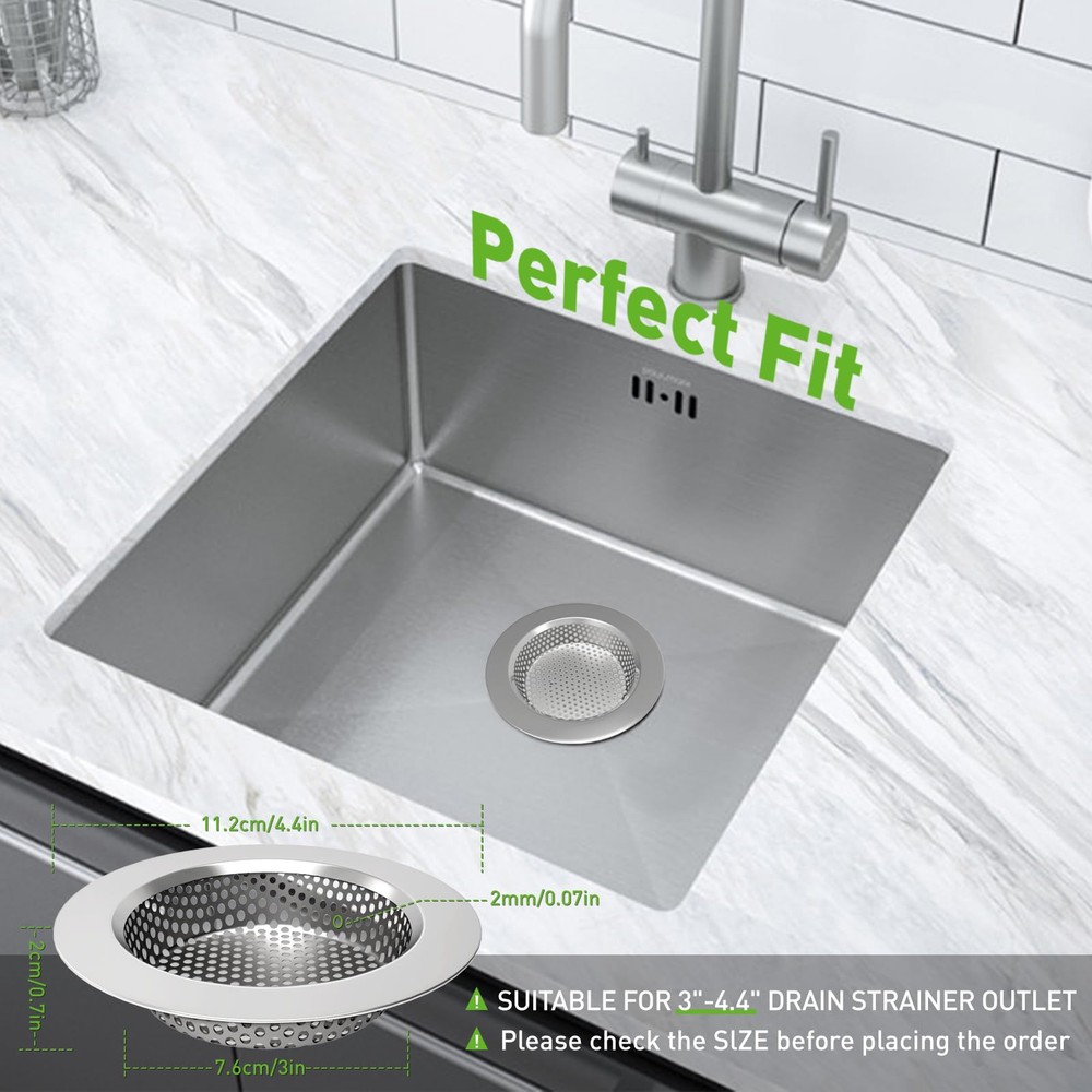 Are you tired of always having stuff accidentally falling into the drain? Our sink drain strainer helps keep all those pesky scraps away from your pipes, helps avoid potentially expensive plumbing clogs, and looks good, too! Efficient Straining: The kitchen sink drain strainer effectively blocks food scraps and debris, while lets liquid flow into the drain and protecting pipes from clogging. Hemming processing: The sink strainer has smooth edge, not scratch your hands or damage your sinks Perfect size: Fits most sink drains strainer, outer diameter: 4.4 inch, 0.8 inch depth, micro-perforation: 2mm dia holes. Not easily deformed: Thicken 2-ply metal sheet flat rim Rustproof: Unlike plastic alternatives that can break or warp over time, these stainless steel kitchen sink strainers are built to last, providing peace of mind and hassle-free maintenance. Dishwasher safe, making maintenance a breeze. Fit in perfectly:These sink strainer basket is beautifully crafted and solidly constructed to fit perfectly into the drain and look as if they came with the sink! Simplicity:Sink drain cover have no complicated mechanisms or moving parts, just a simple, straightforward design that gets the job done. Do you have stinky drains or need to take apart the pipes underneath your sink? You will not have that issue at all with the sink drain strainer! The sink strainer has a small but deep basket that stops unwanted debris from going down the drain. It helps to keep drains flowing freely, eliminating clogs from foreign objects. Are you heartbroken about the expense of hiring a plumber for a clogged pipe? Solve the problem at the source with our kitchen sink drain strainer! The meticulously designed strainer effectively traps unwanted materials, preventing them from entering the plumbing system. They represent a smart investment in the long-term health and functionality of your plumbing system. The Sink drain strainer has a microscopic pore diameter of 0.07''/0.2 cm, high density mesh traps food scraps or solid debris efficiently, keeping your drain from creating blockage. A plumber visit can be costly, and drain snakes and liquid drain cleaners are not always effective. With this sink strainer, there are no harsh chemicals damaging your pipes and the environment. Our sink drain strainer is compatible for most standard kitchen sinks as well as bathroom, utility, laundry and RV. The kitchen sink drain strainer is made of stainless steel for reliable rust protection, built to last. Even after using it for a long time the sink strainer still looks like new. Our sink strainer, outer diameter 4.4'', iInner diameter 3 '', depth 0.78''/2cm. Larger sink strainer basket for you to collect more hair, residues, debris at one time, reducing cleaning frequency. The optimized mesh structure ensures smooth water flow without causing water accumulation in the sink. Our kitchen sink drain strainer has a thickened 2-ply sheet metal flat rim,not easily deformed, ensuring the drain strainer is firmly placed in the sink and will not move with the water flow. Hemming processing makes the drain strainer edge very smooth, will not scratch your hands or damage your sink. No tools are needed, just put the sink drainer into the drain hole, it will become a waste catcher. The sink drainer blends perfectly with various kitchen decoration styles, enhancing the beauty of your kitchen. Simple and convenient detachable design, easy to dump garbage, quick rinse. Dishwasher safe.